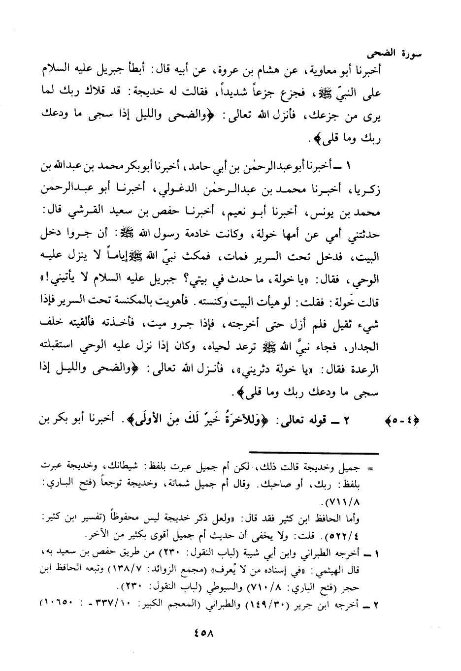 (¬1) - أَخْبَرَنَا أَبُو عَبْدِ الرَّحْمَنِ بْنُ أَبِي حَامِدٍ، أَخْبَرَنَا أَبُو بَكْرٍ مُحَمَّدُ بْنُ عَبْدِ اللَّهِ بْنِ زَكَرِيَّا، أَخْبَرَنَا مُحَمَّدُ بْنُ عَبْدِ الرحمن الدغولي، أخبرنا أَبُو عَبْدِ الرَّحْمَنِ مُحَمَّدُ بن يونس، أخبرنا أبو نعيم، أخبرنا حَفْصُ بْنُ سَعِيدٍ الْقُرَشِيُّ قَالَ: حَدَّثَتْنِي أُمِّي عَنْ أُمِّهَا خَوْلَةَ، وَكَانَتْ خَادِمَةَ رَسُولِ اللَّهِ - صَلَّى اللهُ عَلَيْهِ وَسَلَّمَ - أَنَّ جَرْوًا دَخَلَ الْبَيْتَ، فَدَخَلَ تَحْتَ السَّرِيرِ فَمَاتَ، فَمَكَثَ نَبِيُّ اللَّهِ - صَلَّى اللهُ عَلَيْهِ وَسَلَّمَ - أَيَّامًا لَا يَنْزِلُ عَلَيْهِ الْوَحْيُ، فَقَالَ: "يَا خَوْلَةُ، مَا حَدَثَ فِي بَيْتِي؟ جِبْرِيلُ عَلَيْهِ السَّلَامُ لَا يَأْتِينِي! " قَالَتْ خَوْلَةُ: فَقُلْتُ: لَوْ هَيَّأْتُ الْبَيْتَ وَكَنَسْتُهُ. فَأَهْوَيْتُ بِالْمِكْنَسَةِ تَحْتَ السَّرِيرِ فَإِذَا شَيْءٌ ثَقِيلٌ فَلَمْ أَزَلْ حَتَّى أَخْرَجْتُهُ، فَإِذَا جَرْوٌ مَيِّتٌ، فَأَخَذْتُهُ فَأَلْقَيْتُهُ خَلْفَ الْجِدَارِ، فَجَاءَ نَبِيُّ اللَّهِ - صَلَّى اللهُ عَلَيْهِ وَسَلَّمَ - تُرْعَدُ لَحْيَاهُ، وَكَانَ إِذَا نَزَلَ عَلَيْهِ الْوَحْيُ اسْتَقْبَلَتْهُ الرِّعْدَةُ فَقَالَ: "يَا خَوْلَةُ دَثِّرِينِي"، فَأَنْزَلَ اللَّهُ تَعَالَى: {وَالضُّحَى وَاللَّيْلِ إِذَا سَجَى مَا وَدَّعَكَ رَبُّكَ وَمَا قَلَى}