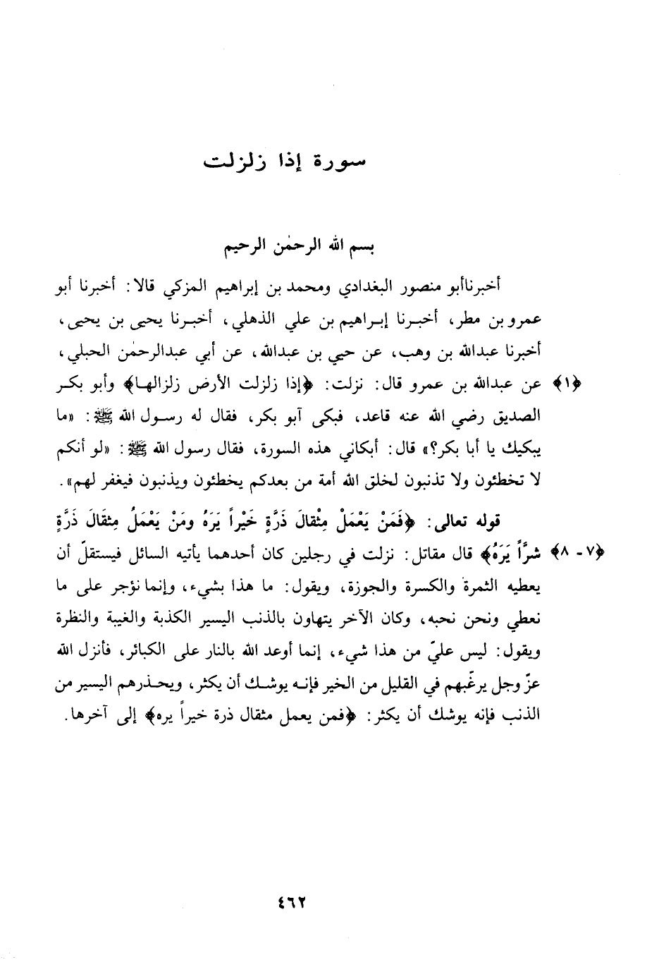 عَنْ عَبْدِ اللَّهِ بْنِ عَمْرٍو قَالَ؟ نَزَلَتْ: {إِذَا زُلْزِلَتِ الْأَرْضُ زِلْزَالَهَا} وَأَبُو بَكْرٍ الصِّدِّيقُ - رَضِيَ اللَّهُ عَنْهُ - قَاعِدٌ، فَبَكَى أَبُو بَكْرٍ، فَقَالَ لَهُ رَسُولُ اللَّهِ - صَلَّى اللهُ عَلَيْهِ وَسَلَّمَ - "مَا يُبْكِيكَ يَا أَبَا بَكْرٍ؟ " قَالَ: أَبْكَانِي هَذِهِ السُّورَةُ، فَقَالَ رَسُولُ اللَّهِ - صَلَّى اللهُ عَلَيْهِ وَسَلَّمَ - "لَوْ أَنَّكُمْ لَا تُخْطِئُونَ وَلَا تُذْنِبُونَ لَخَلَقَ اللَّهِ أُمَّةً مِنْ بَعْدِكُمْ يُخْطِئُونَ وَيُذْنِبُونَ فَيَغْفِرُ لَهُمْ ".