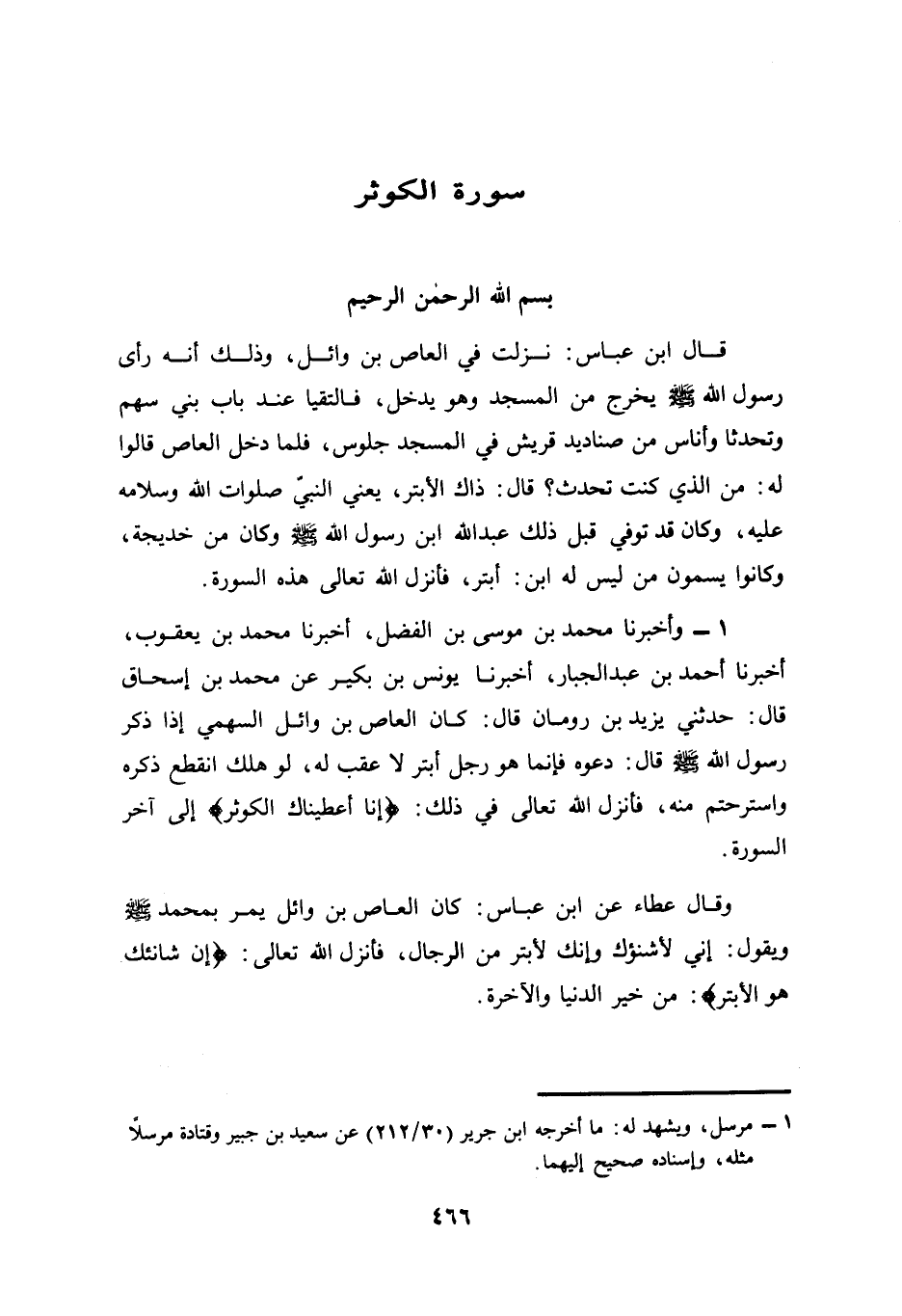 (¬1) - وأخبرنا مُحَمَّدُ بْنُ مُوسَى بن الفضل، أخبرنا مُحَمَّدُ بن يعقوب، أخبرنا أَحْمَدُ بْنُ عبد الجبار، أخبرنا يُونُسُ بْنُ بُكَيْرٍ عَنْ مُحَمَّدِ بْنِ إِسْحَاقَ قَالَ: حَدَّثَنِي يَزِيدُ بْنُ رُومَانَ قَالَ: كَانَ الْعَاصُ بْنُ وَائِلٍ السَّهْمِيُّ إِذَا ذُكِرَ رَسُولُ اللَّهِ - صَلَّى اللهُ عَلَيْهِ وَسَلَّمَ - قَالَ: دَعُوهُ فَإِنَّمَا هُوَ رَجُلٌ أَبْتَرُ لَا عَقِبَ لَهُ، لَوْ هَلَكَ انْقَطَعَ ذِكْرُهُ وَاسْتَرَحْتُمْ مِنْهُ، فَأَنْزَلَ اللَّهُ تَعَالَى فِي ذَلِكَ: {إِنَّا أَعْطَيْنَاكَ الْكَوْثَرَ} إِلَى آخِرِ السُّورَةِ.