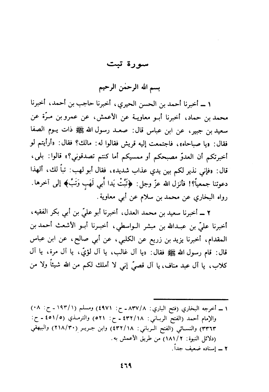(¬1) - أَخْبَرَنَا أَحْمَدُ بْنُ الْحَسَنِ الْحِيرِيُّ، أَخْبَرَنَا حَاجِبُ بن أحمد، أخبرنا مُحَمَّدُ بن حماد، أخبرنا أَبُو مُعَاوِيَةَ عَنِ الْأَعْمَشِ، عَنْ عَمْرِو بْنِ مُرَّةَ عَنْ سَعِيدِ بْنِ جُبَيْرٍ، عَنِ ابْنِ عَبَّاسٍ قَالَ: صَعِدَ رَسُولُ اللَّهِ - صَلَّى اللهُ عَلَيْهِ وَسَلَّمَ - ذَاتَ يَوْمٍ الصَّفَا فَقَالَ: "يَا صَبَاحَاهُ"، فَاجْتَمَعَتْ إِلَيْهِ قُرَيْشٌ فقالوا له: مالك؟ فَقَالَ: "أَرَأَيْتُمْ لَوْ أَخْبَرْتُكُمْ أَنَّ الْعَدُوَّ مُصَبِّحُكُمْ أَوْ مُمَسِّيكُمْ أَمَا كُنْتُمْ تُصَدِّقُونِي؟ " قَالُوا: بَلَى، قَالَ: "فَإِنِّي نَذِيرٌ لَكُمْ بَيْنَ يَدَيْ عَذَابٍ شَدِيدٍ"، فَقَالَ أَبُو لَهَبٍ: تَبًّا لَكَ، ألهذا دعوتنا جمعيا؟! فَأَنْزَلَ اللَّهُ - عَزَّ وَجَلَّ - {تَبَّتْ يَدَا أَبِي لَهَبٍ وَتَبَّ} إِلَى آخِرِهَا.