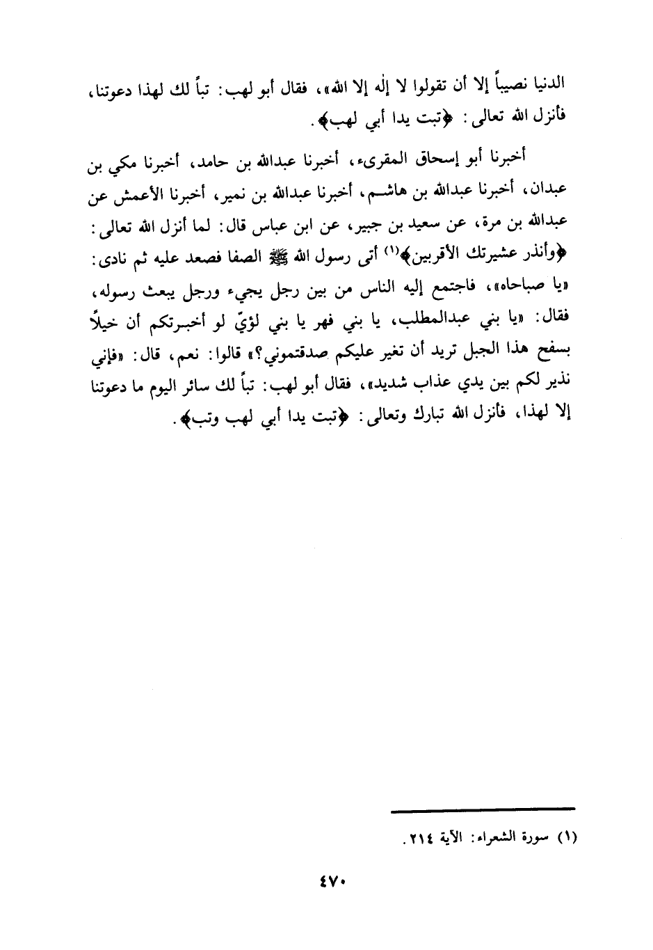 جُبَيْرٍ، عَنِ ابْنِ عَبَّاسٍ قَالَ: لَمَّا أَنْزَلَ اللَّهُ تَعَالَى: {وَأَنْذِرْ عَشِيرَتَكَ الْأَقْرَبِينَ} (¬1) أَتَى رَسُولُ اللَّهِ - صَلَّى اللهُ عَلَيْهِ وَسَلَّمَ - الصَّفَا فَصَعِدَ عَلَيْهِ ثُمَّ نَادَى: "يَا صَبَاحَاهُ"، فَاجْتَمَعَ إِلَيْهِ النَّاسُ مِنْ بَيْنِ رَجُلٍ يَجِيءُ وَرَجُلٍ يَبْعَثُ رَسُولَهُ، فَقَالَ: "يَا بَنِي عَبْدِ الْمُطَّلِبِ، يَا بَنِي فِهْرٍ يَا بَنِي لُؤَيٍّ لَوْ أَخْبَرْتُكُمْ أَنَّ خَيْلًا بسفح هذا الجيل تُرِيدُ أَنْ تُغِيرَ عَلَيْكُمْ صَدَّقْتُمُونِي؟ " قَالُوا: نَعَمْ، قَالَ: "فَإِنِّي نَذِيرٌ لَكُمْ بَيْنَ يَدَيْ عَذَابٍ شَدِيدٍ"، فَقَالَ أَبُو لَهَبٍ: تَبًّا لَكَ سَائِرَ الْيَوْمِ مَا دَعَوْتَنَا إِلَّا لِهَذَا، فَأَنْزَلَ اللَّهُ تَبَارَكَ وَتَعَالَى: {تَبَّتْ يَدَا أَبِي لَهَبٍ وَتَبَّ}