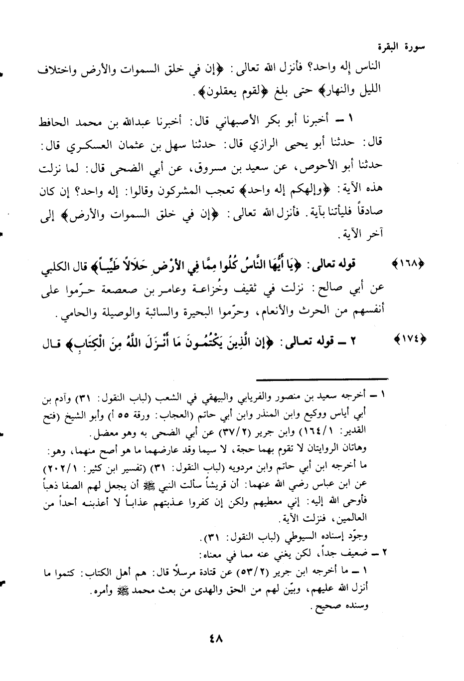 (¬1) - أَخْبَرَنَا أَبُو بكر الأصبهاني قال: أَخْبَرَنَا عَبْدُ اللَّهِ بْنُ محمد الحافظ قال: حَدَّثَنَا أَبُو يحيى الرازي قال: حَدَّثَنَا سَهْلُ بْنُ عثمان العسكري قال: حَدَّثَنَا أَبُو الْأَحْوَصِ عَنْ سَعِيدِ بْنِ مَسْرُوقٍ عَنْ أَبِي الضُّحَى قَالَ: لَمَّا نَزَلَتْ هَذِهِ الْآيَةُ: {وَإِلَهُكُمْ إِلَهٌ وَاحِدٌ} تَعَجَّبَ الْمُشْرِكُونَ وَقَالُوا: إِلَهٌ وَاحِدٌ؟ إِنْ كَانَ صَادِقًا فَلْيَأْتِنَا بِآيَةٍ. فَأَنْزَلَ اللَّهُ تَعَالَى: {إِنَّ فِي خَلْقِ السَّمَاوَاتِ وَالْأَرْضِ} إِلَى آخِرِ الْآيَةِ.