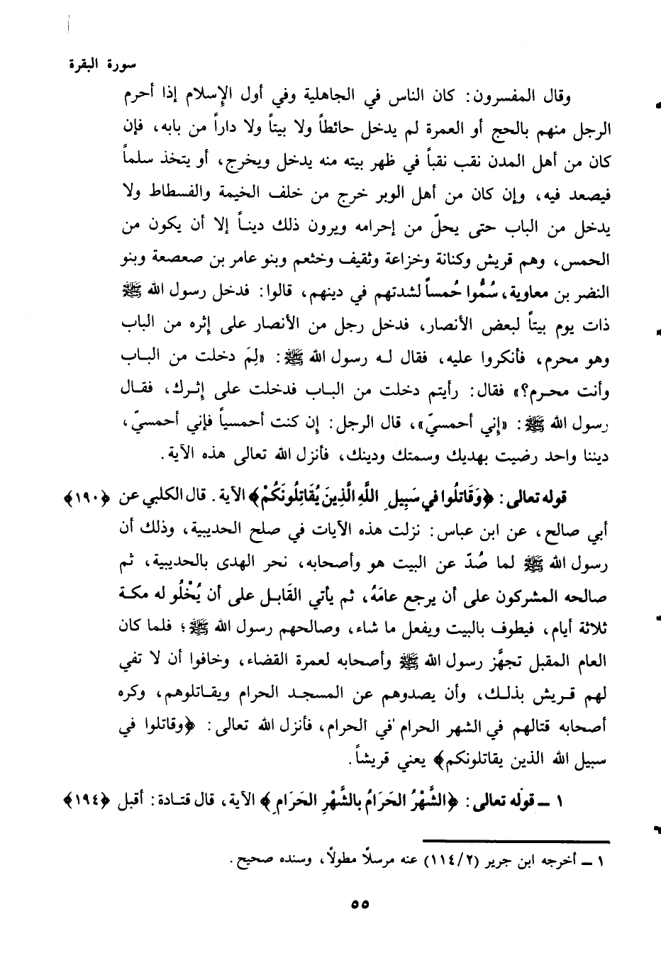 قَالَ الْكَلْبِيُّ عَنْ أَبِي صَالِحٍ، عَنِ ابْنِ عَبَّاسٍ: نَزَلَتْ هَذِهِ الْآيَاتُ فِي صُلْحِ الْحُدَيْبِيَةِ، وَذَلِكَ أَنَّ رَسُولَ اللَّهِ - صَلَّى اللهُ عَلَيْهِ وَسَلَّمَ - لَمَّا صُدَّ عَنِ الْبَيْتِ هُوَ وَأَصْحَابُهُ، نَحَرَ الْهَدْيَ بِالْحُدَيْبِيَةِ، ثُمَّ صَالَحَهُ الْمُشْرِكُونَ عَلَى أَنْ يَرْجِعَ عَامَهُ، ثُمَّ يَأْتِي الْقَابِلَ عَلَى أَنْ يُخْلُوا لَهُ مَكَّةَ ثَلَاثَةَ أَيَّامٍ، فَيَطُوفُ بِالْبَيْتِ ويفعل ما شاء، وَصَالَحَهُمْ رَسُولُ اللَّهِ صَلَّى اللهُ عَلَيْهِ وَسَلَّمَ؛ فَلَمَّا كَانَ الْعَامُ الْمُقْبِلُ تَجَهَّزَ رَسُولُ اللَّهِ - صَلَّى اللهُ عَلَيْهِ وَسَلَّمَ - وَأَصْحَابُهُ لِعُمْرَةِ الْقَضَاءِ، وَخَافُوا أَنْ لَا تَفِيَ لَهُمْ قُرَيْشٌ بِذَلِكَ، وَأَنْ يَصُدُّوهُمْ عَنِ الْمَسْجِدِ الْحَرَامِ وَيُقَاتِلُوهُمْ، وَكَرِهَ أَصْحَابُهُ قِتَالَهُمْ فِي الشَّهْرِ الحرام، في الْحَرَامِ فَأَنْزَلَ اللَّهُ تَعَالَى: {وَقَاتِلُوا فِي سَبِيلِ اللَّهِ الَّذِينَ يُقَاتِلُونَكُمْ} يَعْنِي قُرَيْشًا.