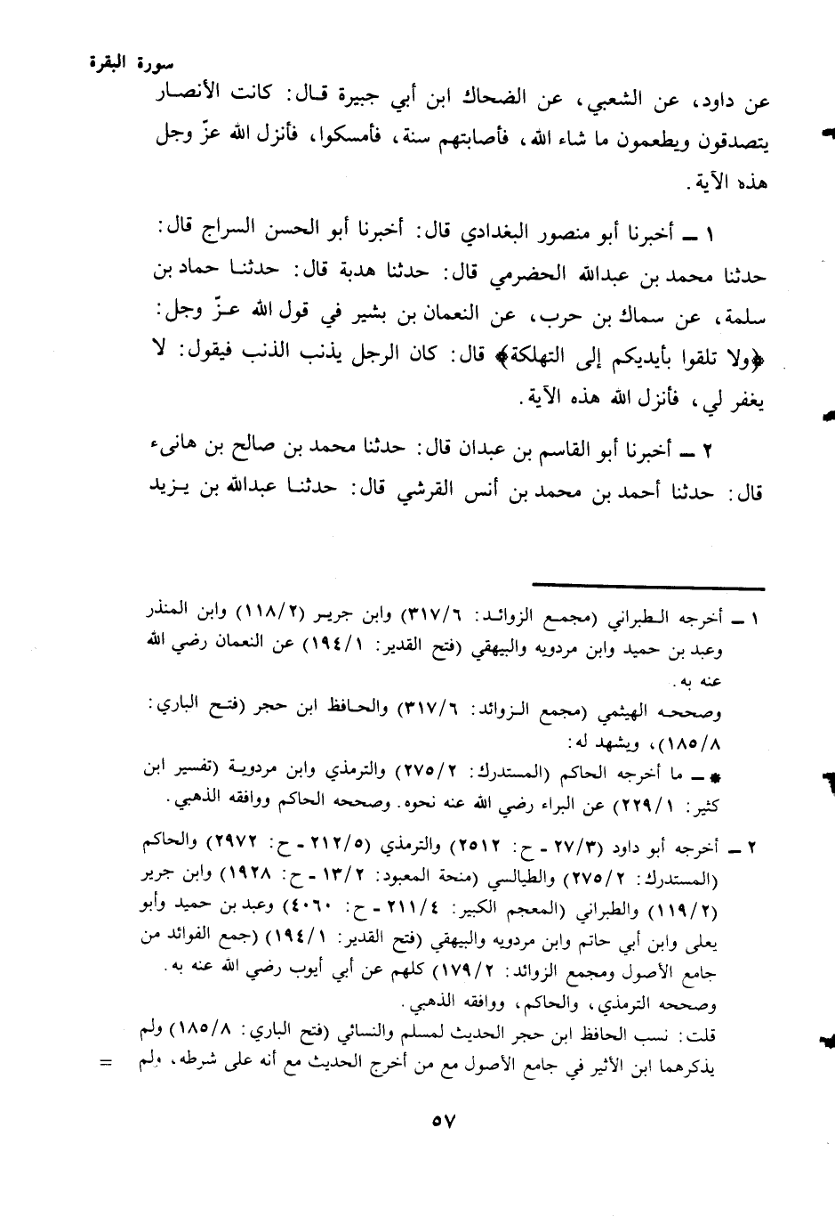 (¬1) - أَخْبَرَنَا أَبُو منصور البغدادي قال: أَخْبَرَنَا أَبُو الحسن السراج قال: حَدَّثَنَا مُحَمَّدُ بْنُ عَبْدِ الله الحضرمي قال: حدثنا هدبة قال: حَدَّثَنَا حَمَّادُ بْنُ سَلَمَةَ، عَنْ سِمَاكِ بْنِ حَرْبٍ، عَنِ النُّعْمَانِ بْنِ بَشِيرٍ فِي قَوْلِ اللَّهِ - عَزَّ وَجَلَّ - {وَلَا تُلْقُوا بِأَيْدِيكُمْ إِلَى التَّهْلُكَةِ} قَالَ: كَانَ الرَّجُلُ يُذْنِبُ الذَّنْبَ فَيَقُولُ: لَا يُغْفَرُ لِي، فَأَنْزَلَ اللَّهُ هَذِهِ الْآيَةَ.