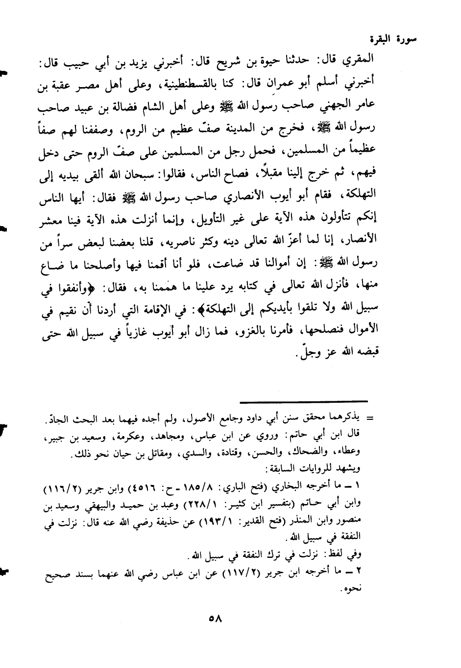 المقري قال: حَدَّثَنَا حَيْوَةُ بن شريح قال: أَخْبَرَنِي يَزِيدُ بْنُ أَبِي حبيب قال: أَخْبَرَنِي أَسْلَمُ أَبُو عِمْرَانَ قَالَ: كُنَّا بِالْقُسْطَنْطِينِيَّةِ، وَعَلَى أَهْلِ مِصْرَ عُقْبَةُ بْنُ عَامِرٍ الْجُهَنِيُّ صَاحِبُ رَسُولِ اللَّهِ - صَلَّى اللهُ عَلَيْهِ وَسَلَّمَ - وَعَلَى أَهْلِ الشَّامِ فَضَالَةُ بْنُ عُبَيْدٍ صَاحِبُ رَسُولِ اللَّهِ - صَلَّى اللهُ عَلَيْهِ وَسَلَّمَ - فَخَرَجَ مِنَ الْمَدِينَةِ صَفٌّ عَظِيمٌ مِنَ الرُّومِ، وَصَفَفْنَا لَهُمْ صَفًّا عَظِيمًا مِنَ الْمُسْلِمِينَ، فَحَمَلَ رَجُلٌ مِنَ الْمُسْلِمِينَ عَلَى صَفِّ الرُّومِ حَتَّى دَخَلَ فِيهِمْ، ثُمَّ خَرَجَ إِلَيْنَا مُقْبِلًا، فَصَاحَ النَّاسُ، فَقَالُوا: سُبْحَانَ اللَّهِ أَلْقَى بِيَدَيْهِ إِلَى التَّهْلُكَةِ، فَقَامَ أَبُو أَيُّوبَ الْأَنْصَارِيُّ صَاحِبُ رَسُولِ اللَّهِ - صَلَّى اللهُ عَلَيْهِ وَسَلَّمَ - فَقَالَ: أَيُّهَا النَّاسُ إِنَّكُمْ تَتَأَوَّلُونَ هَذِهِ الْآيَةَ عَلَى غَيْرِ التَّأْوِيلِ، وَإِنَّمَا أُنْزِلَتْ هَذِهِ الْآيَةُ فِينَا مَعْشَرَ الْأَنْصَارِ، إِنَّا لَمَّا أَعَزَّ اللَّهُ تَعَالَى دينه وكثر ناصروه، قُلْنَا بَعْضُنَا لِبَعْضٍ سِرًّا مِنْ رَسُولِ اللَّهِ - صَلَّى اللهُ عَلَيْهِ وَسَلَّمَ - إِنَّ أَمْوَالَنَا قَدْ ضَاعَتْ، فَلَوْ أَنَّا أَقَمْنَا فِيهَا وَأَصْلَحْنَا مَا ضَاعَ مِنْهَا، فَأَنْزَلَ اللَّهُ تَعَالَى فِي كِتَابِهِ يَرُدُّ عَلَيْنَا مَا هَمَمْنَا بِهِ، فَقَالَ: {وَأَنْفِقُوا فِي سَبِيلِ اللَّهِ وَلَا تُلْقُوا بِأَيْدِيكُمْ إِلَى التَّهْلُكَةِ} فِي الْإِقَامَةِ الَّتِي أَرَدْنَا أَنْ