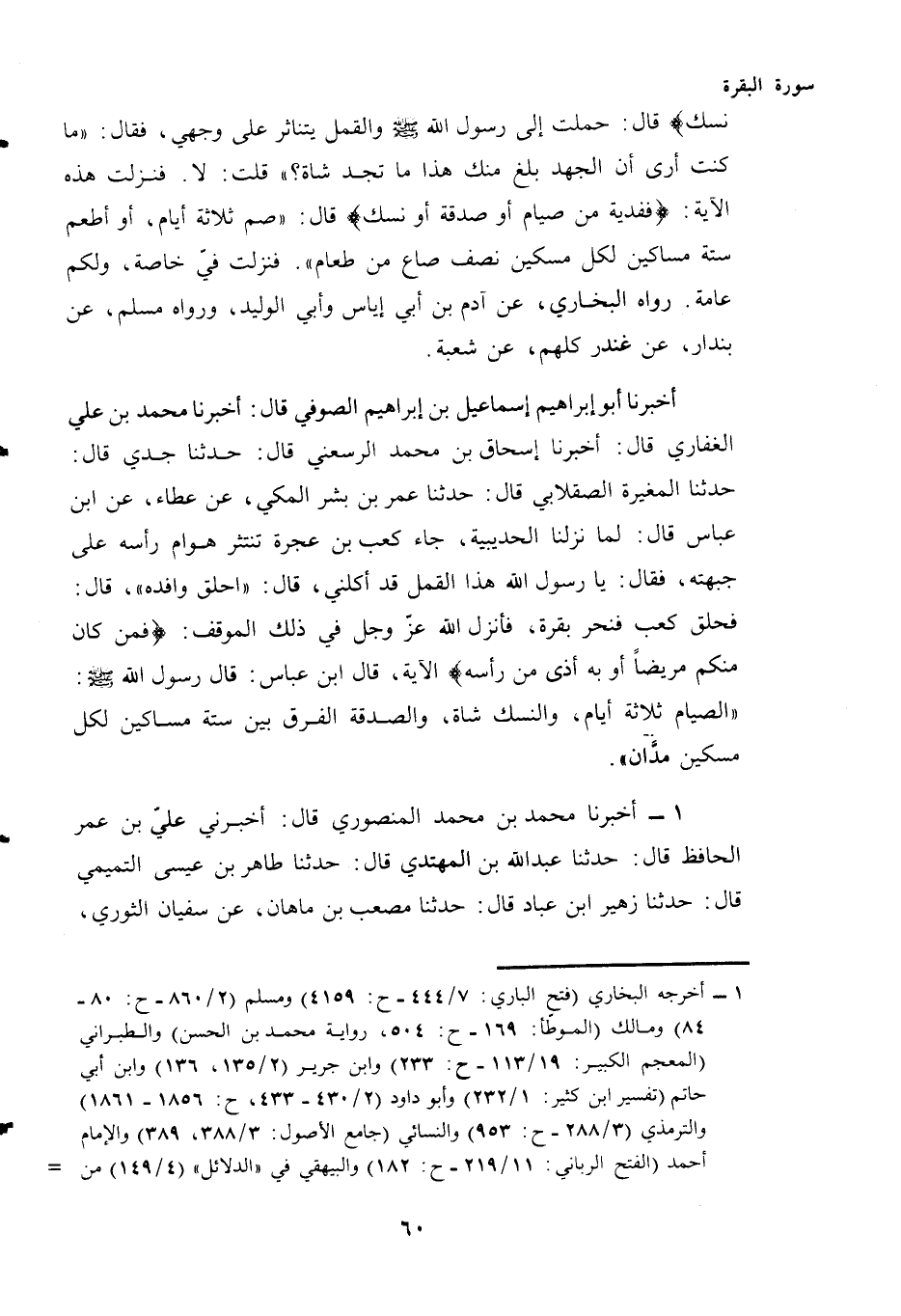 أَخْبَرَنَا أَبُو إِبْرَاهِيمَ إِسْمَاعِيلُ بْنُ إبراهيم الصوفي قال: أَخْبَرَنَا مُحَمَّدُ بْنُ علي الغفاري قال: أَخْبَرَنَا إِسْحَاقُ بْنُ محمد الرسعني قال: حَدَّثَنَا جدي قال: حدثنا المغيرة الصقلابي قال: حَدَّثَنَا عُمَرُ بْنُ بِشْرٍ الْمَكِّيُّ، عَنْ عَطَاءٍ، عَنِ ابْنِ عَبَّاسٍ قَالَ: لَمَّا نَزَلْنَا الْحُدَيْبِيَةَ، جَاءَ كَعْبُ بن عجرة تنتثر هَوَامُّ رَأْسِهِ عَلَى جَبْهَتِهِ فَقَالَ: يَا رَسُولَ اللَّهِ هَذَا الْقَمْلُ قَدْ أَكَلَنِي، قَالَ: "احْلِقْ وَافْدِهِ" قَالَ: فَحَلَقَ كَعْبٌ فَنَحَرَ بَقَرَةً، فَأَنْزَلَ اللَّهُ - عَزَّ وَجَلَّ - فِي ذَلِكَ الْمَوْقِفِ: {فَمَنْ كَانَ مِنْكُمْ مَرِيضًا أَوْ بِهِ أَذًى مِنْ رَأْسِهِ} الْآيَةَ، قَالَ ابْنُ عَبَّاسٍ: قَالَ رَسُولُ اللَّهِ - صَلَّى اللهُ عَلَيْهِ وَسَلَّمَ - "الصِّيَامُ ثَلَاثَةُ أَيَّامٍ، وَالنُّسُكُ شَاةٌ، وَالصَّدَقَةُ الْفَرْقُ بَيْنَ سِتَّةِ مَسَاكِينَ لِكُلِّ مِسْكِينٍ مُدَّانِ".