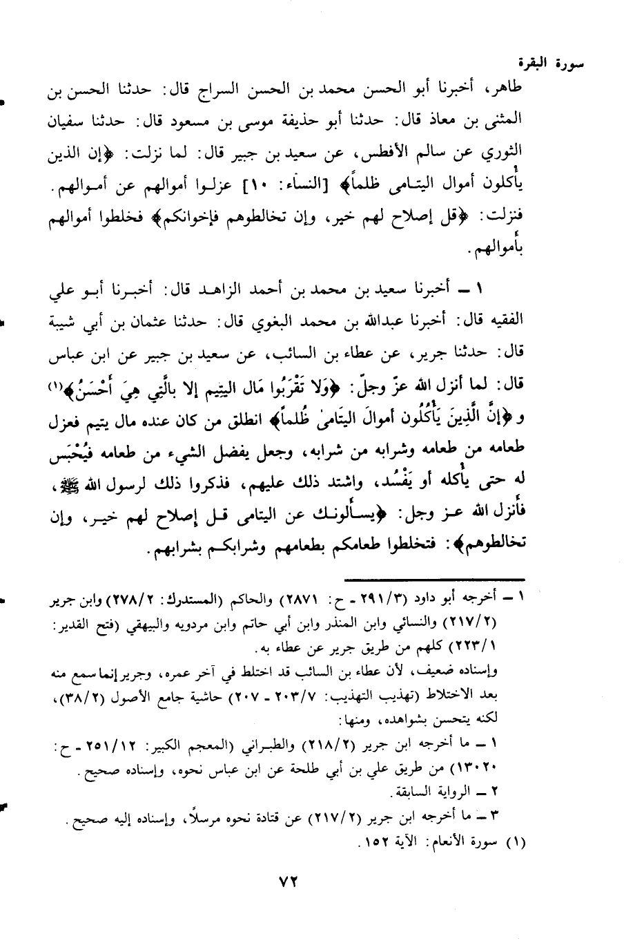 طَاهِرٍ أَخْبَرَنَا أَبُو الْحَسَنِ مُحَمَّدُ بْنُ الحسن السراج قال: حَدَّثَنَا الْحَسَنُ بْنُ الْمُثَنَّى بن معاذ قال: حَدَّثَنَا أَبُو حُذَيْفَةَ مُوسَى بْنُ مسعود قال: حَدَّثَنَا سُفْيَانُ الثَّوْرِيُّ عَنْ سَالِمٍ الْأَفْطَسِ، عَنْ سَعِيدِ بْنِ جُبَيْرٍ قَالَ: لَمَّا نَزَلَتْ: {إِنَّ الَّذِينَ يَأْكُلُونَ أَمْوَالَ الْيَتَامَى ظلْمًا} [النساء: 10] عَزَلُوا أَمْوَالَهُمْ عَنْ أَمْوَالِهِمْ. فَنَزَلَتْ: {قُلْ