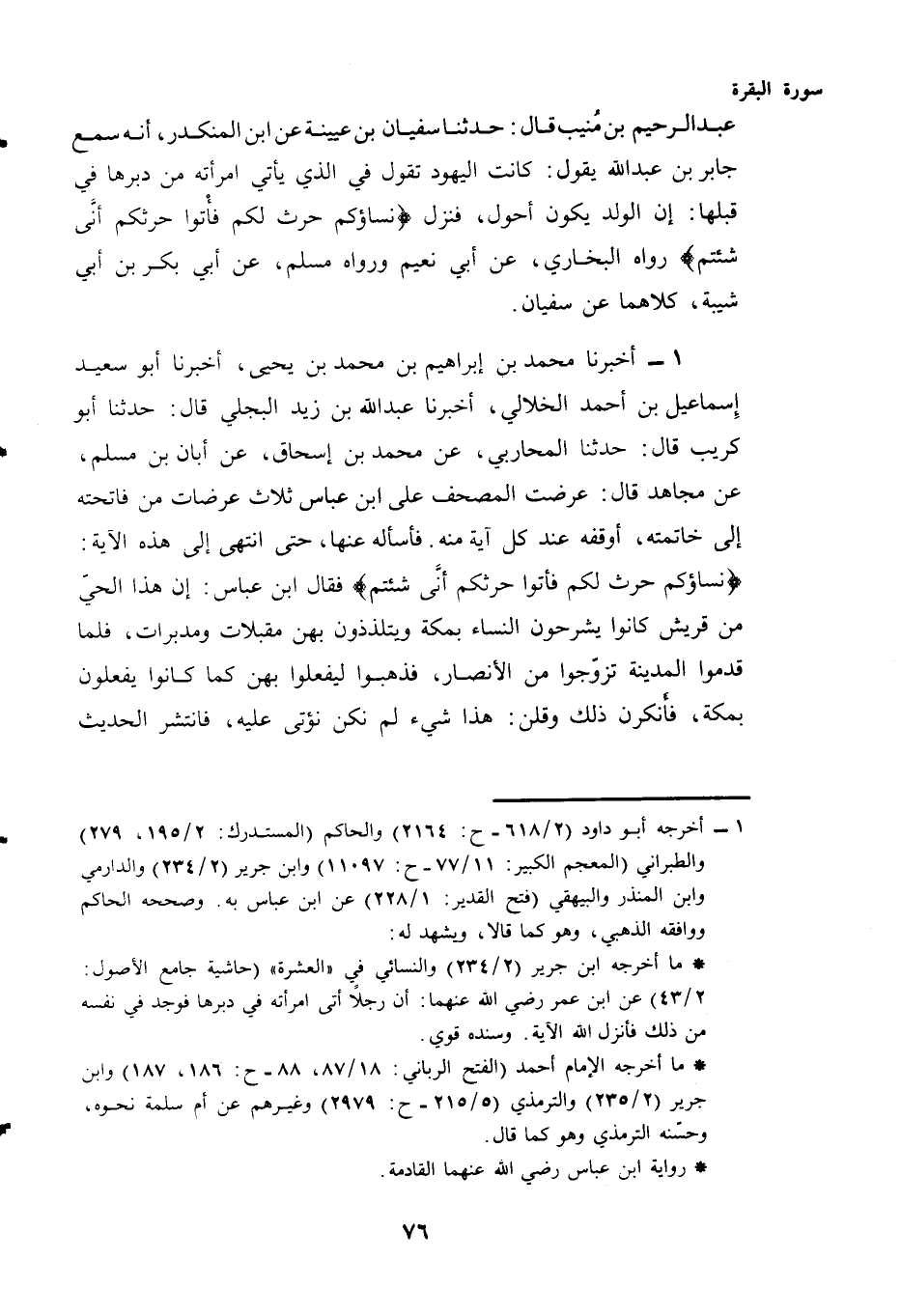 عَبْدُ الرَّحِيمِ بن منيب قال: حَدَّثَنَا سُفْيَانُ بْنُ عُيَيْنَةَ عَنِ ابْنِ الْمُنْكَدِرِ، أَنَّهُ سَمِعَ جَابِرَ بْنَ عَبْدِ اللَّهِ يَقُولُ: كَانَتِ الْيَهُودُ تَقُولُ فِي الَّذِي يَأْتِي امْرَأَتَهُ مِنْ دُبُرِهَا فِي قُبُلِهَا: إِنَّ الْوَلَدَ يَكُونُ أَحْوَلَ، فَنَزَلَ {نِسَاؤُكُمْ حَرْثٌ لَكُمْ فَأْتُوا حَرْثَكُمْ أَنَّى شِئْتُمْ} رَوَاهُ الْبُخَارِيُّ، عَنْ أَبِي نُعَيْمٍ، وَرَوَاهُ مُسْلِمٌ، عَنْ أَبِي بَكْرِ بْنِ أَبِي شَيْبَةَ، كِلَاهُمَا عَنْ سُفْيَانَ.