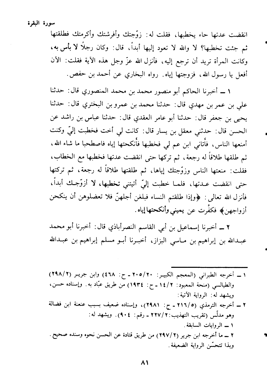 (¬1) - أَخْبَرَنَا الْحَاكِمُ أَبُو مَنْصُورٍ مُحَمَّدُ بْنُ محمد المنصوري قال: حَدَّثَنَا عَلِيُّ بْنُ عُمَرَ بن مهدي قال: حَدَّثَنَا مُحَمَّدُ بْنُ عَمْرِو بْنِ البختري قال: حَدَّثَنَا يَحْيَى بْنُ جعفر قال: حَدَّثَنَا أَبُو عَامِرٍ العقدي قال: حدثنا عباس بْنُ رَاشِدٍ عَنِ الْحَسَنِ قَالَ: حَدَّثَنِي مَعْقِلُ بْنُ يَسَارٍ قَالَ: كَانَتْ لِي أُخْتٌ فَخُطِبَتْ إِلَيَّ وَكُنْتُ أَمْنَعُهَا النَّاسَ، فَأَتَانِي ابْنُ عَمٍّ لِي فَخَطَبَهَا فأَنكحتها إياه فاصطحبا مَا شَاءَ اللَّهُ، ثُمَّ طَلَّقَهَا طَلَاقًا لَهُ رَجْعَةٌ، ثُمَّ تَرَكَهَا حَتَّى انْقَضَتْ عِدَّتُهَا فَخَطَبَهَا مَعَ الْخُطَّابِ، فَقُلْتُ: مَنَعْتُهَا النَّاسَ وَزَوَّجْتُكَ إِيَّاهَا، ثُمَّ طَلَّقْتَهَا طَلَاقًا لَهُ رَجْعَةٌ، ثُمَّ تَرَكْتَهَا حَتَّى انْقَضَتْ عِدَّتُهَا، فَلَمَّا خُطِبَتْ إِلَيَّ أَتَيْتَنِي تَخْطُبُهَا، لَا أُزَوِّجُكَ أَبَدًا فَأَنْزَلَ اللَّهُ تَعَالَى: {وَإِذَا طَلَّقْتُمُ النِّسَاءَ فَبَلَغْنَ أَجَلَهُنَّ فَلَا تَعْضُلُوهُنَّ أَنْ يَنْكِحْنَ أَزْوَاجَهُنَّ} فَكَفَّرْتُ عَنْ يَمِينِي وَأَنْكَحْتُهَا إِيَّاهُ.