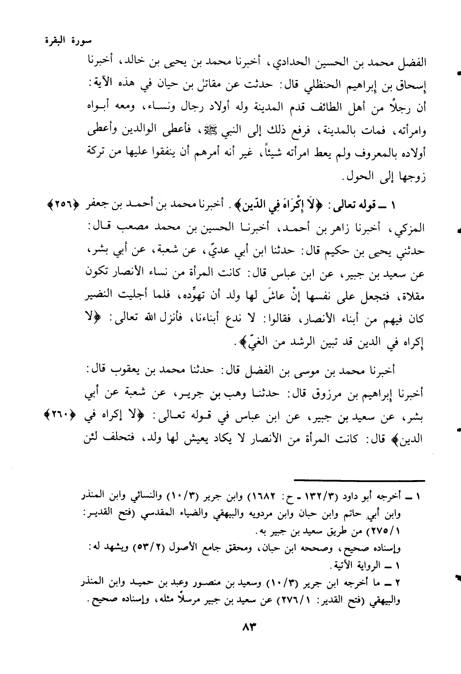 أَخْبَرَنَا مُحَمَّدُ بْنُ مُوسَى بن الفضل فال: حَدَّثَنَا مُحَمَّدُ بن يعقوب قال: أخبرنا إِبْرَاهِيمُ بن مرزوق قال: حَدَّثَنَا وَهْبُ بْنُ جَرِيرٍ عَنْ شُعْبَةَ عَنْ أَبِي بِشْرٍ عَنْ سَعِيدِ بْنِ جُبَيْرٍ عَنِ ابْنِ عَبَّاسٍ فِي قَوْلِهِ تَعَالَى: {لَا إِكْرَاهَ فِي الدِّينِ} قَالَ: كَانَتِ الْمَرْأَةُ مِنَ الْأَنْصَارِ لَا يَكَادُ يَعِيشُ لَهَا وَلَدٌ فَتَحْلِفُ لَئِنْ