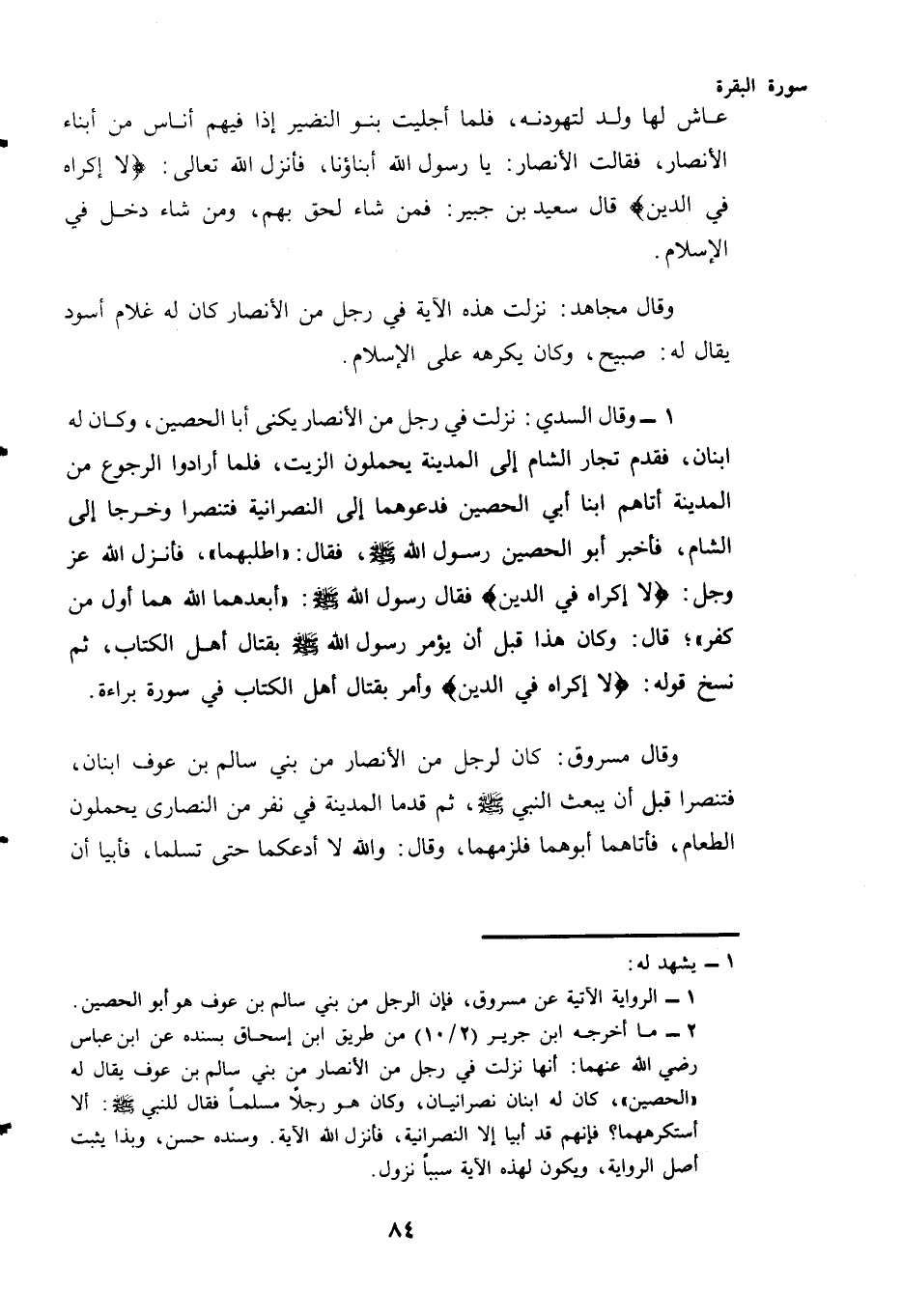 (¬1) - وَقَالَ السُّدِّيُّ: نَزَلَتْ فِي رَجُلٍ مِنَ الْأَنْصَارِ يُكْنَى أَبَا الْحُصَيْنِ، وَكَانَ لَهُ ابْنَانِ، فَقَدِمَ تُجَّارُ الشَّامِ إِلَى الْمَدِينَةِ يَحْمِلُونَ الزَّيْتَ، فَلَمَّا أَرَادُوا الرُّجُوعَ مِنَ الْمَدِينَةِ أَتَاهُمُ ابْنَا أَبِي الْحُصَيْنِ فَدَعَوْهُمَا إِلَى النَّصْرَانِيَّةِ فَتَنَصَّرَا وَخَرَجَا إِلَى الشَّامِ فَأَخْبَرَ أَبُو الْحُصَيْنِ رَسُولَ اللَّهِ - صَلَّى اللهُ عَلَيْهِ وَسَلَّمَ - فَقَالَ: "اطْلُبْهُمَا" فَأَنْزَلَ اللَّهُ - عَزَّ وَجَلَّ - {لَا إِكْرَاهَ فِي الدِّينِ} فَقَالَ رَسُولُ اللَّهِ - صَلَّى اللهُ عَلَيْهِ وَسَلَّمَ - "أَبْعَدَهُمَا اللَّهُ هُمَا أَوَّلُ من كفر"؛ قال: وَكَانَ هَذَا قَبْلَ أَنْ يُؤْمَرَ رَسُولُ اللَّهِ - صَلَّى اللهُ عَلَيْهِ وَسَلَّمَ - بِقِتَالِ أَهْلِ الْكِتَابِ ثُمَّ نُسِخَ قَوْلُهُ: {لَا إِكْرَاهَ فِي الدِّينِ} وَأُمِرَ بِقِتَالِ أَهْلِ الْكِتَابِ فِي سُورَةِ بَرَاءَةٌ. وَقَالَ مَسْرُوقٌ: كَانَ لِرَجُلٍ مِنَ الْأَنْصَارِ مِنْ بَنِي سَالِمِ بْنِ عَوْفٍ ابْنَانِ فَتَنَصَّرَا قَبْلَ أَنْ يُبْعَثَ النَّبِيُّ - صَلَّى اللهُ عَلَيْهِ وَسَلَّمَ - ثُمَّ قَدِمَا الْمَدِينَةَ فِي نَفَرٍ مِنَ النَّصَارَى يَحْمِلُونَ الطَّعَامَ فَأَتَاهُمَا أَبُوهُمَا فَلَزِمَهُمَا وَقَالَ: وَاللَّهِ لَا أَدَعُكُمَا حَتَّى تُسْلِمَا فَأَبَيَا أَنْ