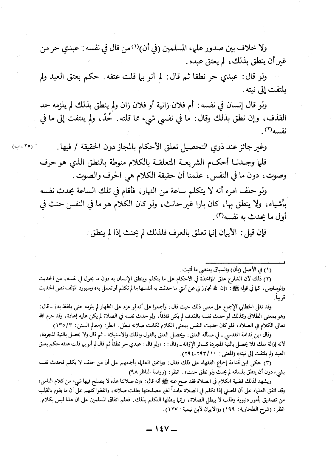 ولا خلاف أيضاً في أن الأمة ممنوعون من الإحداث في الدين ومعلوم أن القائل بما ثبت من طريق النقل الصحيح عن الرسول صلى الله عليه وسلم، لا يسمى محدثاً بل يسمى سنّياً متبعاً، وأن من قال في نفسه قولا وزعم أنه مقتضى عقله، وأنّ الحديث المخالف له لا ينبغي أن يلتفت إليه، لكونه من أخبار الآحاد وهي لا توجب علماً وعقله موجب للعلم، يستحقّ أن يسمى محدثاً مبتدعاً، مخالفاً، ومن كان له أدنى تحصيل أمكنه أن يفرق بيننا وبين مخالفينا / بتأمل هذا الفصل في أوّل وهله (ويعلم) 2 أن أهل السنّة نحن دونهم وأنّ المبتدعة خصومنا دوننا. وبالله التوفيق هـ.