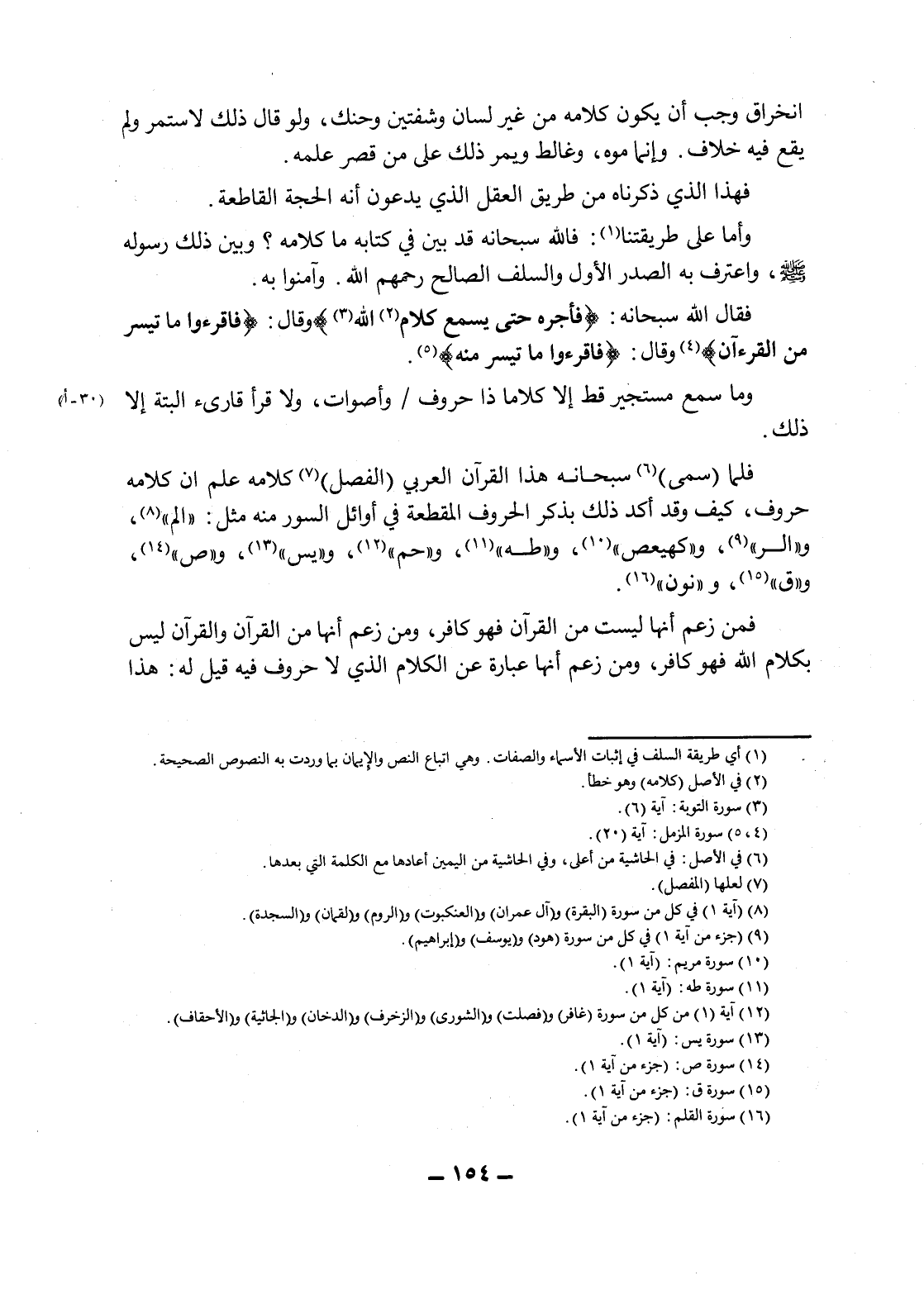 وقال أبو محمّد بن كلاب ومن وافقه، والأشعري وغيرهم: "القرآن غير مخلوق، ومن قال بخلقه كافر إلا أن الله لا يتكلم بالعربية، ولا بغيرها من اللغات ولا يدخل كلامه النظم، والتأليف، والتعاقب، ولا يكون حرفاً ولا صوتاً "1.