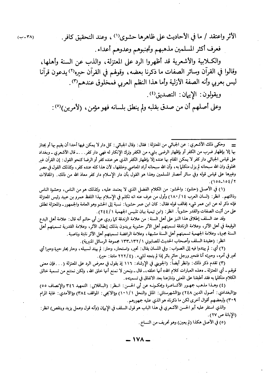 وقال ابن عبد البر: "أهل السنة مجمعون على الإِقرار بالصفات الواردة كلها في القرآن والسنة والإيمان بها، وحملها على الحقيقة لا على المجاز إلا أنهم لا يكيفون شيئاً من ذلك ولا يحدون فيه صفة محصورة، وأما أهل البدع والجهمية والمعتزلة كلها والخوارج فكلهم ينكرها ولا يحمل شيئاً منها على الحقيقة، ويزعمون أنّ من أقر بها مشبه، وهم عند من أثبتها نافون للمعبود، والحق فيما قاله القائلون بما نطق به كتاب الله وسنة رسوله وهم أئمة الجماعة والحمد لله ". التمهيد: "7/ 145" فتدبر هذا الكلام فإن عليه من الله برهان.