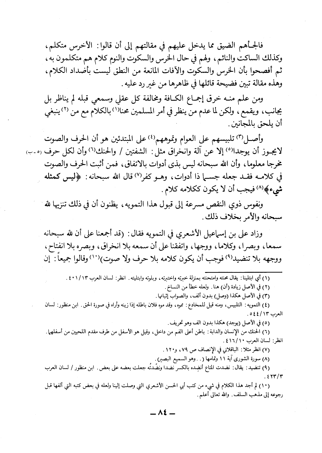 السلف، وهو يتضمن مناقشة جادة لهم، وبياناً لتنكبهم سبيل السلف في كثير من أبواب ومسائل الاعتقاد.