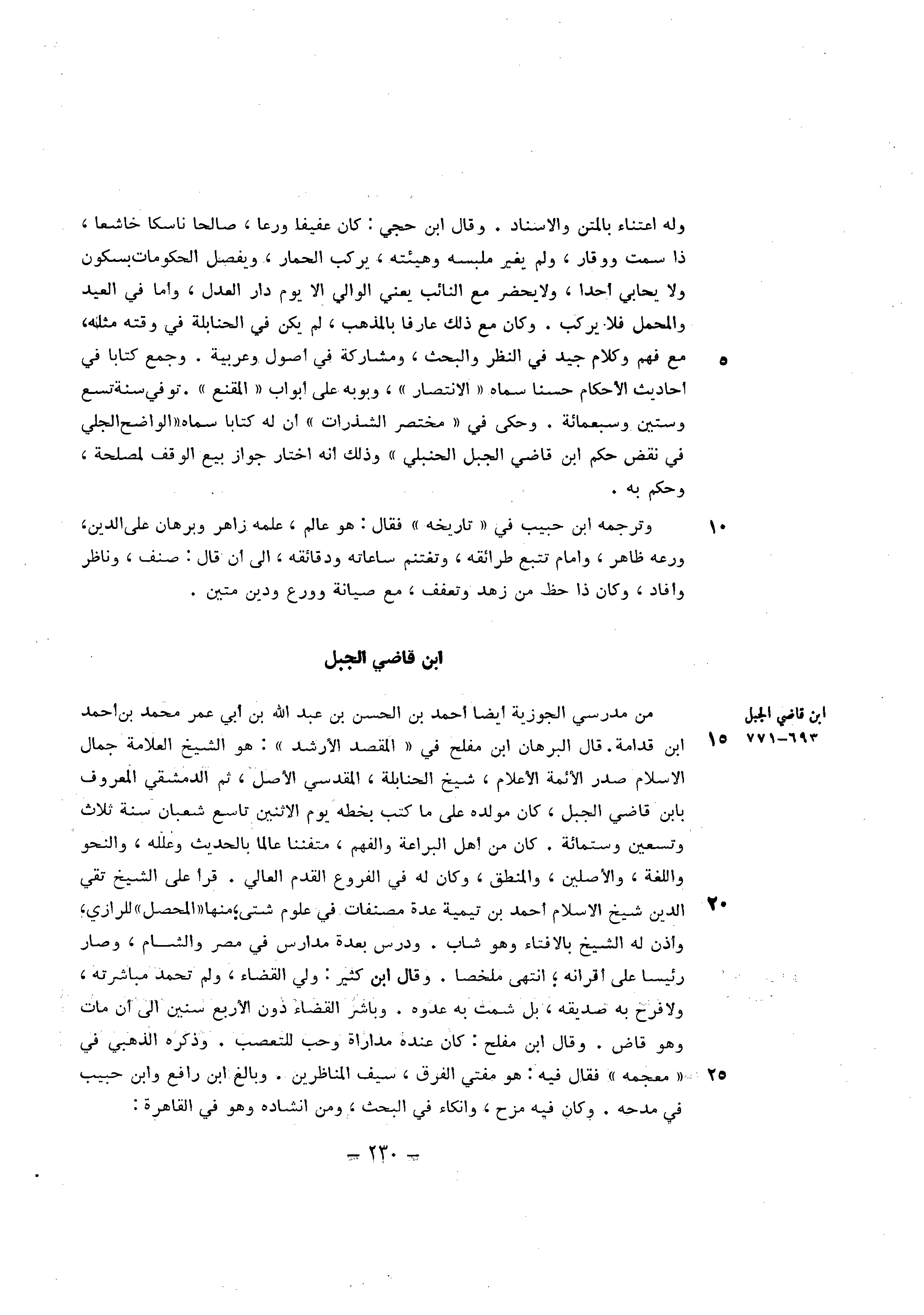 من مدرسي الجوزية أَيْضا أَحْمد بن الْحسن بن عبد الله بن أبي عمر مُحَمَّد بن أَحْمد ابْن قدامَة قَالَ الْبُرْهَان ابْن مُفْلِح فِي الْمَقْصد الأرشد هُوَ الشَّيْخ الْعَلامَة جمال الْإِسْلَام صدر الْأَئِمَّة الْأَعْلَام شيخ الْحَنَابِلَة الْمَقْدِسِي الأَصْل ثمَّ الدِّمَشْقِي الْمَعْرُوف بِابْن قَاضِي الْجَبَل كَانَ مولده على مَا كتب بِخَطِّهِ يَوْم الِاثْنَيْنِ تَاسِع شعْبَان سنة ثَلَاث وَتِسْعين وسِتمِائَة كَانَ من أهل البراعة والفهم متفننا عَالما بِالْحَدِيثِ وَعلله والنحو واللغة والأصلين والمنطق وَكَانَ لَهُ فِي الْفُرُوع الْقدَم العالي قَرَأَ على الشَّيْخ تَقِيّ الدّين شيخ الاسلام أَحْمد بن تَيْمِية عدَّة مصنفات فِي عُلُوم شَتَّى مِنْهَا المحصل للرازي وَأذن لَهُ الشَّيْخ بالإفتاء وَهُوَ شَاب ودرس بعدة مدارس فِي مصر وَالشَّام وَصَارَ رَئِيسا على أقرانه انْتهى مُلَخصا وَقَالَ ابْن كثير ولي الْقَضَاء وَلم تحمد مُبَاشَرَته ولافرح بِهِ صديقه بل شمت بِهِ عدوه وباشر الْقَضَاء دون الْأَرْبَع سِنِين إِلَى أَن مَاتَ وَهُوَ قَاض وَقَالَ ابْن مُفْلِح كَانَ عِنْده مداراة وَحب للتعصب وَذكره الذَّهَبِيّ فِي مُعْجَمه فَقَالَ فِيهِ هُوَ مفتي الْفرق سيف المناظرين وَبَالغ ابْن رَافع وَابْن حبيب فِي مدحه وَكَانَ فِيهِ مزح وانكاء فِي الْبَحْث وَمن إنشاده وَهُوَ فِي الْقَاهِرَة