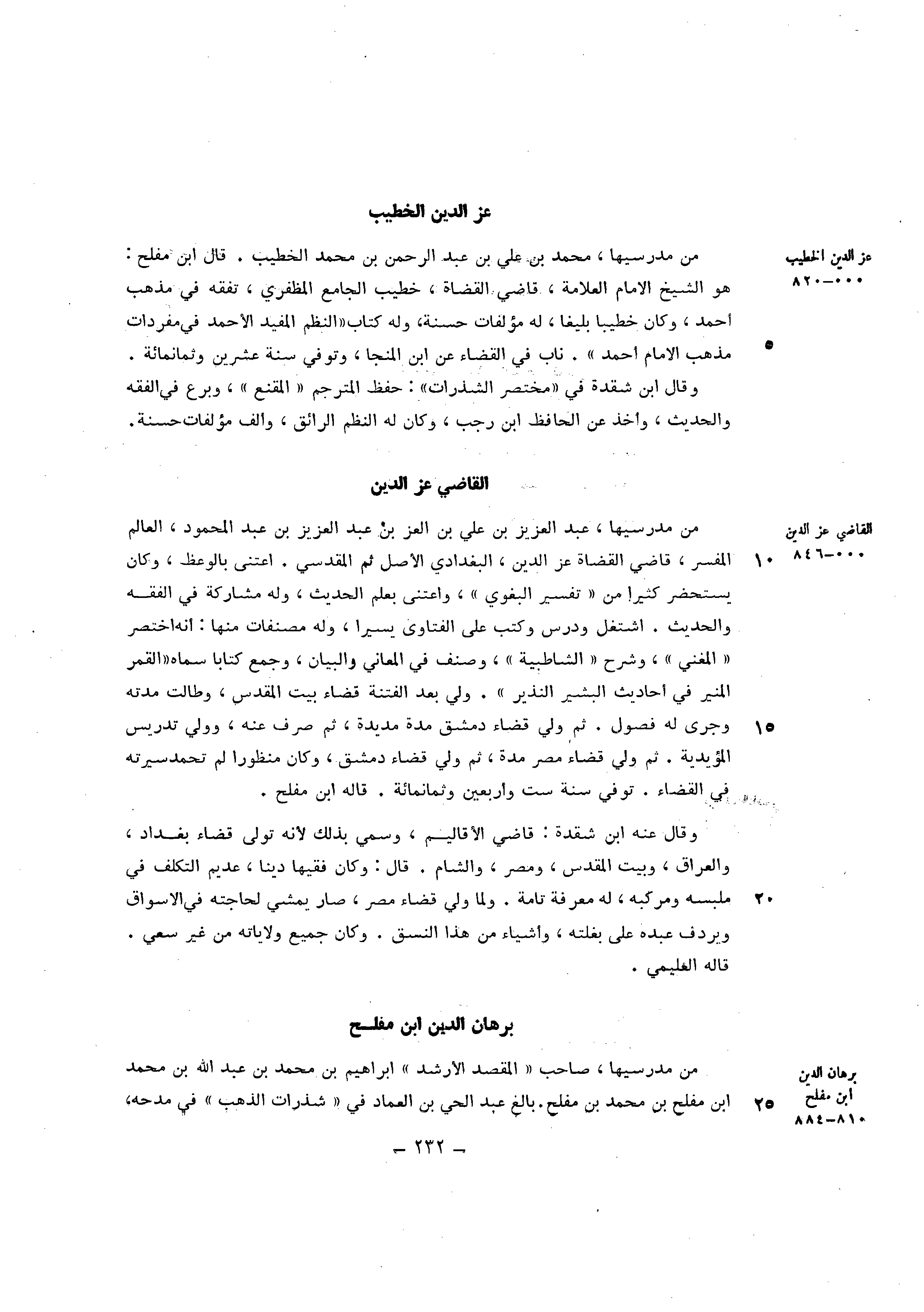 من مدرسيها عبد الْعَزِيز بن عَليّ بن الْعِزّ بن عبد الْعَزِيز بن عبد الْمَحْمُود الْعَالم الْمُفَسّر قَاضِي القضاه عز الدّين الْبَغْدَادِيّ الأَصْل ثمَّ الْمَقْدِسِي اعتنى بالوعظ وَكَانَ يستحضر كثيرا من تَفْسِير الْبَغَوِيّ واعتنى بِعلم الحَدِيث وَله مُشَاركَة فِي الْفِقْه والْحَدِيث اشْتغل ودرس وَكتب على الْفَتَاوَى يَسِيرا وَله مصنفات مِنْهَا انه اختصر الْمُغنِي وَشرح الشاطبية وصنف فِي الْمعَانِي وَالْبَيَان وَجمع كتابا سَمَّاهُ الْقَمَر الْمُنِير فِي أَحَادِيث البشير النذير ولي بعد الْفِتْنَة قَضَاء بَيت الْمُقَدّس وطالت مدَّته وَجرى لَهُ فُصُول ثمَّ ولي قَضَاء دمشق مُدَّة مديدة ثمَّ صرف عَنهُ وَولي تدريس المؤيدية ثمَّ ولي قَضَاء مصر مُدَّة ثمَّ ولي قَضَاء دمشق وَكَانَ منظورا لم تحمد سيرته فِي الْقَضَاء توفّي سنة سِتّ وَأَرْبَعين وَثَمَانمِائَة قَالَه ابْن مُفْلِح