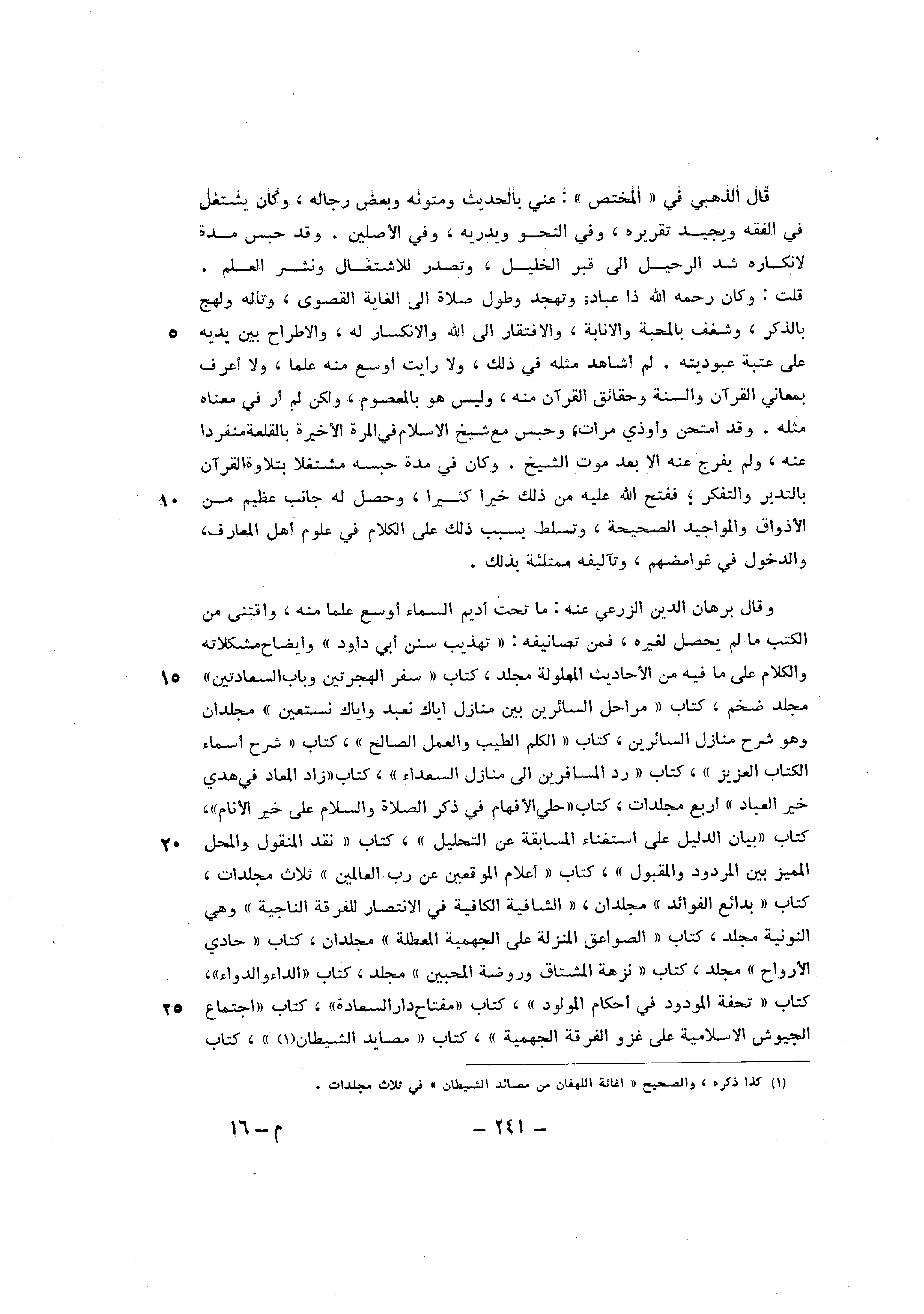 وَقَالَ برهَان الدّين الزرعي عَنهُ مَا تَحت أَدِيم السَّمَاء اوسع علما مِنْهُ وأقتنى من الْكتب مَا لم يحصل لغيره فَمن تصانيفه تَهْذِيب سنَن أبي دَاوُد وإيضاح مشكلاته وَالْكَلَام على مَا فِيهِ من الْأَحَادِيث المعلولة مُجَلد كتاب سفر الهجرتين وَبَاب السعادتين مُجَلد ضخم كتاب مراحل السائرين بَين منَازِل إياك نعْبد وَإِيَّاك نستعين مجلدان وَهُوَ شرح منَازِل السائرين كتاب الْكَلم الطّيب وَالْعَمَل الصَّالح كتاب شرح أَسمَاء الْكتاب الْعَزِيز كتاب رد الْمُسَافِرين الى منَازِل السُّعَدَاء كتاب زَاد الْمعَاد فِي هدي خير الْعباد أَربع مجلدات كتاب حلي الأفهام فِي ذكر الصَّلَاة وَالسَّلَام على خير الْأَنَام كتاب بَيَان الدَّلِيل على اسْتغْنَاء الْمُسَابقَة عَن التَّحْلِيل كتاب نقد الْمَنْقُول وَالْمحل الْمُمَيز بَين الْمَرْدُود والمقبول كتاب أَعْلَام الموقعين عَن رب الْعَالمين ثَلَاث مجلدات كتاب بَدَائِع الْفَوَائِد مجلدان الشافية الكافية فِي الِانْتِصَار للفرقة النَّاجِية وَهِي النونية مُجَلد كتاب الصَّوَاعِق الْمنزلَة على الْجَهْمِية المعطلة مجلدان كتاب حادي الْأَرْوَاح مُجَلد كتاب نزهة المشتاق وروضة المحبين مُجَلد كتاب الدَّاء والدواء كتاب تحفة المودود فِي أَحْكَام الْمَوْلُود كتاب مِفْتَاح دَار السَّعَادَة كتاب اجْتِمَاع الجيوش الاسلامية على غَزْو الْفرْقَة الْجَهْمِية كتاب مصايد الشَّيْطَان كتاب