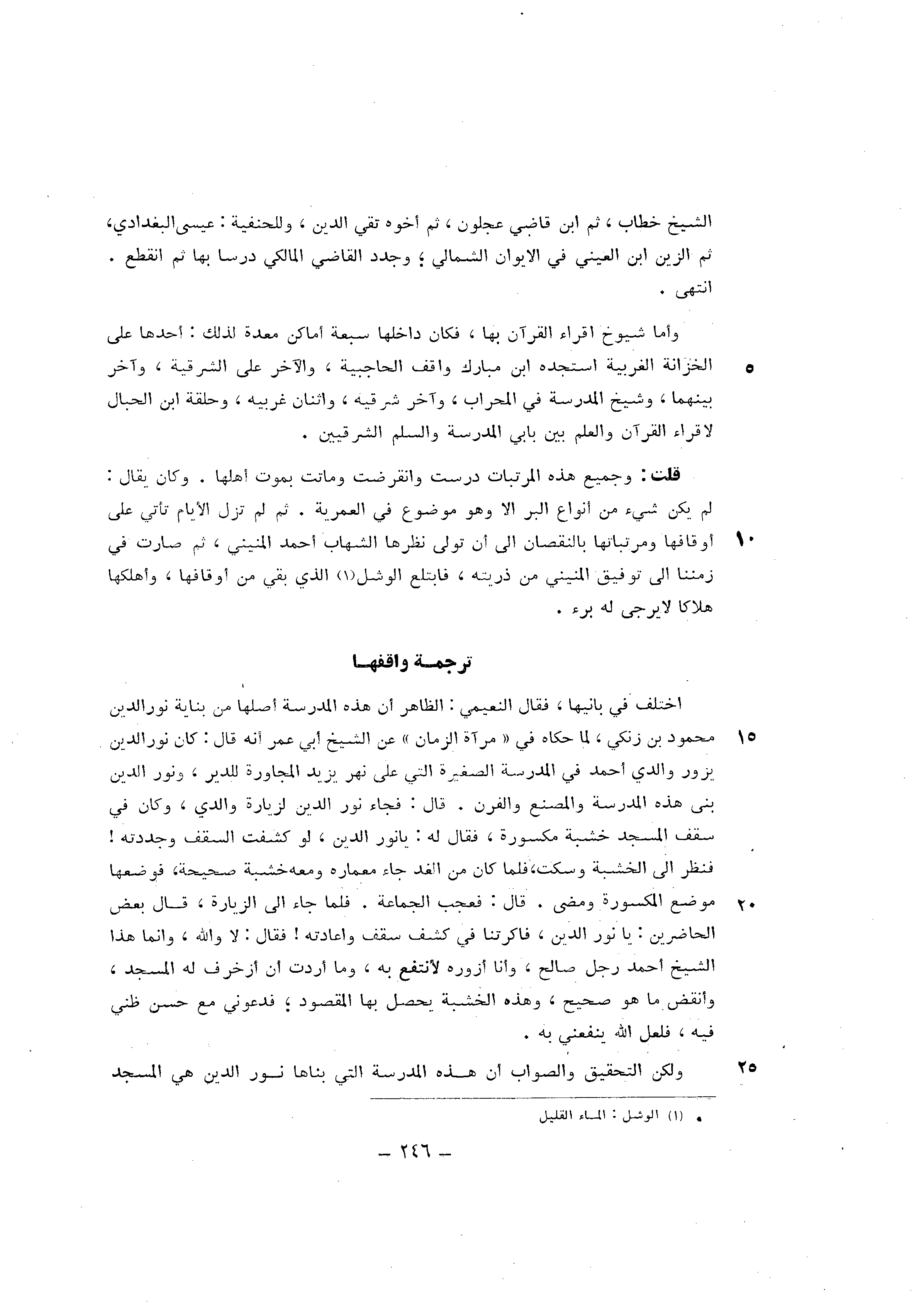 وَلَكِن التَّحْقِيق وَالصَّوَاب ان هَذِه الْمدرسَة الَّتِي بناها نور الدّين هِيَ الْمَسْجِد