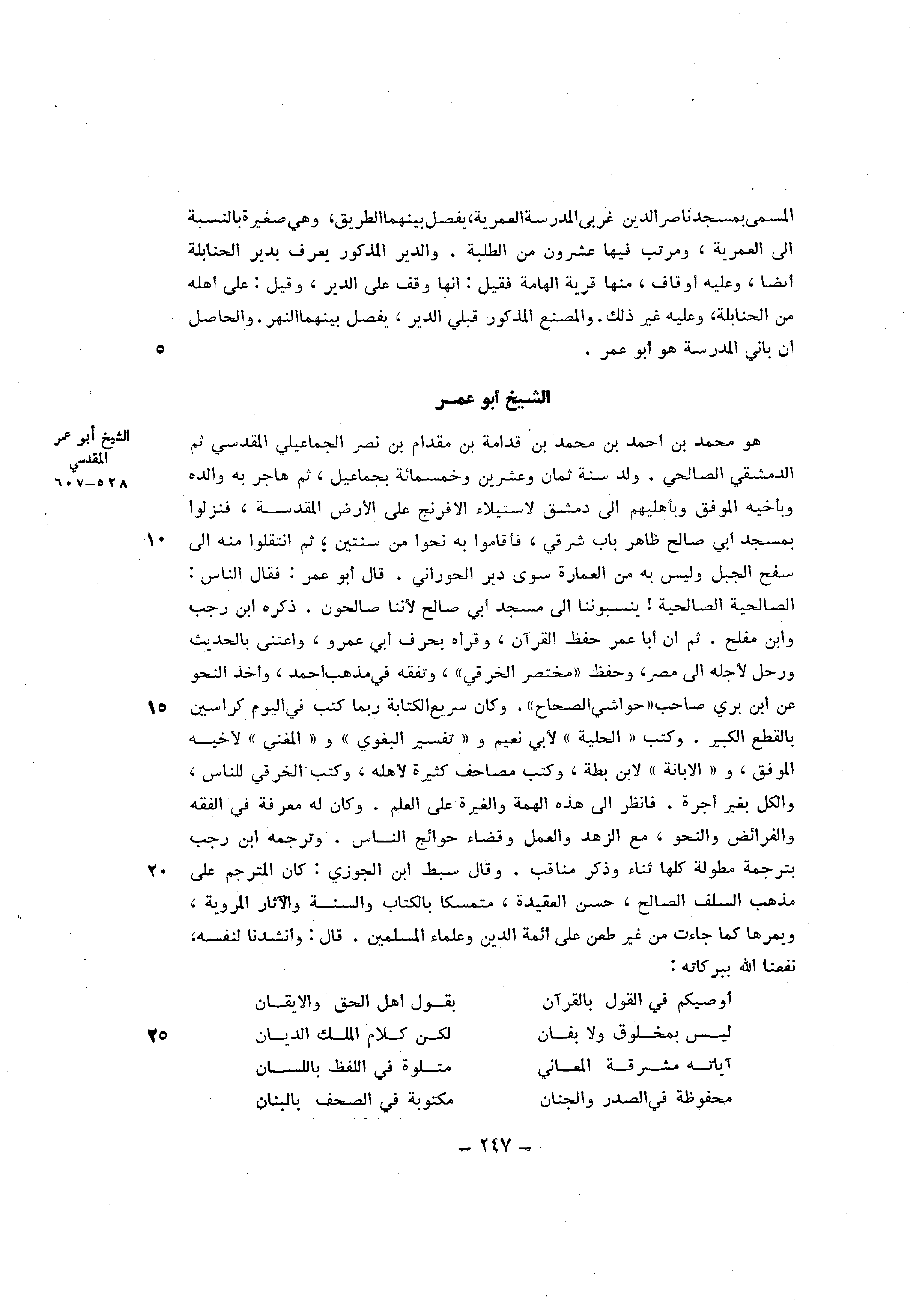 هُوَ مُحَمَّد بن أَحْمد بن مُحَمَّد بن قدامَة بن مِقْدَام بن نصر الجماعيلي الْمَقْدِسِي ثمَّ الدِّمَشْقِي الصَّالِحِي ولد سنة ثَمَان وَعشْرين وَخَمْسمِائة بجماعيل ثمَّ هَاجر بِهِ وَالِده وبأخيه الْمُوفق وبأهليهم الى دمشق لاستيلاء الافرنج على الأَرْض المقدسة فنزلوا بِمَسْجِد ابي صَالح ظَاهر بَاب شَرْقي فأقاموا بِهِ نَحوا من سنتَيْن ثمَّ انتقلوا مِنْهُ الى سفح الْجَبَل وَلَيْسَ بِهِ من الْعِمَارَة سوى دير الحوراني قَالَ ابو عمر فَقَالَ النَّاس الصالحية الصالحية ينسبوننا الى مَسْجِد ابي صَالح لأننا صَالِحُونَ ذكره ابْن رَجَب وَابْن مُفْلِح ثمَّ أَن ابا عمر حفظ الْقُرْآن وقرأه بِحرف ابي عَمْرو واعتنى بِالْحَدِيثِ ورحل لأَجله الى مصر وَحفظ مُخْتَصر الْخرقِيّ وتفقه فِي مَذْهَب احْمَد وَأخذ النَّحْو عَن ابْن بري صَاحب حَوَاشِي الصِّحَاح وَكَانَ سريع الْكِتَابَة رُبمَا كتب فِي الْيَوْم كراسين بِالْقطعِ الْكَبِير وَكتب الْحِلْية لابي نعيم وَتَفْسِير الْبَغَوِيّ وَالْمُغني لِأَخِيهِ الْمُوفق والابانة لِابْنِ بطة وَكتب مصاحف كَثِيرَة لأَهله وَكتب الْخرقِيّ للنَّاس وَالْكل بِغَيْر أُجْرَة فَانْظُر الى هَذِه الهمة والغيرة على الْعلم وَكَانَ لَهُ معرفَة فِي الْفِقْه والفرائض والنحو مَعَ الزّهْد وَالْعَمَل وَقَضَاء حوائج النَّاس وترجمه ابْن رَجَب بترجمة مُطَوَّلَة كلهَا ثَنَاء وَذكر مَنَاقِب وَقَالَ سبط ابْن الْجَوْزِيّ كَانَ المترجم على مَذْهَب السّلف الصَّالح حسن العقيدة متمسكا بِالْكتاب وَالسّنة والْآثَار المروية ويمرها كَمَا جَاءَت من غير طعن على أَئِمَّة الدّين وعلماء الْمُسلمين قَالَ وأنشدنا لنَفسِهِ نفعنا الله ببركاته