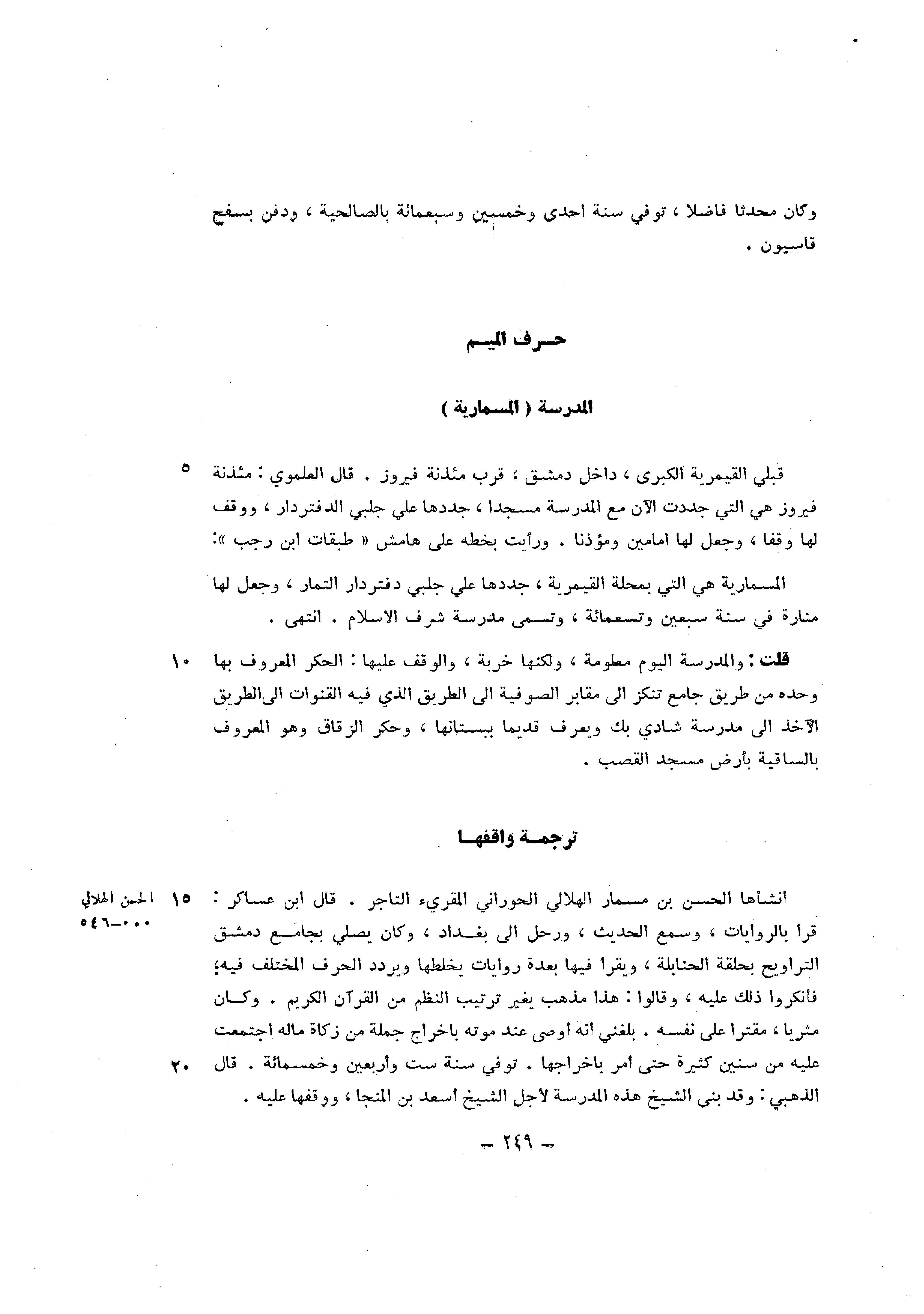 قبلي القيمرية الْكُبْرَى دَاخل دمشق قرب مئذنة فَيْرُوز قَالَ العلموي مئذنة فَيْرُوز هِيَ الَّتِي جددت الْآن مَعَ الْمدرسَة مَسْجِدا جددها عَليّ جلبي الدفتردار ووقف لَهَا وَقفا وَجعل لَهَا أمامين ومؤذنا وَرَأَيْت بِخَطِّهِ على هَامِش طَبَقَات ابْن رَجَب