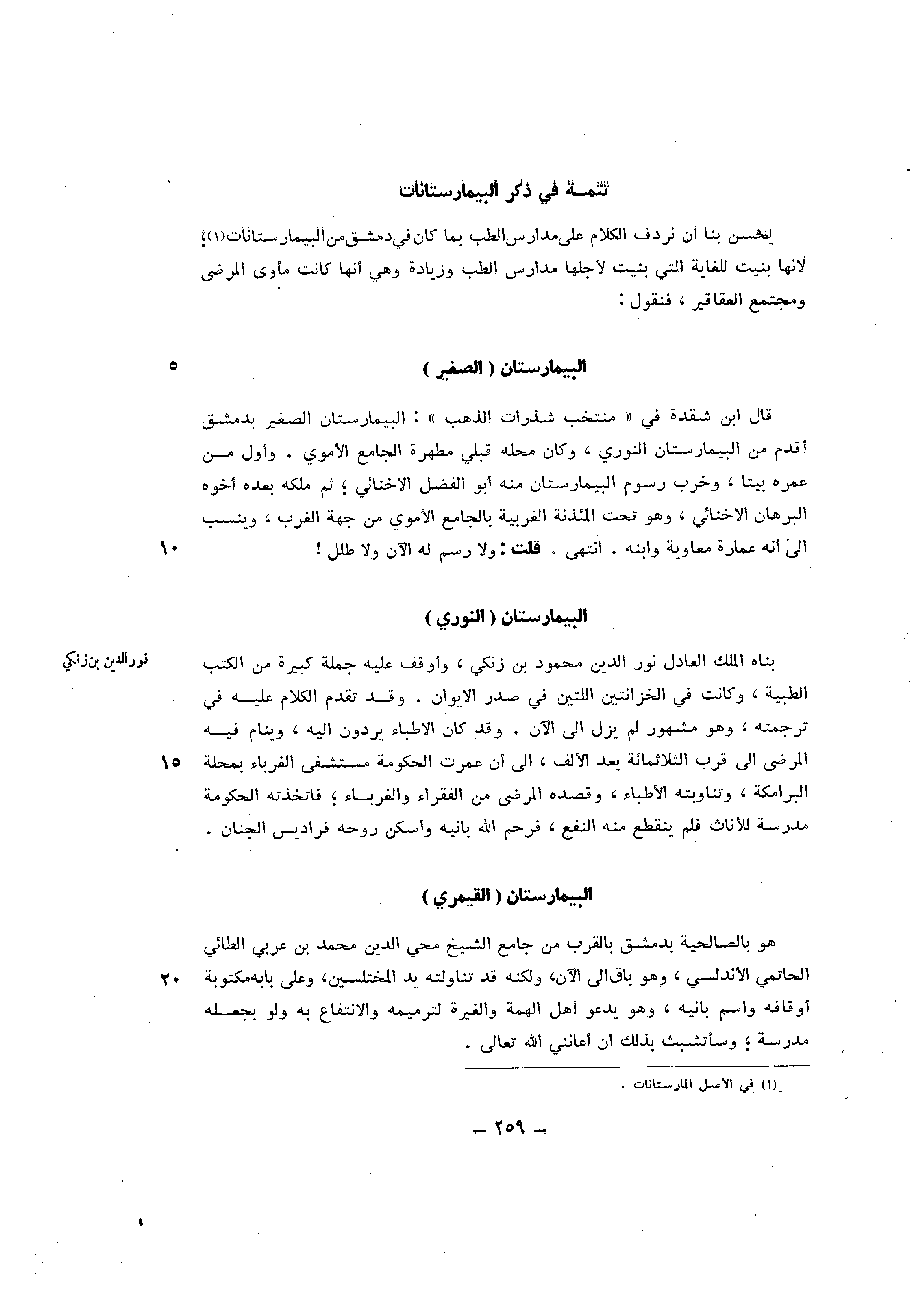 يحسن بِنَا أَن نردف الْكَلَام على مدارس الطِّبّ بِمَا كَانَ فِي دمشق من البيمارستانات لِأَنَّهَا بنيت للغاية الَّتِي بنيت لأَجلهَا مدارس الطِّبّ وَزِيَادَة وَهِي أَنَّهَا كَانَت مأوى المرضى ومجتمع العقاقير فَنَقُول