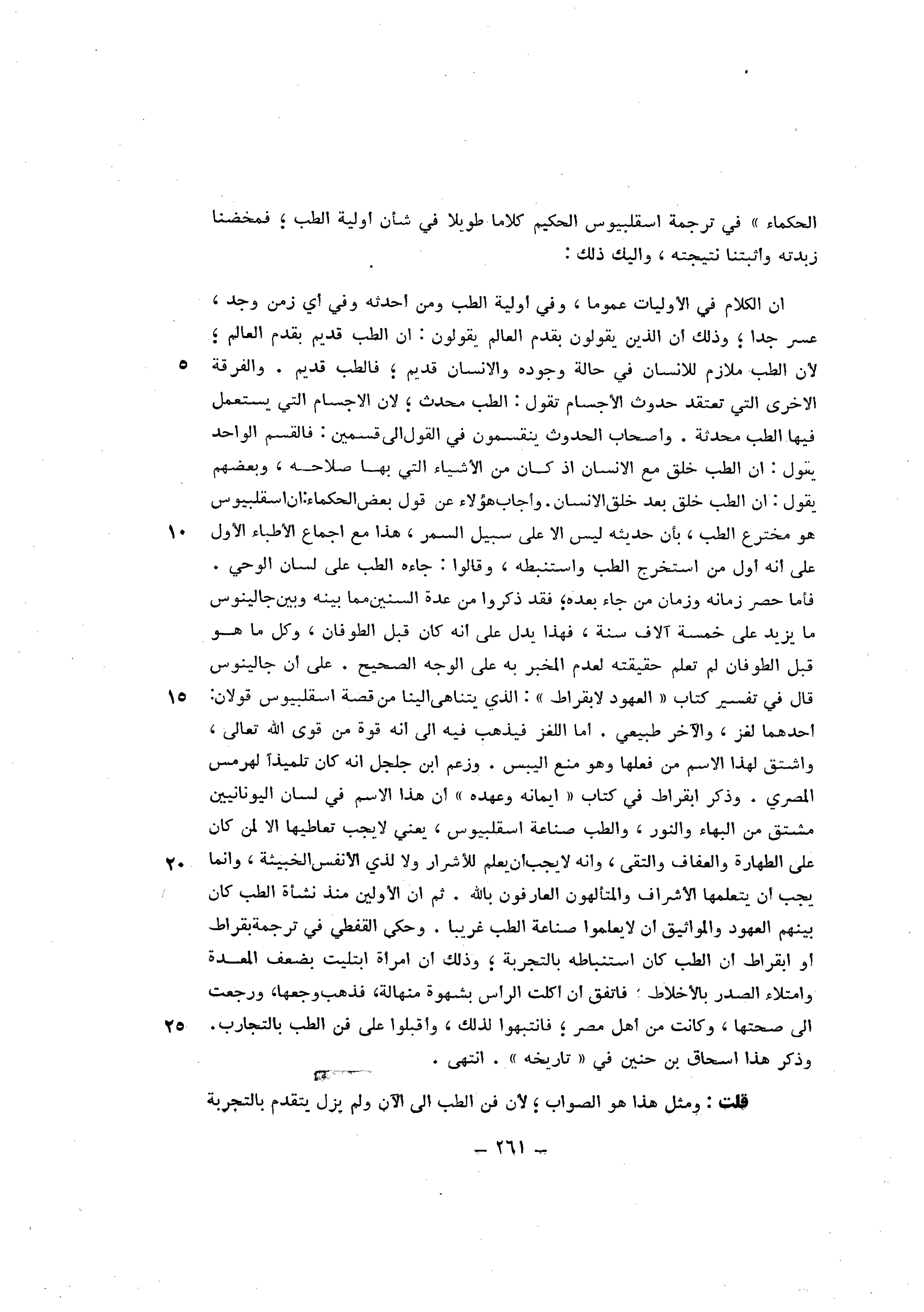 الْحُكَمَاء فِي تَرْجَمَة اسقلبيوس الْحَكِيم كلَاما طَويلا فِي شَأْن أولية الطِّبّ فمخضنا زبدته واثبتنا نتيجته واليك ذَلِك