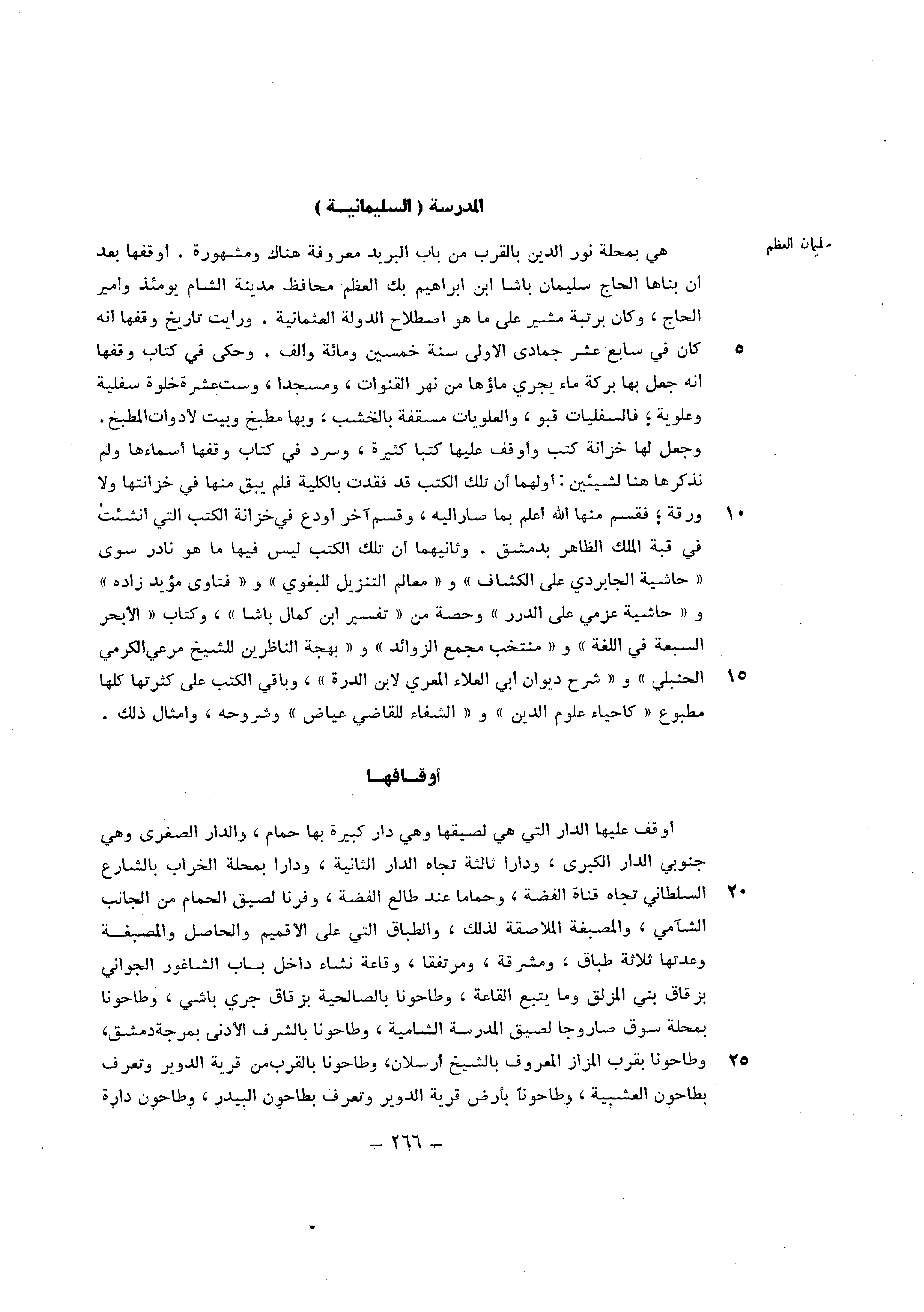 هِيَ بمحلة نور الدّين بِالْقربِ من بَاب الْبَرِيد مَعْرُوفَة هُنَاكَ ومشهورة أوقفها بعد أَن بناها الْحَاج سُلَيْمَان باشا ابْن ابراهيم بك الْعظم محافظ مَدِينَة الشَّام يَوْمئِذٍ وأمير الْحَاج وَكَانَ برتبة مشير على مَا هُوَ اصْطِلَاح الدولة العثمانية وَرَأَيْت تَارِيخ وَقفهَا انه كَانَ فِي سَابِع عشر جُمَادَى الاولى سنة خمسين وَمِائَة وَألف وَحكى فِي كتاب وَقفهَا انه جعل بهَا بركَة مَاء يجْرِي مَاؤُهَا من نهر القنوات ومسجدا وست عشرَة خلْوَة سفلية وعلوية فالسفليات قبو والعلويات مسقفة بالخشب وَبهَا مطبخ وَبَيت لادوات المطبخ وَجعل لَهَا خزانَة كتب وأوقف عَلَيْهَا كتبا كَثِيرَة وسرد فِي كتاب وَقفهَا اسماءها وَلم نذكرها هُنَا لشيئين أَولهمَا ان تِلْكَ الْكتب قد فقدت بِالْكُلِّيَّةِ فَلم يبْق مِنْهَا فِي خزانتها وَلَا ورقة فقسم مِنْهَا الله اعْلَم بِمَا صَار اليه وَقسم آخر اودع فِي خزانَة الْكتب الَّتِي انشئت فِي قبَّة الْملك الظَّاهِر بِدِمَشْق وَثَانِيهمَا ان تِلْكَ الْكتب لَيْسَ فِيهَا مَا هُوَ نَادِر سوى حَاشِيَة الجابردي على الْكَشَّاف ومعالم التَّنْزِيل لِلْبَغوِيِّ وفتاوى مؤيد زَاده وحاشية عزمي على الدُّرَر وَحِصَّة من تَفْسِير ابْن كَمَال باشا وَكتاب الابحر السَّبْعَة فِي اللُّغَة وَمُنْتَخب مجمع الزَّوَائِد وبهجة الناظرين للشَّيْخ مرعي الكرمي الْحَنْبَلِيّ وَشرح ديوَان ابي الْعَلَاء المعري لِابْنِ الدرة وَبَاقِي الْكتب على كثرتها كلهَا مطبوع كإحياء عُلُوم الدّين والشفاء للْقَاضِي عِيَاض وشروحه وأمثال ذَلِك