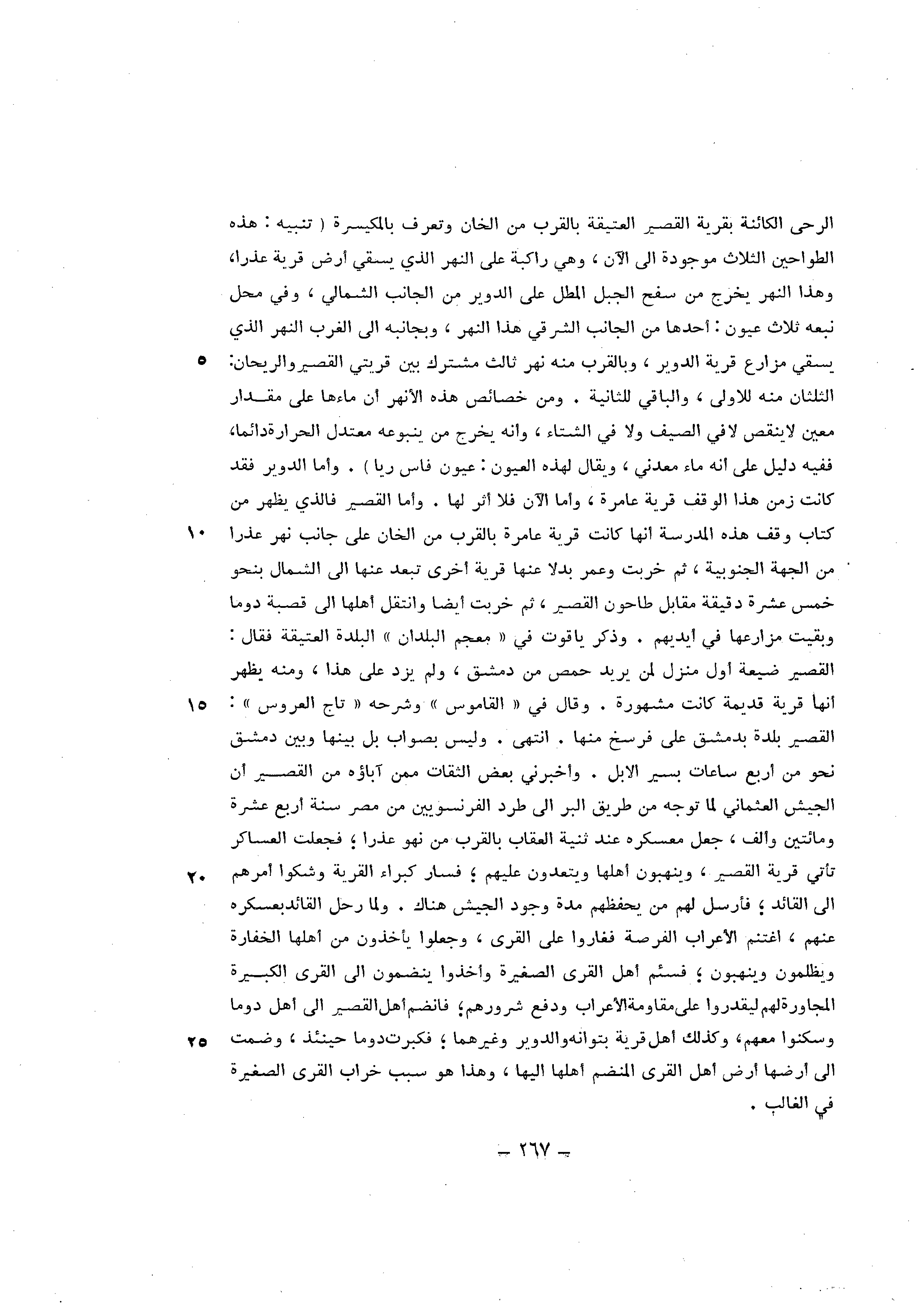 الرَّحَى الكائنة بقرية الْقصير العتيقة بِالْقربِ من الخان وتعرف بالمكيسرة تَنْبِيه هَذِه الطواحين الثَّلَاث مَوْجُودَة الى الْآن وَهِي راكبة على النَّهر الَّذِي يسْقِي ارْض قَرْيَة عذرا وَهَذَا النَّهر يخرج من سفح الْجَبَل المطل على الدوير من الْجَانِب الشمالي وَفِي مَحل نبعه ثَلَاث عُيُون أَحدهَا من الْجَانِب الشَّرْقِي هَذَا النَّهر وبجانبه الى الغرب النَّهر الَّذِي يسْقِي مزارع قَرْيَة الدوير وبالقرب مِنْهُ نهر ثَالِث مُشْتَرك بَين قريتي الْقصير وَالريحَان الثُّلُثَانِ مِنْهُ للاولى وَالْبَاقِي للثَّانِيَة وَمن خَصَائِص هَذِه الانهر ان ماءها على مِقْدَار معِين لَا ينقص لَا فِي الصَّيف وَلَا فِي الشتَاء وانه يخرج من ينبوعه معتدل الْحَرَارَة دَائِما فَفِيهِ دَلِيل على انه مَاء معدني وَيُقَال لهَذِهِ الْعُيُون عُيُون فاس ريا وَأما الدوير فقد كَانَت زمن هَذَا الْوَقْف قَرْيَة عامرة وَأما الْآن فَلَا اثر لَهَا وَأما الْقصير فَالَّذِي يظْهر من كتاب وقف هَذِه الْمدرسَة انها كَانَت قَرْيَة عامرة بِالْقربِ من الخان على جَانب نهر عذرا من الْجِهَة الجنوبية ثمَّ خربَتْ وَعمر بَدَلا عَنْهَا قَرْيَة اخرى تبعد عَنْهَا الى الشمَال بِنَحْوِ خمس عشرَة دقيقة مُقَابل طاحون الْقصير ثمَّ خربَتْ ايضا وانتقل اهلها الى قَصَبَة دَوْمًا وَبقيت مزارعها فِي ايديهم وَذكر ياقوت فِي مُعْجم الْبلدَانِ الْبَلدة العتيقة فَقَالَ الْقصير ضَيْعَة اول منزل لمن يُرِيد حمص من دمشق وَلم يزدْ على هَذَا وَمِنْه يظْهر انها قَرْيَة قديمَة كَانَت مَشْهُورَة وَقَالَ فِي الْقَامُوس وَشَرحه تَاج الْعَرُوس الْقصير بَلْدَة بِدِمَشْق على فَرسَخ مِنْهَا انْتهى وَلَيْسَ بصواب بل بَينهَا وَبَين دمشق نَحْو من ارْبَعْ سَاعَات بسير الابل واخبرني بعض الثِّقَات مِمَّن اباؤه من الْقصير ان الْجَيْش العثماني لما توجه من طَرِيق الْبر الى طرد الفرنسويين من مصر سنة ارْبَعْ عشرَة وَمِائَتَيْنِ وَألف جعل مُعَسْكَره عِنْد ثنية الْعقَاب بِالْقربِ من نهر عذرا فَجعلت العساكر تَأتي قَرْيَة الْقصير وينهبون أَهلهَا ويت عدون عَلَيْهِم فَسَار كبراء الْقرْيَة وَشَكوا أَمرهم الى الْقَائِد فارسل لَهُم من يحفظهم مُدَّة وجود الْجَيْش هُنَاكَ وَلما رَحل الْقَائِد بعسكره عَنْهُم اغتنم الْأَعْرَاب الفرصة فغاروا على الْقرى وَجعلُوا يَأْخُذُونَ من اهلها الخفارة ويظلمون وينهبون فسئم اهل الْقرى الصَّغِيرَة واخذوا ينضمون الى الْقرى الْكَبِيرَة الْمُجَاورَة لَهُم ليقدروا على مقاومة الاعراب وَدفع شرورهم فانضم اهل الْقصير الى اهل دَوْمًا وَسَكنُوا مَعَهم وَكَذَلِكَ أهل قَرْيَة بتوانه والدوير وَغَيرهمَا فكبرت دَوْمًا حِينَئِذٍ وضمت الى ارضها ارْض اهل الْقرى المنضم اهلها اليها وَهَذَا هُوَ سَبَب خراب الْقرى الصَّغِيرَة فِي الْغَالِب