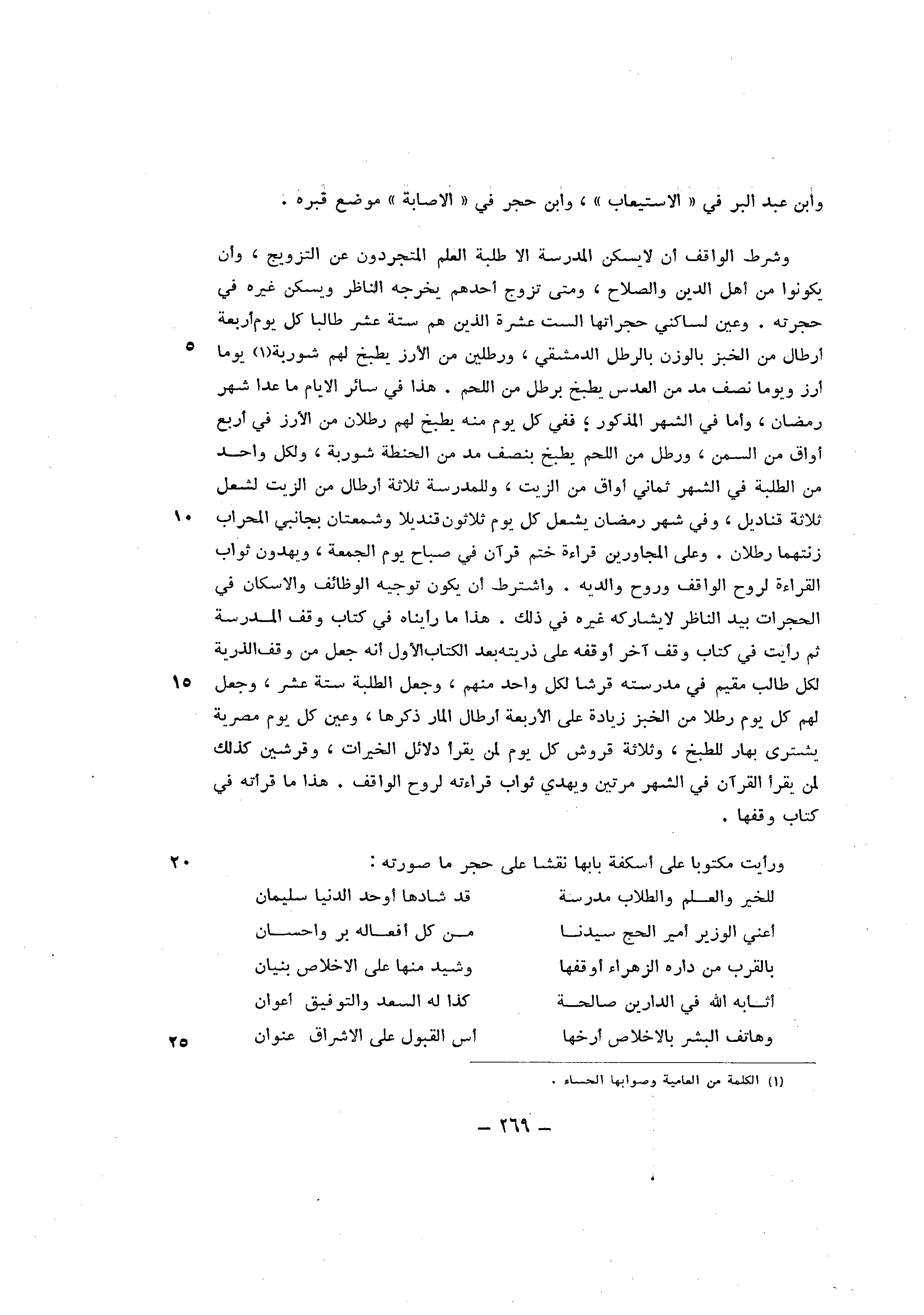 وَشرط الْوَاقِف ان لَا يسكن الْمدرسَة الا طلبة الْعلم المتجردون عَن التَّزْوِيج وان يَكُونُوا من اهل الدّين وَالصَّلَاح وَمَتى تزوج احدهم يُخرجهُ النَّاظر ويسكن غَيره فِي حجرته وَعين لساكني حجراتها السِّت عشرَة الَّذين هم سِتَّة عشر طَالبا كل يَوْم اربعة ارطال من الْخبز بِالْوَزْنِ بالرطل الدِّمَشْقِي ورطلين من الارز يطْبخ لَهُم شوربة يَوْمًا ارز وَيَوْما نصف مد من العدس يطْبخ برطل من اللَّحْم هَذَا فِي سَائِر الايام مَا عدا شهر رَمَضَان وَأما فِي الشَّهْر الْمَذْكُور فَفِي كل يَوْم مِنْهُ يطْبخ لَهُم رطلان من الارز فِي ارْبَعْ اواق من السّمن ورطل من اللَّحْم يطْبخ بِنصْف مد من الْحِنْطَة شوربة وَلكُل وَاحِد من الطّلبَة فِي الشَّهْر ثَمَانِي اواق من الزَّيْت وللمدرسة ثَلَاثَة ارطال من الزَّيْت لشعل ثَلَاثَة قناديل وَفِي شهر رَمَضَان يشعل كل يَوْم ثَلَاثُونَ قِنْدِيلًا وشمعتان بجانبي الْمِحْرَاب زنتهما رطلان وعَلى المجاورين قِرَاءَة ختم قُرْآن فِي صباح يَوْم الْجُمُعَة ويهدون ثَوَاب الْقِرَاءَة لروح الْوَاقِف وروح وَالِديهِ وَاشْترط ان يكون تَوْجِيه الْوَظَائِف والاسكان فِي الحجرات بيد النَّاظر لَا يُشَارِكهُ غَيره فِي ذَلِك هَذَا مَا رَأَيْنَاهُ فِي كتاب وقف الْمدرسَة ثمَّ رَأَيْت فِي كتاب وقف آخر اوقفه على ذُريَّته بعد الْكتاب الاول انه جعل من وقف الذُّرِّيَّة لكل طَالب مُقيم فِي مدرسته قرشا لكل وَاحِد مِنْهُم وَجعل الطّلبَة سنة عشر وَجعل لَهُم كل يَوْم رطلا من الْخبز زِيَادَة على الاربعة أَرْطَال الْمَار ذكرهَا وَعين كل يَوْم مصرية يَشْتَرِي بهَا للطبخ وَثَلَاثَة قروش كل يَوْم لمن يقْرَأ دَلَائِل الْخيرَات وقرشين كَذَلِك لمن يقْرَأ الْقُرْآن فِي الشَّهْر مرَّتَيْنِ وَيهْدِي ثَوَاب قِرَاءَته لروح الْوَاقِف هَذَا مَا قرأته فِي كتاب وَقفهَا