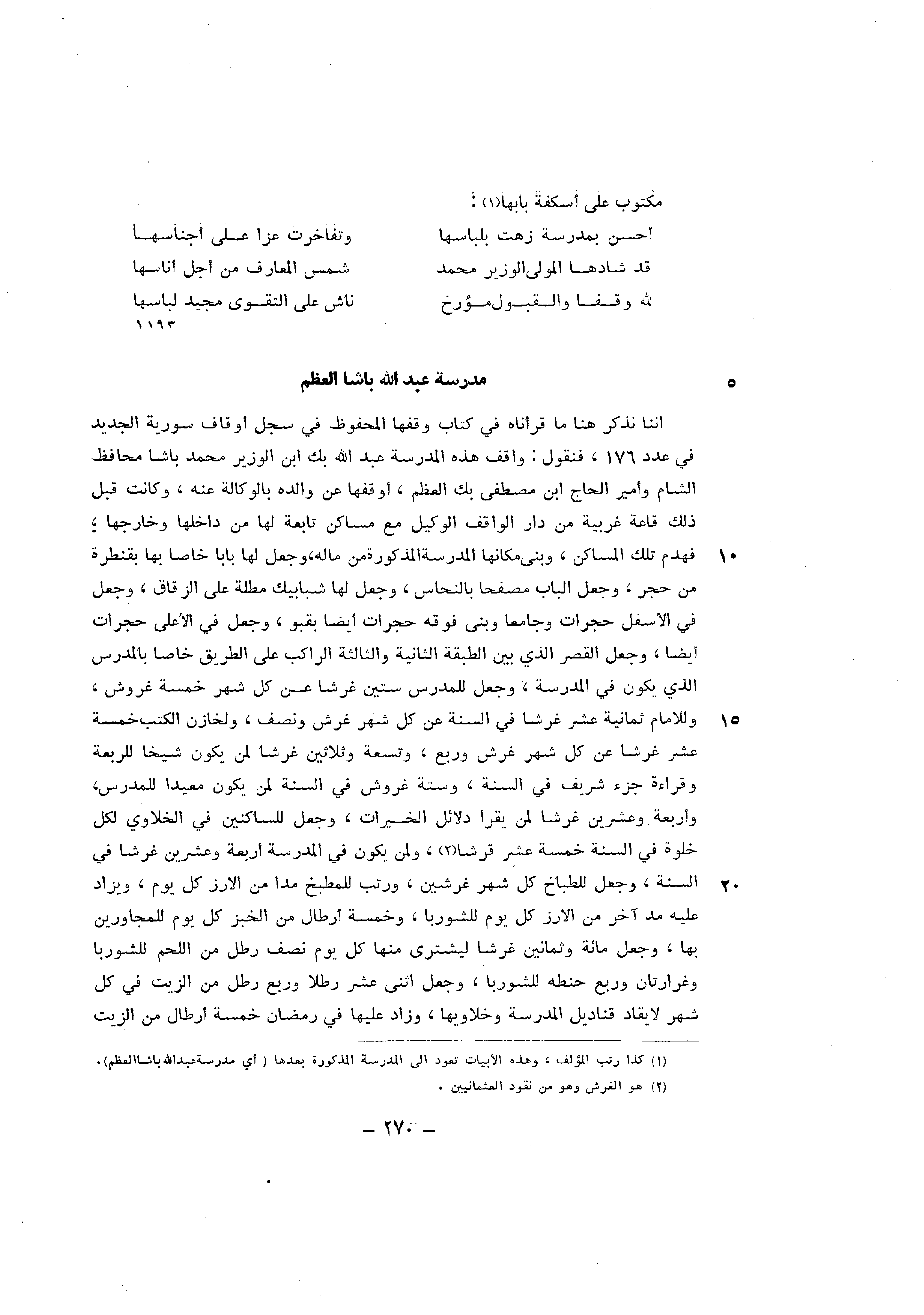 اننا نذْكر هُنَا مَا قرأناه فِي كتاب وَقفهَا الْمَحْفُوظ فِي سجل اوقاف سورية الْجَدِيد فِي عدد 176 فَنَقُول وَاقِف هَذِه الْمدرسَة عبد الله بك ابْن الْوَزير مُحَمَّد باشا محافظ الشَّام وامير الْحَاج ابْن مصطفى بك الْعظم اوقفها عَن وَالِده بِالْوكَالَةِ عَنهُ وَكَانَت قبل ذَلِك قاعة غربية من دَار الْوَاقِف الْوَكِيل مَعَ مسَاكِن تَابِعَة لَهَا من داخلها وخارجها فهدم تِلْكَ المساكن وَبنى مَكَانهَا الْمدرسَة الْمَذْكُورَة من مَاله وَجعل لَهَا بَابا خَاصّا بهَا بقنطرة من حجر وَجعل الْبَاب مصفحا بِالنُّحَاسِ وَجعل لَهَا شبابيك مطلة على الزقاق وَجعل فِي الاسفل حجرات وجامعا وَبنى فَوْقه حجرات ايضا بقبو وَجعل فِي الاعلى حجرات ايضا وَجعل الْقصر الَّذِي بَين الطَّبَقَة الثَّانِيَة وَالثَّالِثَة الرَّاكِب على الطَّرِيق خَاصّا بالمدرس الَّذِي يكون فِي الْمدرسَة وَجعل للمدرس سِتِّينَ غرشا عَن كل شهر خَمْسَة غروش وللامام ثَمَانِيَة عشر غرشا فِي السّنة عَن كل شهر غرش وَنصف ولخازن الْكتب خَمْسَة عشر غرشا عَن كل شهر غرش وَربع وَتِسْعَة وَثَلَاثِينَ غرشا لمن يكون شَيخا للربعة وَقِرَاءَة جُزْء شرِيف فِي السّنة وَسِتَّة غروش فِي السّنة لمن يكون معيدا للمدرس واربعة وَعشْرين غرشا لمن يقْرَأ دَلَائِل الْخيرَات وَجعل للساكنين فِي الخلاوي لكل خلْوَة فِي السّنة خَمْسَة عشر قرشا وَلمن يكون فِي الْمدرسَة أَرْبَعَة وَعشْرين غرشا فِي السّنة وَجعل للطباخ كل شهر غرشين ورتب للمطبخ مدا من الارز كل يَوْم وَيُزَاد عَلَيْهِ مد آخر من الارز كل يَوْم للشوربا وَخَمْسَة ارطال من الْخبز كل يَوْم للمجاورين بهَا وَجعل مائَة وَثَمَانِينَ غرشا ليشترى مِنْهَا كل يَوْم نصف رَطْل من اللَّحْم للشوربا وغرارتان وَربع حنطه للشوربا وَجعل اثنى عشر رطلا وَربع رَطْل من الزَّيْت فِي كل شهر لايقاد قناديل الْمدرسَة وخلاويها وَزَاد عَلَيْهَا فِي رَمَضَان خَمْسَة ارطال من الزَّيْت
