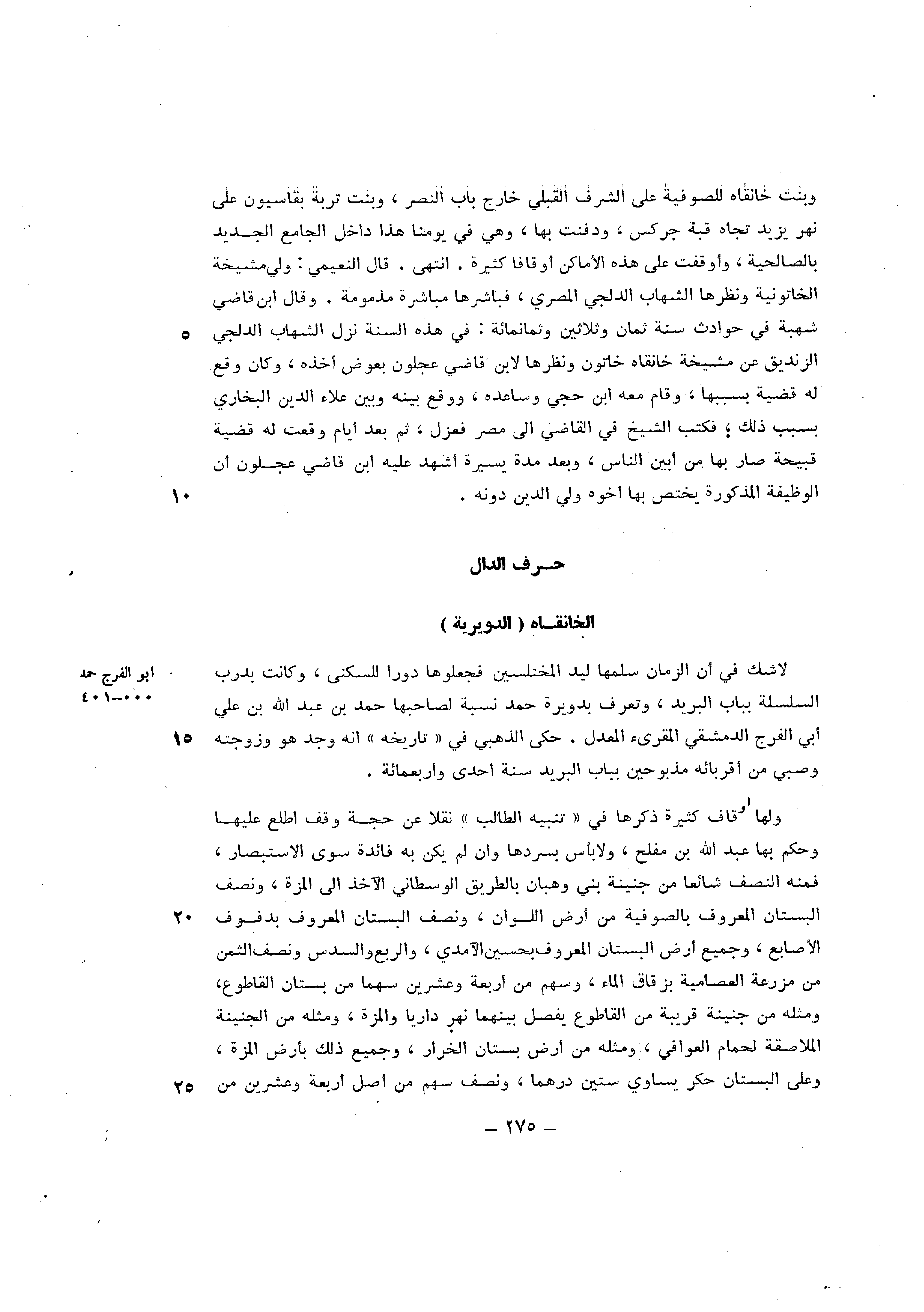وَبنت خانقاه للصوفية على الشّرف القبلي خَارج بَاب النَّصْر وَبنت تربة بقاسيون على نهر يزِيد تجاه قبَّة جركس ودفنت بهَا وَهِي فِي يَوْمنَا هَذَا دَاخل الْجَامِع الْجَدِيد بالصالحية واوقفت على هَذِه الْأَمَاكِن أوقافا كَثِيرَة انْتهى قَالَ النعيمي ولي مشيخة الخاتونية ونظرها الشهَاب الدلجي الْمصْرِيّ فباشرها مُبَاشرَة مذمومة وَقَالَ ابْن قَاضِي شُهْبَة فِي حوادث سنة ثَمَان وَثَلَاثِينَ وَثَمَانمِائَة فِي هَذِه السّنة نزل الشهَاب الدلجي الزنديق عَن مشيخة خانقاه خاتون ونظرها لِابْنِ قَاضِي عجلون بعوض أَخذه وَكَانَ وَقع لَهُ قَضِيَّة بِسَبَبِهَا وَقَامَ مَعَه ابْن حجي وساعده وَوَقع بَينه وَبَين عَلَاء الدّين البُخَارِيّ بِسَبَب ذَلِك فَكتب الشَّيْخ فِي القَاضِي الى مصر فعزل ثمَّ بعد أَيَّام وَقعت لَهُ قَضِيَّة قبيحة صَار بهَا من أبين النَّاس وَبعد مُدَّة يسيرَة اشْهَدْ عَلَيْهِ ابْن قَاضِي عجلون ان الْوَظِيفَة الْمَذْكُورَة يخْتَص بهَا أَخُوهُ ولي الدّين دونه