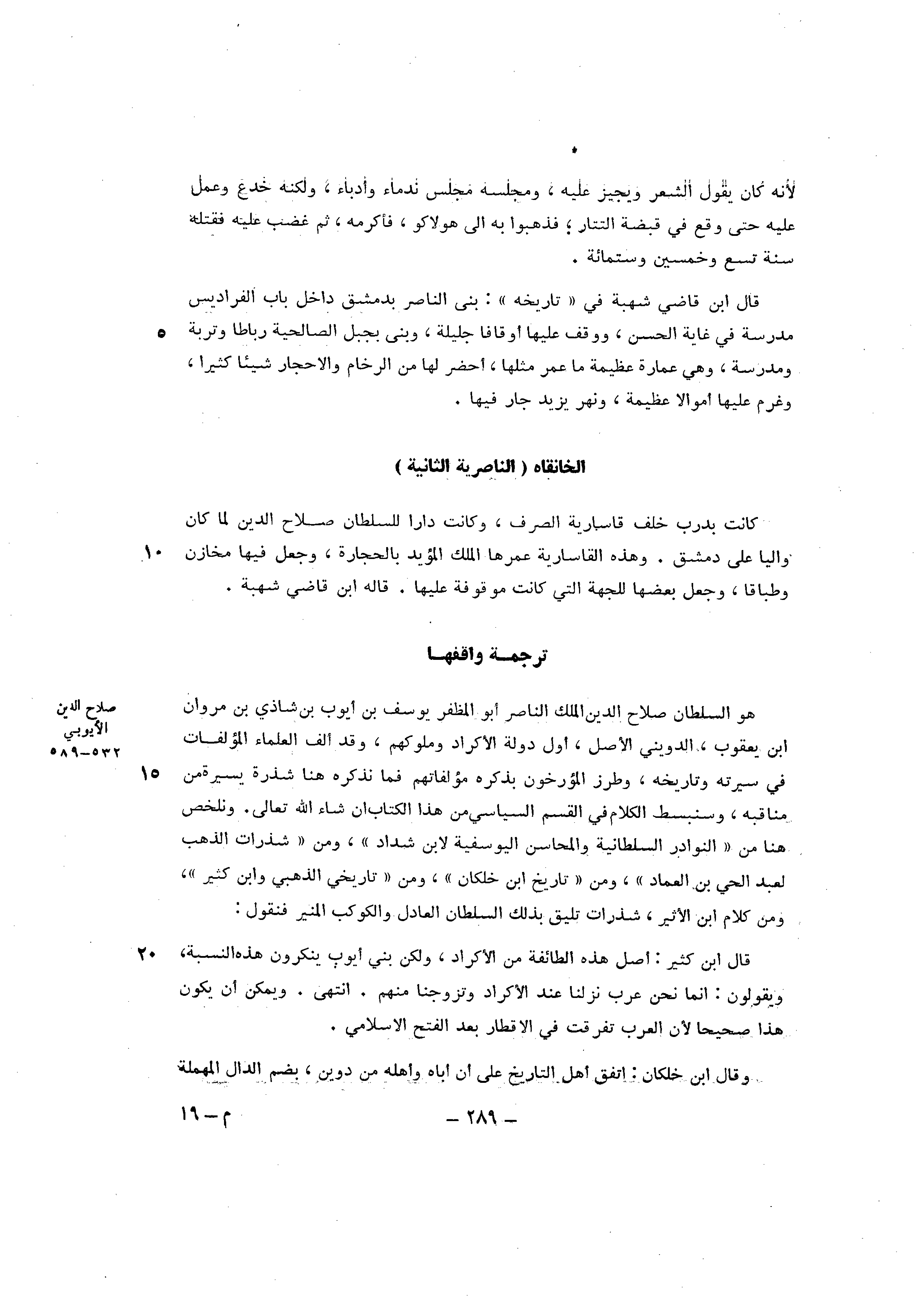 هُوَ السُّلْطَان صَلَاح الدّين الْملك النَّاصِر ابو المظفر يُوسُف بن أَيُّوب بن شاذي بن مَرْوَان ابْن يَعْقُوب الدويني الأَصْل اول دولة الاكراد وملوكهم وَقد ألف الْعلمَاء المؤلفات فِي سيرته وتاريخه وطرز المؤرخون بِذكرِهِ مؤلفاتهم فَمَا نذكرهُ هُنَا شذرة يسيرَة من مناقبه وسنبسط الْكَلَام فِي الْقسم السياسي من هَذَا الْكتاب ان شَاءَ الله تَعَالَى ونلخص هُنَا من النَّوَادِر السُّلْطَانِيَّة والمحاسن اليوسفية لِابْنِ شَدَّاد وَمن شذرات الذَّهَب لعبد الْحَيّ بن الْعِمَاد وَمن تَارِيخ ابْن خلكان وَمن تاريخي الذَّهَبِيّ وَابْن كثير وَمن كَلَام ابْن الْأَثِير شذرات تلِيق بذلك السُّلْطَان الْعَادِل والكوكب الْمُنِير فَنَقُول