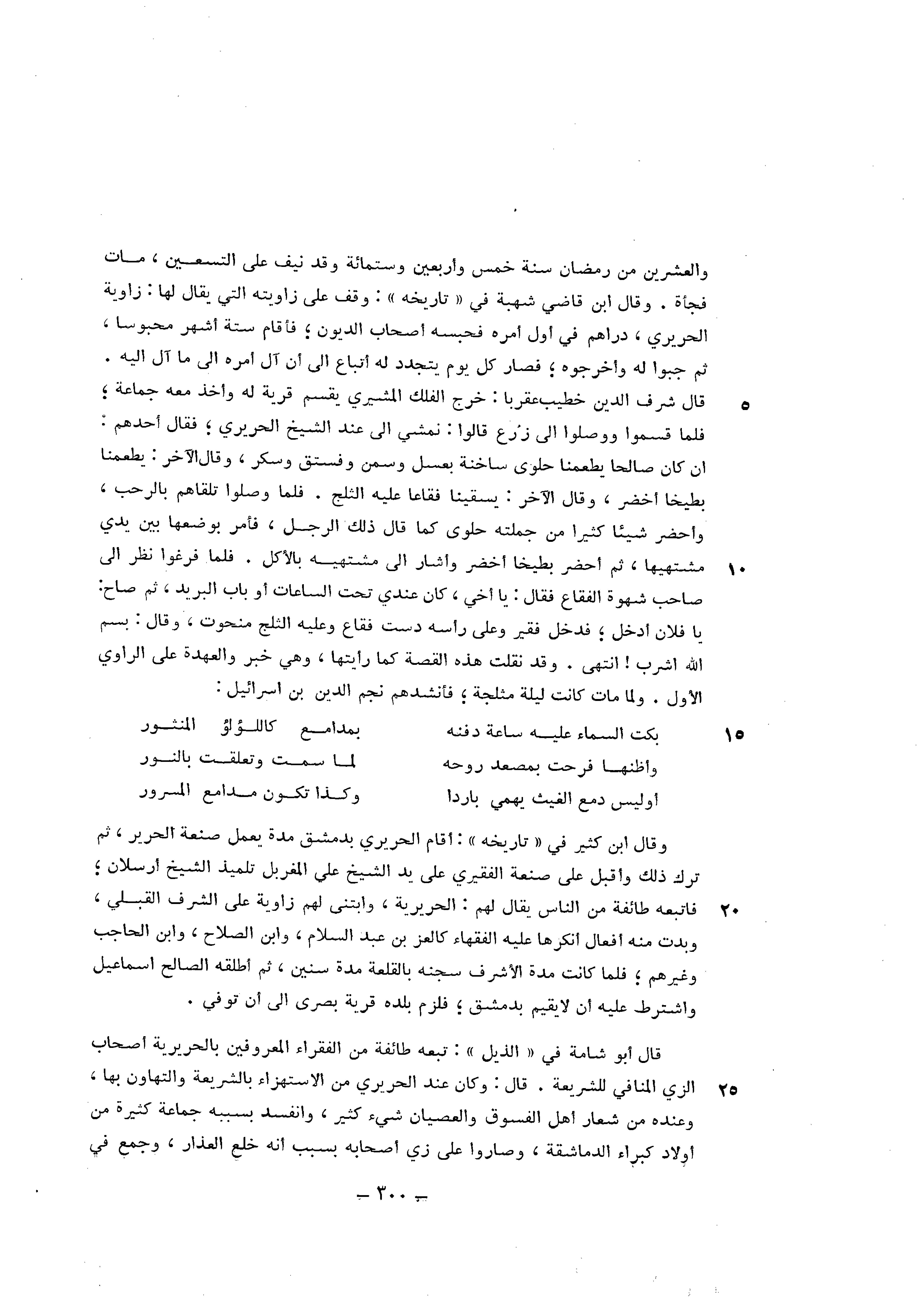 وَالْعِشْرين من رَمَضَان سنة خمس وَأَرْبَعين وسِتمِائَة وَقد نَيف على التسعين مَاتَ فَجْأَة وَقَالَ ابْن قَاضِي شُهْبَة فِي تَارِيخه وقف على زاويته الَّتِي يُقَال لَهَا زَاوِيَة الحريري دَرَاهِم فِي أول أمره فحبسه أَصْحَاب الدُّيُون فَأَقَامَ سِتَّة أشهر مَحْبُوسًا ثمَّ جبوا لَهُ وأخرجوه فَصَارَ كل يَوْم يَتَجَدَّد لَهُ أَتبَاع الى أَن آل أمره الى مَا آل إِلَيْهِ قَالَ شرف الدّين خطيب عقربا خرج الْفلك المشيري يقسم قَرْيَة لَهُ وَأخذ مَعَ جمَاعَة فَلَمَّا قسموا ووصلوا الى زرع قَالُوا نمشي الى عِنْد الشَّيْخ الحريري فَقَالَ أحدهم ان كَانَ صَالحا يطعمنا حلوى ساخنة بِعَسَل وَسمن وفستق وسكر وَقَالَ الآخر يطعمنا بطيخا أَخْضَر وَقَالَ الآخر يسقينا فقاعا عَلَيْهِ الثَّلج فَلَمَّا وصلوا تلقاهم بالرحب وأحضر شَيْئا كثيرا من جملَته حلوى كَمَا قَالَ ذَلِك الرجل فَأمر بوضعها بَين يَدي مشتهيها ثمَّ أحضر بطيخا أَخْضَر وَأَشَارَ الى مشتهيه بِالْأَكْلِ فَلَمَّا فرغوا نظر الى صَاحب شَهْوَة الفقاع فَقَالَ يَا أخي كَانَ عِنْدِي تَحت السَّاعَات أَو بَاب الْبَرِيد ثمَّ صَاح يَا فلَان أَدخل فَدخل فَقير وعَلى رَأسه دست فقاع وَعَلِيهِ الثَّلج منحوت وَقَالَ بِسم الله اشرب انْتهى وَقد نقلت هَذِه الْقِصَّة كَمَا رَأَيْتهَا وَهِي خبر والعهدة على الرَّاوِي الأول وَلما مَاتَ كَانَت لَيْلَة مثلجة فأنشدهم نجم الدّين بن اسرائيل