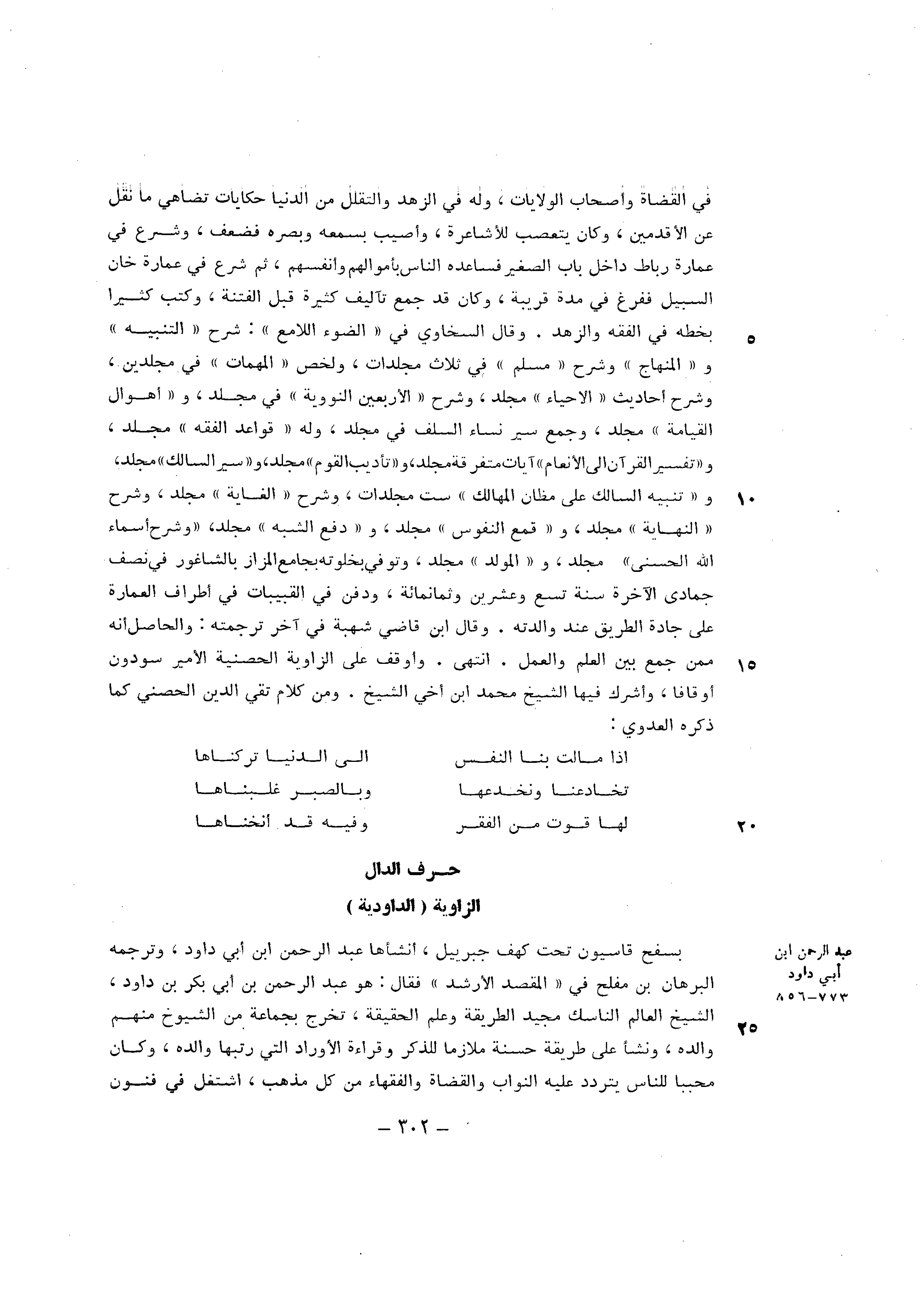 فِي الْقُضَاة وَأَصْحَاب الولايات وَله فِي الزّهْد والتقلل من الدُّنْيَا حكايات تضاهي مَا نقل عَن الأقدمين وَكَانَ يتعصب للأشاعرة وَأُصِيب بسمعه وبصره فضعف وَشرع فِي عمَارَة رِبَاط دَاخل الْبَاب الصَّغِير فساعده النَّاس بِأَمْوَالِهِمْ وأنفسهم ثمَّ شرع فِي عمَارَة خَان السَّبِيل ففرغ فِي مُدَّة قريبَة وَكَانَ قد جمع تآليف كَثِيرَة قبل الْفِتْنَة وَكتب كثيرا بِخَطِّهِ فِي الْفِقْه والزهد وَقَالَ السخاوي فِي الضَّوْء اللامع شرح التَّنْبِيه والمنهاج وَشرح مُسلم فِي ثَلَاث مجلدات ولخص الْمُهِمَّات فِي مجلدين وَشرح أَحَادِيث الْأَحْيَاء مُجَلد وَشرح الْأَرْبَعين النووية فِي مُجَلد وأهوال الْقِيَامَة مُجَلد وَجمع سير نسَاء السّلف فِي مُجَلد وَله قَوَاعِد الْفِقْه مُجَلد وَتَفْسِير الْقُرْآن الى الْأَنْعَام آيَات مُتَفَرِّقَة مُجَلد وتأديب الْقَوْم مُجَلد وسير السالك مُجَلد وتنبيه السالك على مظان المهالك سِتّ مجلدات وَشرح الْغَايَة مُجَلد وَشرح النِّهَايَة مُجَلد وقمع النُّفُوس مُجَلد وَدفع الشّبَه مُجَلد وَشرح أَسمَاء الله الْحسنى مُجَلد والمولد مُجَلد وَتُوفِّي بخلوته بِجَامِع المزاز بالشاغور فِي نصف جُمَادَى الْآخِرَة سنة تسع وَعشْرين وَثَمَانمِائَة وَدفن فِي القبيبات فِي أَطْرَاف الْعِمَارَة على جادة الطَّرِيق عِنْد والدته وَقَالَ ابْن قَاضِي شُهْبَة فِي آخر تَرْجَمته وَالْحَاصِل أَنه مِمَّن جمع بَين الْعلم وَالْعَمَل انْتهى وأوقف على الزاوية الحصنية الْأَمِير سودون أوقافا وأشرك فِيهَا الشَّيْخ مُحَمَّد ابْن أخي الشَّيْخ وَمن كَلَام تَقِيّ الدّين الحصني كَمَا ذكره الْعَدوي