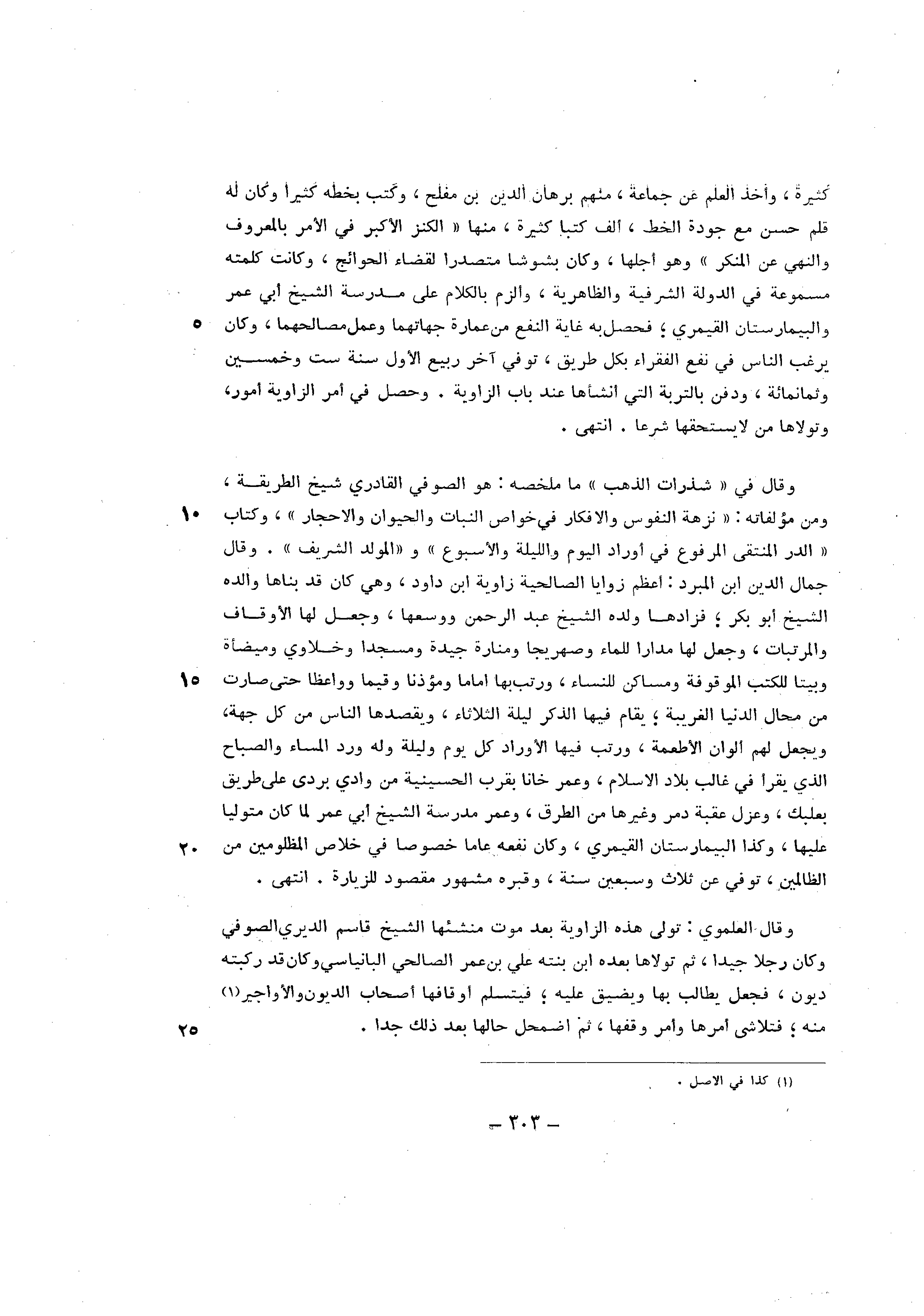 وَقَالَ فِي شذرات الذَّهَب مَا ملخصه هُوَ الصُّوفِي القادري شيخ الطَّرِيقَة وَمن مؤلفاته نزهة النُّفُوس والأفكار فِي خَواص النَّبَات وَالْحَيَوَان والأحجار وَكتاب الدّرّ الْمُنْتَقى الْمَرْفُوع فِي أوراد الْيَوْم وَاللَّيْلَة والأسبوع والمولد الشريف وَقَالَ جمال الدّين ابْن الْمبرد أعظم زَوَايَا الصالحية زَاوِيَة ابْن دَاوُد وَهِي كَانَ قد بناها وَالِده الشَّيْخ أَبُو بكر فزادها وَلَده الشَّيْخ عبد الرَّحْمَن ووسعها وَجعل لَهَا الْأَوْقَاف والمرتبات وَجعل لَهَا مدارا للْمَاء وصهريجا ومنارة جَيِّدَة ومسجدا وخلاوي وميضأة وبيتا للكتب الْمَوْقُوفَة ومساكن للنِّسَاء ورتب بهَا اماما ومؤذنا وقيما وواعظا حَتَّى صَارَت من محَال الدُّنْيَا الغريبة يُقَام فِيهَا الذّكر لَيْلَة الثُّلَاثَاء ويقصدها النَّاس من كل جِهَة وَيجْعَل لَهُم ألوان الاطعمة ورتب فِيهَا الأوراد كل يَوْم وَلَيْلَة وَله ورد الْمسَاء والصباح الَّذِي يقْرَأ فِي غَالب بِلَاد الاسلام وَعمر خَانا بِقرب الحسينية من وَادي بردى على طَرِيق بعلبك وعزل عقبَة دمر وَغَيرهَا من الطَّرِيق وَعمر مدرسة الشَّيْخ ابي عمر لما كَانَ مُتَوَلِّيًا عَلَيْهَا وَكَذَا البيمارستان القيمري وَكَانَ نَفعه عَاما خُصُوصا فِي خلاص المظلومين من الظَّالِمين توفّي عَن ثَلَاث وَسبعين سنة وقبره مَشْهُور مَقْصُود للزيارة انْتهى