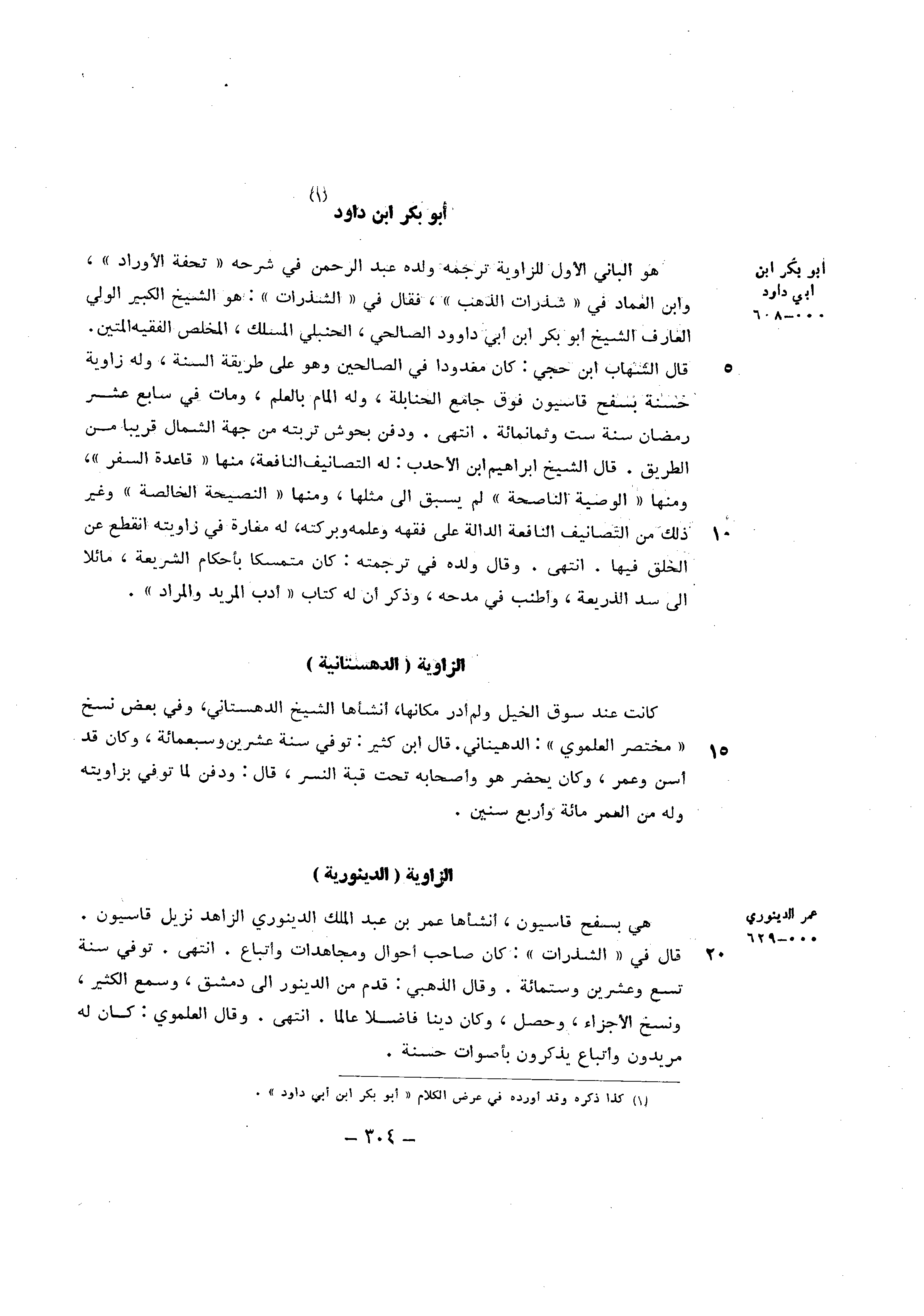 هُوَ الْبَانِي الأول للزاوية تَرْجمهُ وَلَده عبد الرَّحْمَن فِي شَرحه تحفة الأوراد وَابْن الْعِمَاد فِي شذرات الذَّهَب فَقَالَ فِي الشذرات هُوَ الشَّيْخ الْكَبِير الْوَلِيّ الْعَارِف الشَّيْخ ابو بكر ابْن أبي دَاوُود الصَّالِحِي الْحَنْبَلِيّ المسلك المخلص الْفَقِيه المتين قَالَ الشهَاب ابْن حجي كَانَ معدودا فِي الصَّالِحين وَهُوَ على طَريقَة السّنة وَله زَاوِيَة حَسَنَة بسفح قاسيون فَوق جَامع الْحَنَابِلَة وَله إِلْمَام بِالْعلمِ وَمَات فِي سَابِع عشر رَمَضَان سنة سِتّ وَثَمَانمِائَة انْتهى وَدفن بحوش تربته من جِهَة الشمَال قَرِيبا من الطَّرِيق قَالَ الشَّيْخ ابراهيم ابْن الأحدب لَهُ التصانيف النافعة مِنْهَا قَاعِدَة السّفر وَمِنْهَا الْوَصِيَّة الناصحة لم يسْبق الى مثلهَا وَمِنْهَا النَّصِيحَة الْخَالِصَة وَغير ذَلِك من التصانيف النافعة الدَّالَّة على فقهه وَعلمه وبركته لَهُ مغارة فِي زاويته انْقَطع عَن الْخلق فِيهَا انْتهى وَقَالَ وَلَده فِي تَرْجَمته كَانَ متمسكا بِأَحْكَام الشَّرِيعَة مائلا الى سد الذريعة وَأَطْنَبَ فِي مدحه وَذكر أَن لَهُ كتاب أدب المريد وَالْمرَاد