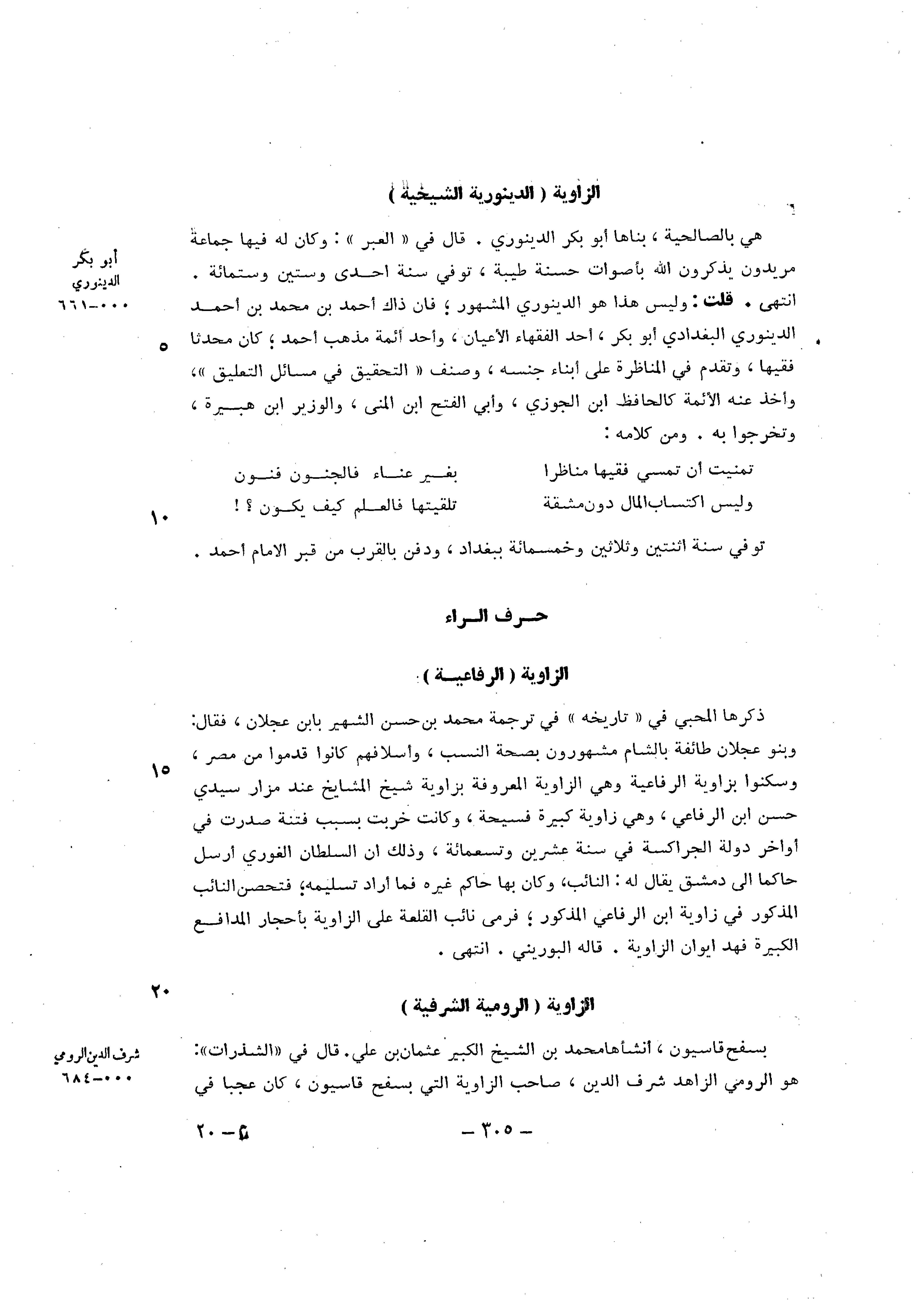 ذكرهَا المحبي فِي تَارِيخه فِي تَرْجَمَة مُحَمَّد بن حسن الشهير بِابْن عجلَان فَقَالَ وَبَنُو عجلَان طَائِفَة بِالشَّام مَشْهُورُونَ بِصِحَّة النّسَب وأسلافهم كَانُوا قدمُوا من مصر وَسَكنُوا بزاوية الرفاعية وَهِي الزاوية الْمَعْرُوفَة بزاوية شيخ الْمَشَايِخ عِنْد مَزَار سَيِّدي حسن ابْن الرِّفَاعِي وَهِي زَاوِيَة كَبِيرَة فسيحة وَكَانَت خربَتْ بِسَبَب فتْنَة صدرت فِي أَوَاخِر دولة الجراكسة فِي سنة عشْرين وَتِسْعمِائَة وَذَلِكَ ان السُّلْطَان الغوري أرسل حَاكما الى دمشق يُقَال لَهُ النَّائِب وَكَانَ بهَا حَاكم غَيره فَمَا اراد تَسْلِيمه فتحصن النَّائِب الْمَذْكُور فِي زَاوِيَة ابْن الرِّفَاعِي الْمَذْكُور فَرمى نَائِب القلعة على الزاوية بأحجار المدافع الْكَبِيرَة فَهد ايوان الزاوية قَالَ هالبوريني انْتهى