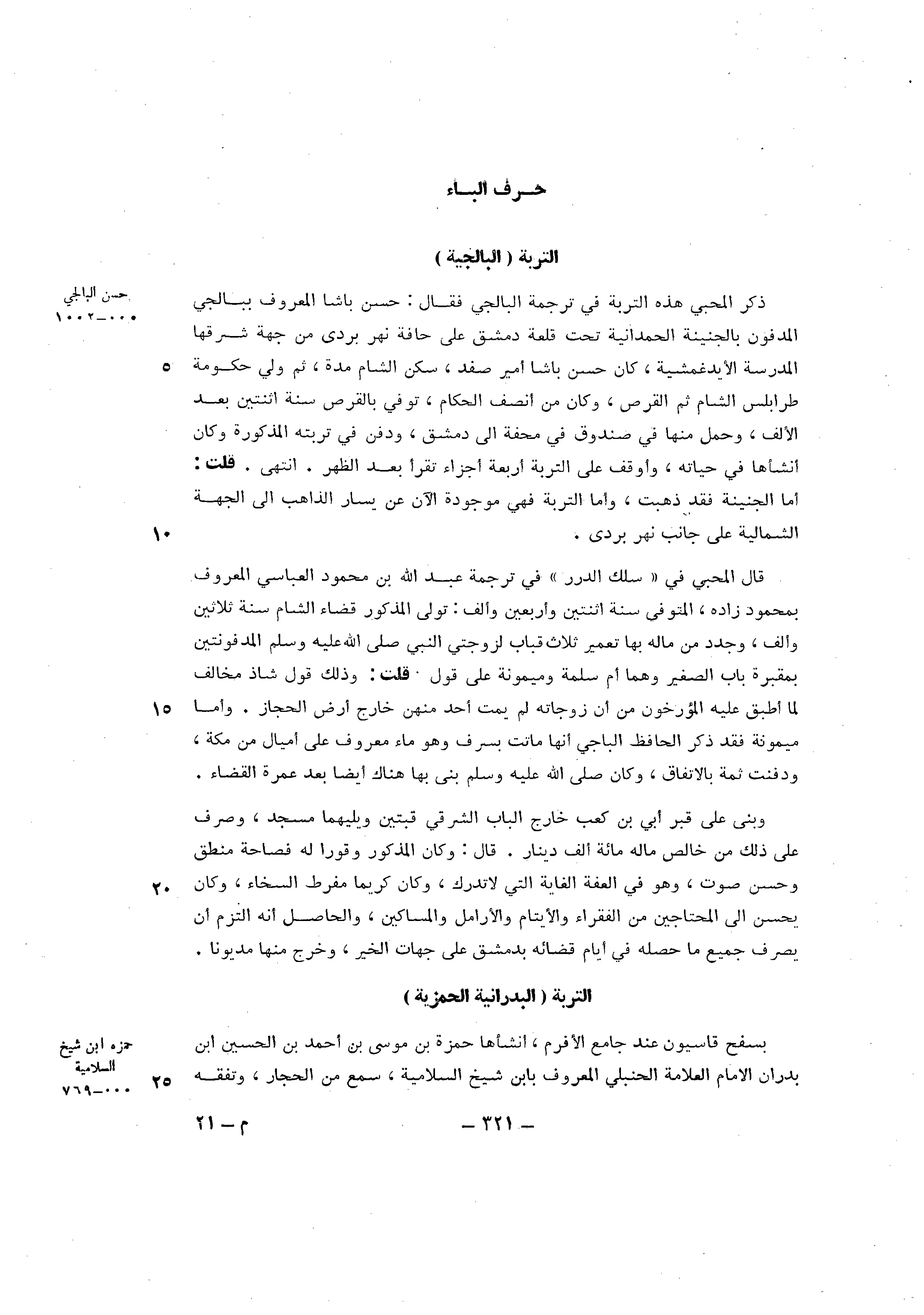 ذكر المحبي هَذِه التربة فِي تَرْجَمَة البالجي فَقَالَ حسن باشا الْمَعْرُوف ببالجي المدفون بالجنينة الحمدانية تَحت قلعة دمشق على حافة نهر بردى من جِهَة شرقها الْمدرسَة الأيدغمشية كَانَ حسن باشا أَمِير صفد سكن الشَّام مُدَّة ثمَّ ولي حُكُومَة طرابلس الشَّام ثمَّ القرص وَكَانَ من أنصف الْحُكَّام توفّي بالقرص سنة اثْنَتَيْنِ بعد الالف وَحمل مِنْهَا فِي صندوق فِي محفة الى دمشق وَدفن فِي تربته الْمَذْكُورَة وَكَانَ أَنْشَأَهَا فِي حَيَاته وأوقف على التربة اربعة اجزاء تقْرَأ بعد الظّهْر انْتهى قلت أما الجنينة فقد ذهبت واما التربة فَهِيَ مَوْجُودَة الْآن عَن يسَار الذَّاهِب الى الْجِهَة الشمالية على جَانب نهر بردى
