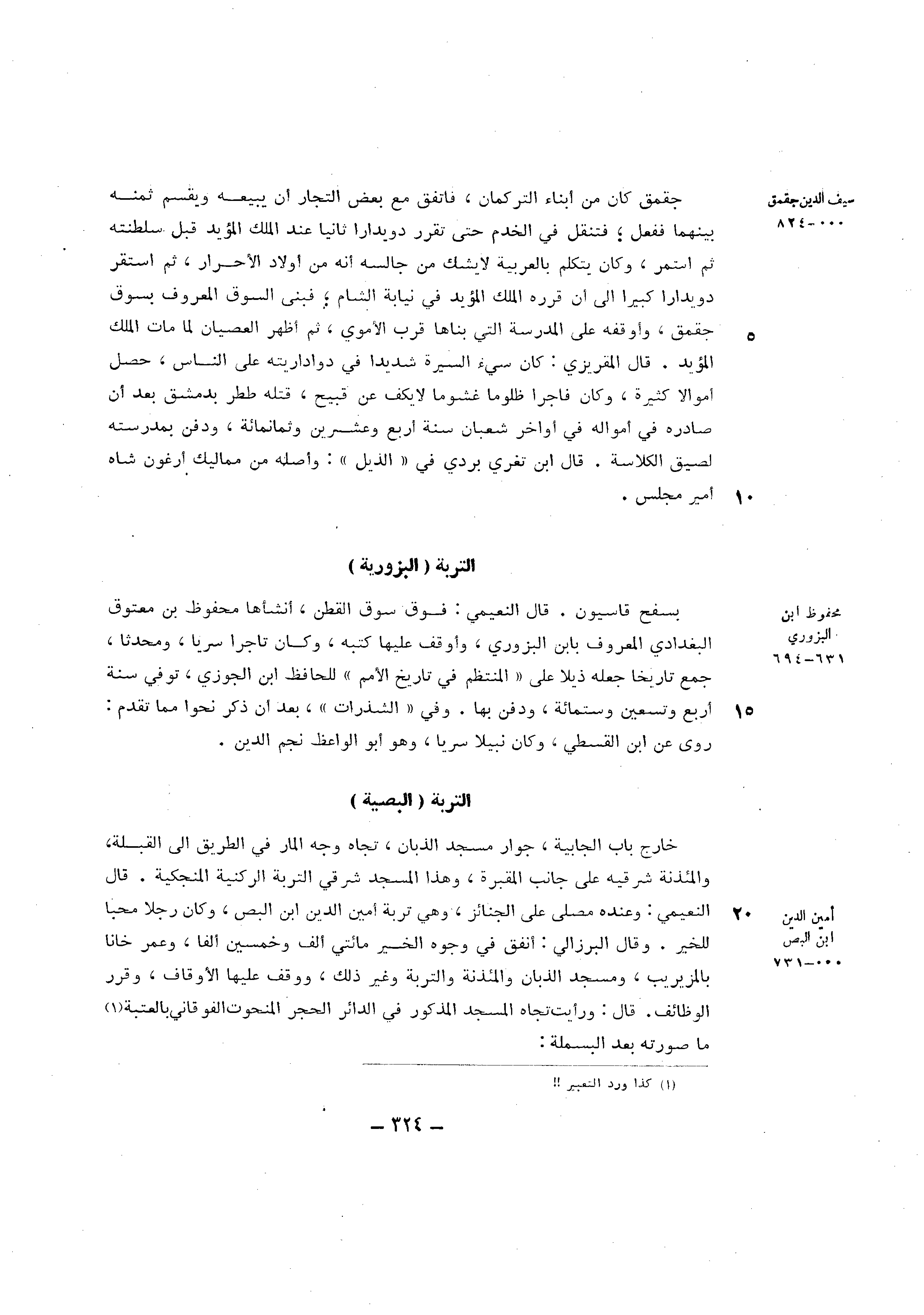 خَارج بَاب الْجَابِيَة جوَار مَسْجِد الذبان تجاه وَجه الْمَار فِي الطَّرِيق الى الْقبْلَة والمئذنة شرقية عللى جَانب الْمقْبرَة وَهَذَا الْمَسْجِد شَرْقي التربة الركنية المنجكية قَالَ النعيمي وَعِنْده مصلى على الْجَنَائِز وَهِي تربة امين الدّين ابْن البص وَكَانَ رجلا محبا للخير وَقَالَ البرزالي أنْفق فِي وُجُوه الْخَيْر مِائَتي ألف وَخمسين ألفا وَعمر خَانا بالمزيريب وَمَسْجِد الذبان والمئذية والتربة وَغير ذَلِك ووقف عَلَيْهَا الْأَوْقَاف وَقرر الْوَظَائِف قَالَ ورايت تجاه الْمَسْجِد الْمَذْكُور فِي الدائر الْحجر المنحوت الفوقاني بالعتبة مَا صورته بعد الْبَسْمَلَة