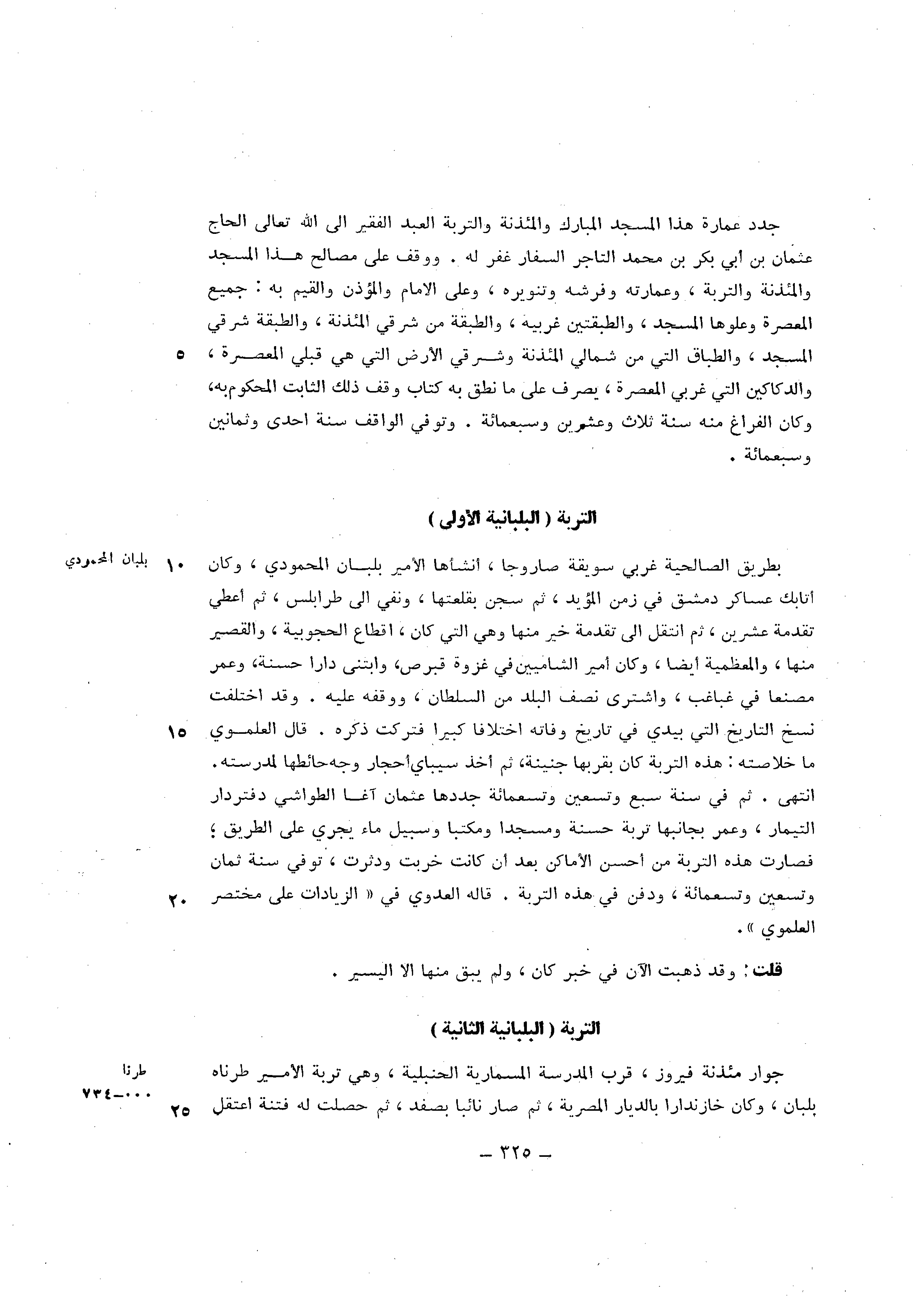 جدد عمَارَة هَذَا الْمَسْجِد الْمُبَارك والمئذنة والتربة العَبْد الْفَقِير الى الله تَعَالَى الْحَاج عُثْمَان بن أبي بكر بن مُحَمَّد التَّاجِر السفار غفر لَهُ ووقف على مصَالح هَذَا الْمَسْجِد والمئذنة والتربة وعمارته وفرشه وتنويره وعَلى الامام الْمُؤَذّن والقيم بِهِ جَمِيع المعصرة وعلوها الْمَسْجِد والطبقتين غربيه والطبقة من شَرْقي المئذنة والطبقة شَرْقي الْمَسْجِد الَّتِي من شمَالي المئذنة وشرقي الارض الَّتِي هِيَ قبلي المعصرة والدكاكين الَّتِي غربي المعصرة يصرف على مَا نطق بِهِ كتاب وقف ذَلِك الثَّابِت الْمَحْكُوم بِهِ وَكَانَ الْفَرَاغ مِنْهُ سنة ثَلَاث وَعشْرين وَسَبْعمائة وَتُوفِّي الْوَاقِف سنة احدى وَثَمَانِينَ وَسَبْعمائة