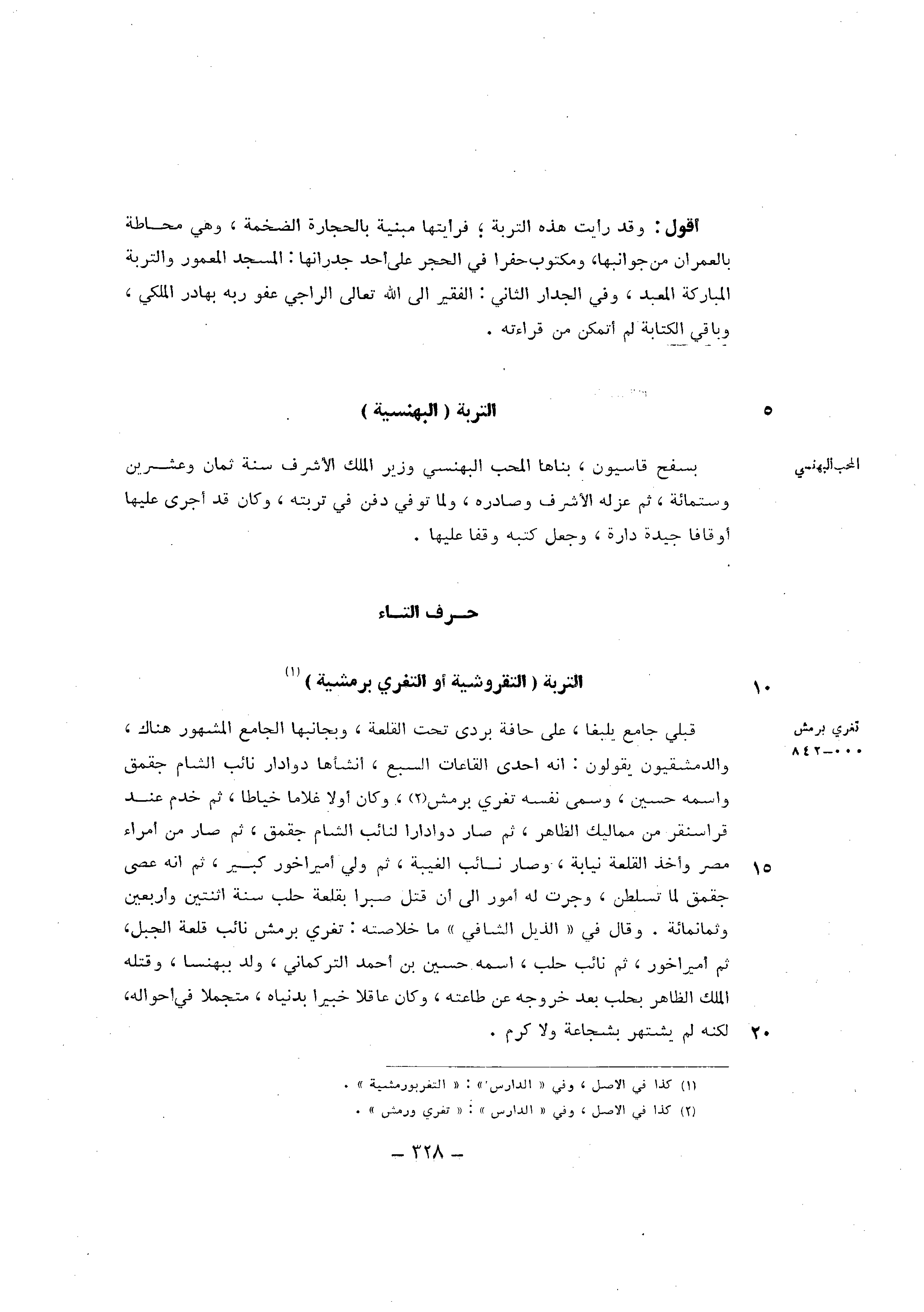 أَقُول وَقد هَذَا رَأَيْت هَذِه التربة فرأيتها مَبْنِيَّة بِالْحِجَارَةِ الضخمة وَهِي محاطة بالعمران من جوانبها ومكتوب حفرا فِي الْحجر على أحد جدرانها الْمَسْجِد الْمَعْمُور والتربة الْمُبَارَكَة المعبد وَفِي الْجِدَار الثَّانِي الْفَقِير الى الله تَعَالَى الراجي عَفْو ربه بهادر الملكي وَبَاقِي الْكِتَابَة لم أتمكن من قِرَاءَته