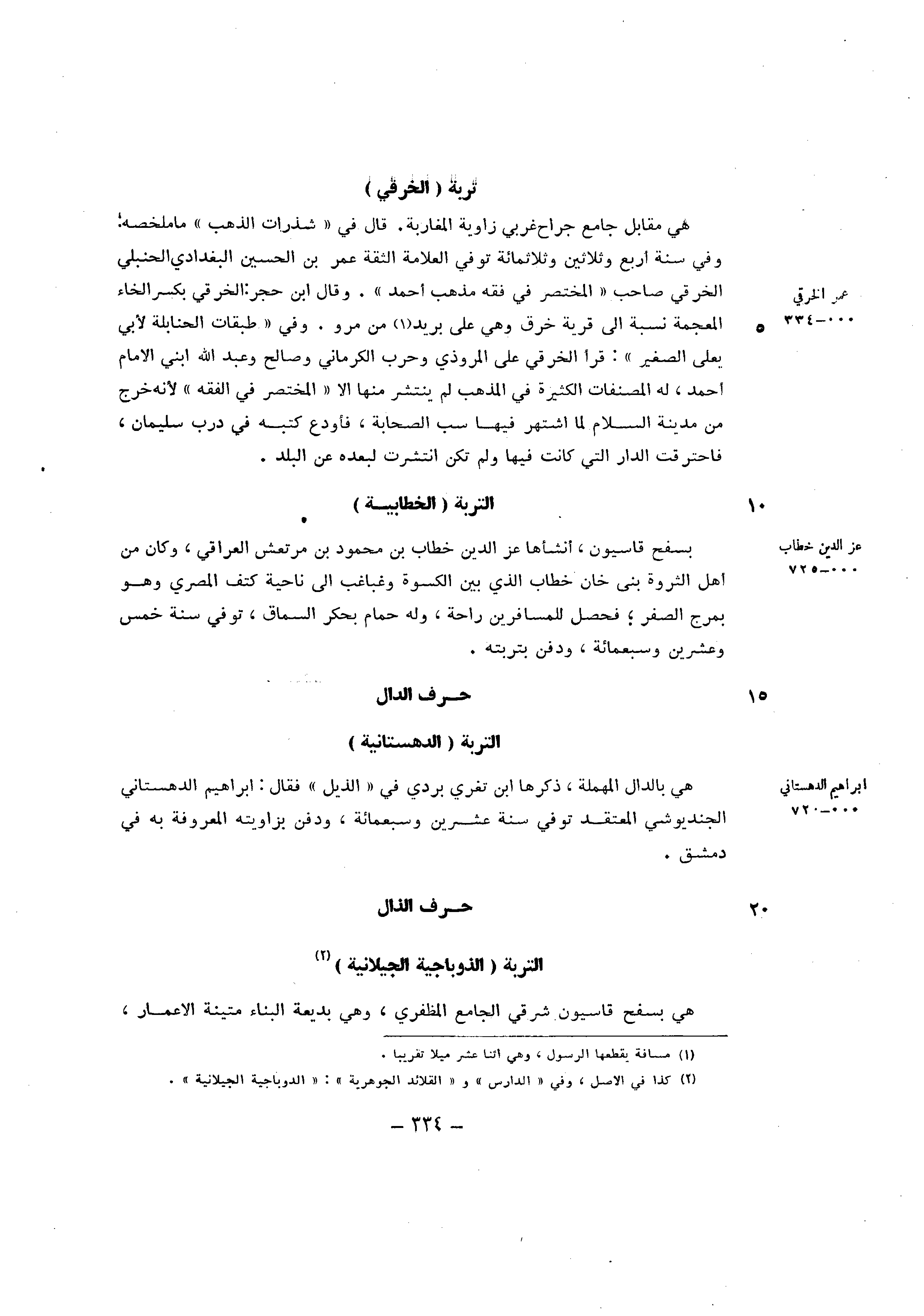 هِيَ مُقَابل جَامع جراح غربي زَاوِيَة المغاربة قَالَ فِي شذرات الذَّهَب مَا ملخصه وَفِي سنة ارْبَعْ وَثَلَاثِينَ وثلاثمائة توفّي الْعَلامَة الثِّقَة عمر بن الْحُسَيْن الْبَغْدَادِيّ الْحَنْبَلِيّ الْخرقِيّ صَاحب الْمُخْتَصر فِي فقه مَذْهَب احْمَد وَقَالَ ابْن حجر الْخرقِيّ بِكَسْر الْخَاء الْمُعْجَمَة نِسْبَة ي الى قَرْيَة خرق وَهِي على بريد من مرو وَفِي طَبَقَات الْحَنَابِلَة لابي يعلى الصَّغِير قَرَأَ الْخرقِيّ على الْمَرْوذِيّ وَحرب الْكرْمَانِي وَصَالح وَعبد الله ابْني الامام احْمَد لَهُ المصنفات الْكَثِيرَة فِي الْمَذْهَب لم ينتشر مِنْهَا الا الْمُخْتَصر فِي الْفِقْه لانه خرج من مَدِينَة السَّلَام لما اشْتهر فِيهَا سبّ الصَّحَابَة فاودع كتبه فِي درب سُلَيْمَان فاحترقت الدَّار الَّتِي كَانَت فِيهَا وَلم تكن انتشرت لبعده عَن الْبَلَد