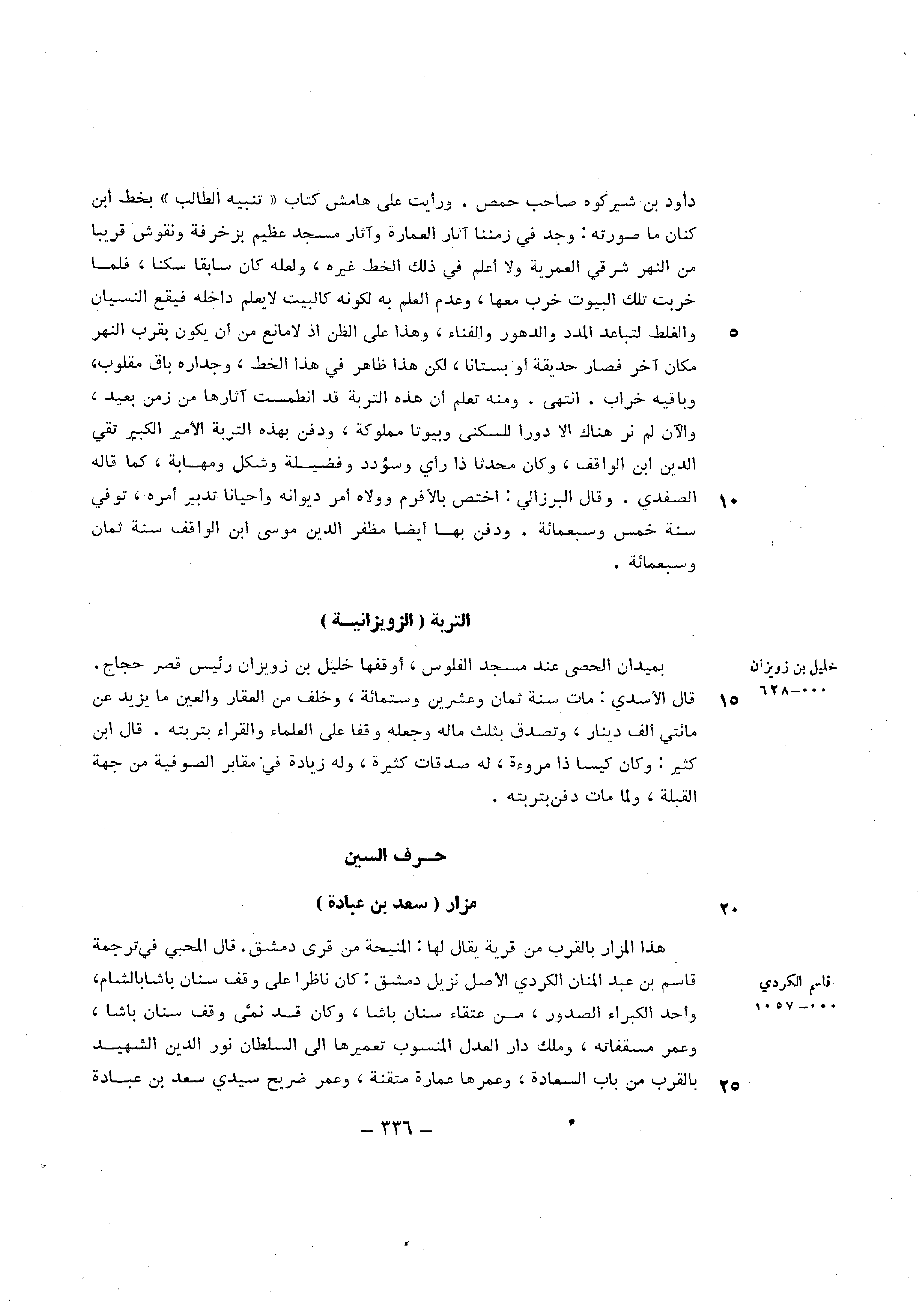 دَاوُد بن شيركوه صَاحب حمص ورايت على هَامِش كتاب تَنْبِيه الطَّالِب بِخَط ابْن كنان مَا صورته وجد فِي زمننا آثَار الْعِمَارَة وآثار مَسْجِد عَظِيم بزخرفة ونقوش قَرِيبا من النَّهر شَرْقي العمرية وَلَا اعْلَم فِي ذَلِك الْخط غَيره وَلَعَلَّه كَانَ سَابِقًا سكنا فَلَمَّا خربَتْ تِلْكَ الْبيُوت خرب مَعهَا وَعدم الْعلم بِهِ لكَونه كالبيت لَا يعلم دَاخله فَيَقَع النسْيَان والغلط لتباعد المدد والدهور والفناء وَهَذَا على الظَّن اذ لَا مَانع من أَن يكون بِقرب النَّهر مَكَان آخر فَصَارَ حديقة اَوْ بستانا لَكِن هَذَا ظَاهر فِي هَذَا الْخط وجداره بَاقٍ مقلوب وَبَاقِيه خراب انْتهى وَمِنْه تعلم ان هَذِه التربة قد انطمست آثارها من زمن بعيد والآن لم نر هُنَاكَ إِلَّا دورا للسُّكْنَى وبيوتا مَمْلُوكَة وَدفن بِهَذِهِ التربة الامير الْكَبِير تَقِيّ الدّين ابْن الْوَاقِف وَكَانَ مُحدثا ذَا رَأْي وسؤدد وفضيلة وشكل ومهابة كَمَا قَالَه الصَّفَدِي وَقَالَ البرزالي اخْتصَّ بالافرم وولاه امْر ديوانه واحيانا تَدْبِير امْرَهْ توفّي سنة خمس وَسَبْعمائة وَدفن بهَا ايضا مظفر الدّين مُوسَى ابْن الْوَاقِف سنة ثَمَان وَسَبْعمائة