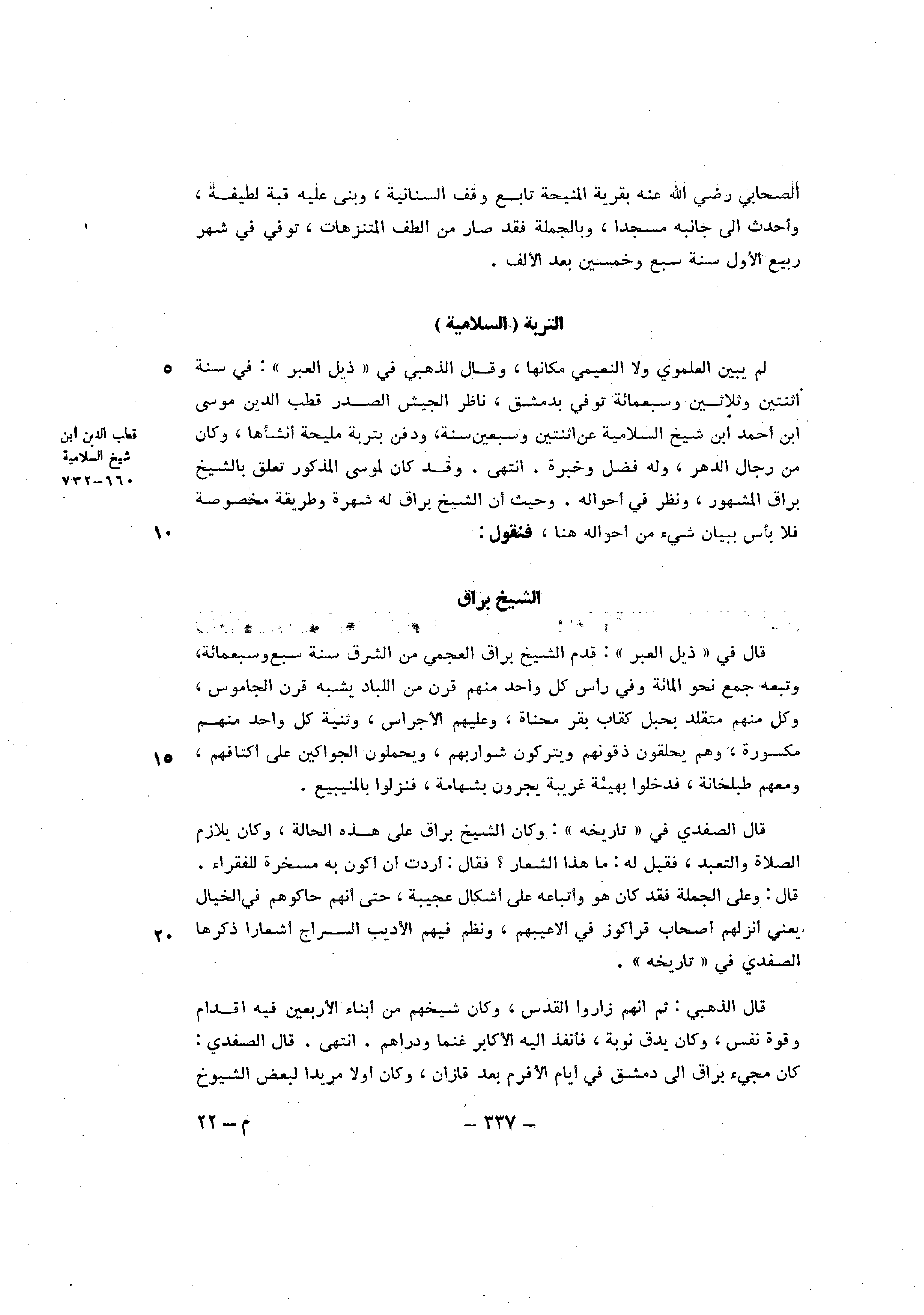 قَالَ الذَّهَبِيّ ثمَّ انهم زاروا الْقُدس وَكَانَ شيخهم من ابناء الاربعين فِيهِ اقدام وَقُوَّة نفس وَكَانَ يدق نوبَة فأنفذ اليه الاكابر غنما ودراهم انْتهى قَالَ الصَّفَدِي كَانَ مجئ براق الى دمشق فِي ايام الافرم بعد قازان وَكَانَ اولا مرِيدا لبَعض الشُّيُوخ