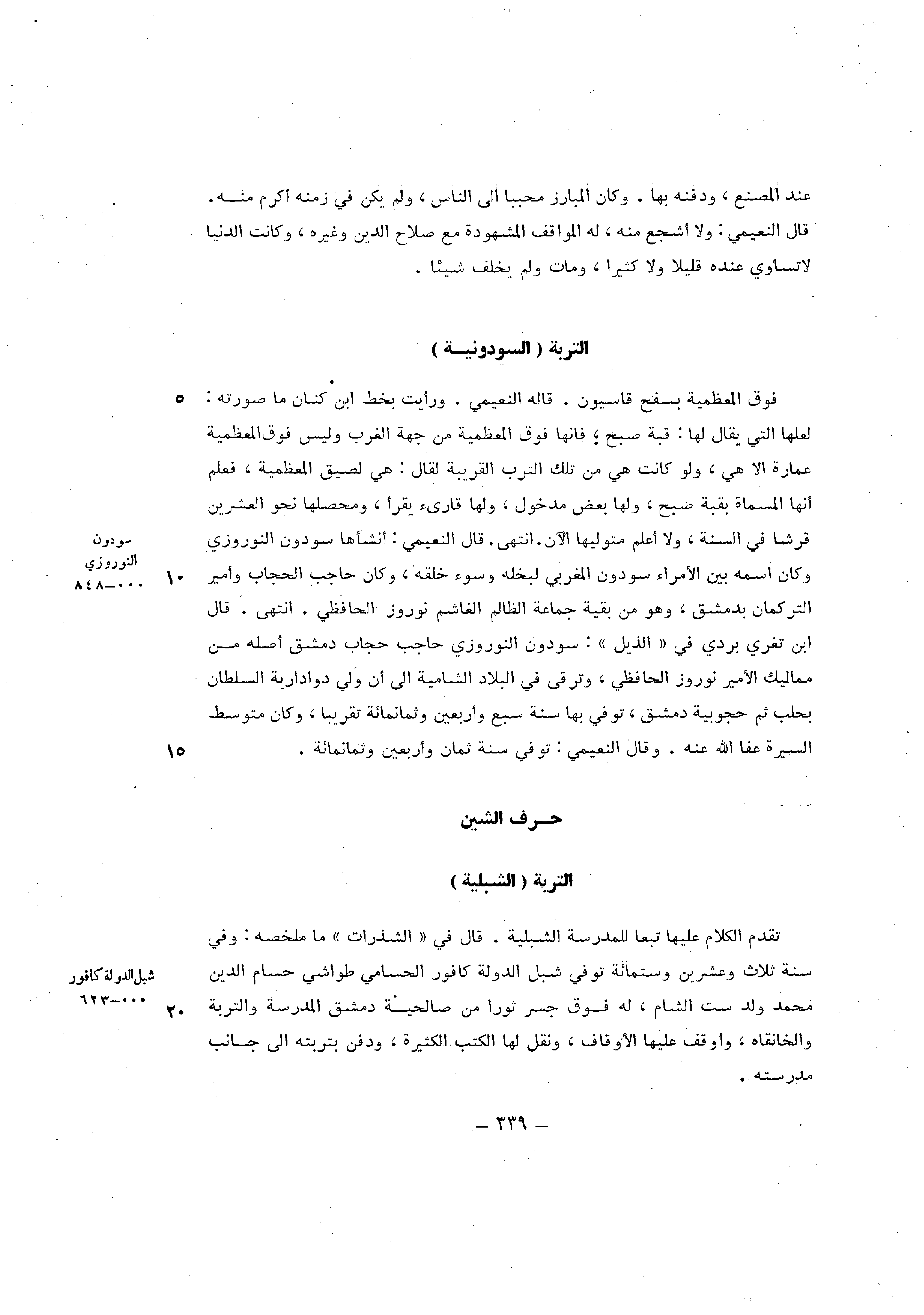 فَوق المعظمية بسفح قاسيون قَالَه النعيمي ورايت بِخَط ابْن كنان مَا صورته لَعَلَّهَا الَّتِي يُقَال لَهَا قبَّة صبح فانها فَوق المعظمية من جِهَة الغرب وَلَيْسَ فَوق المعظمية عمَارَة الا هِيَ وَلَو كَانَت هِيَ من تِلْكَ الترب الْقَرِيبَة لقَالَ هِيَ لصيق المعظمية فَعلم انها الْمُسَمَّاة بقبة صبح وَلها بعض مَدْخُول وَلها قَارِئ يقْرَأ ومحصلها نَحْو الْعشْرين قرشا فِي السّنة وَلَا اعْلَم متوليها الْآن انْتهى قَالَ النعيمي انشاها سودون النوروزي وَكَانَ اسْمه بَين الامراء سودون المغربي لبخله وَسُوء خلقه وَكَانَ حَاجِب الْحجاب وأمير التركمان بِدِمَشْق وَهُوَ من بَقِيَّة جمَاعَة الظَّالِم الغاشم نوروز الحافظي انْتهى قَالَ ابْن تغري بردي فِي الذيل سودون النوروزي حَاجِب حجاب دمشق اصله من مماليك الامير نوروز الحافظي وترقى فِي الْبِلَاد الشامية الى ان ولي دوادارية السُّلْطَان بحلب ثمَّ حجوبية دمشق توفّي بهَا سنة سبع واربعين وَثَمَانمِائَة تَقْرِيبًا وَكَانَ متوسط السِّيرَة عَفا الله عَنهُ وَقَالَ النعيمي توفّي سنة ثَمَان واربعين وَثَمَانمِائَة