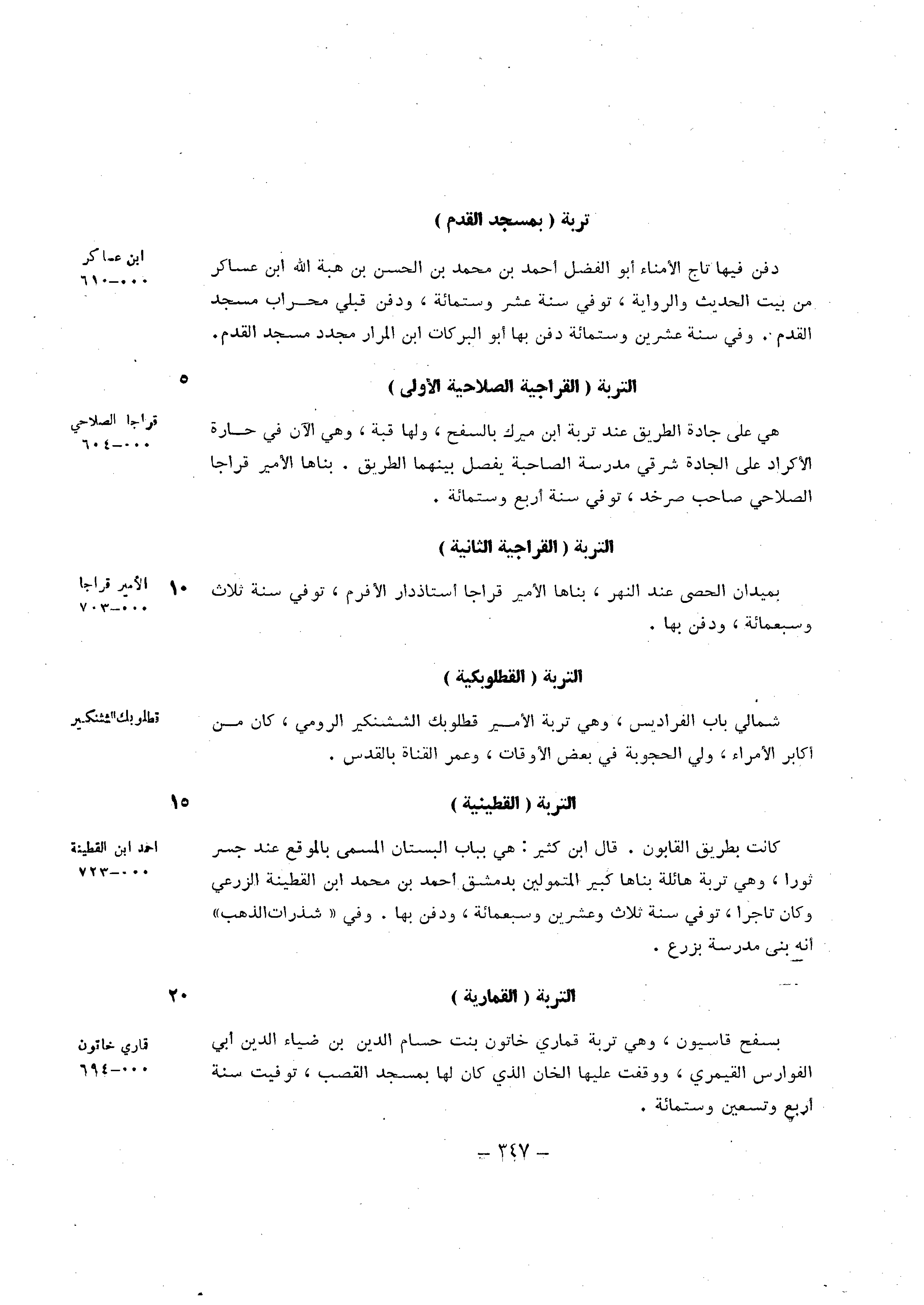 بسفح قاسيون وَهِي تربة قماري خاتون بنت حسام الدّين بن ضِيَاء الدّين أبي الفوارس القيمري ووقفت عَلَيْهَا الخان الَّذِي كَانَ لَهَا بِمَسْجِد الْقصب توفيت سنة أَربع وَتِسْعين وسِتمِائَة أَربع وَتِسْعين وسِتمِائَة