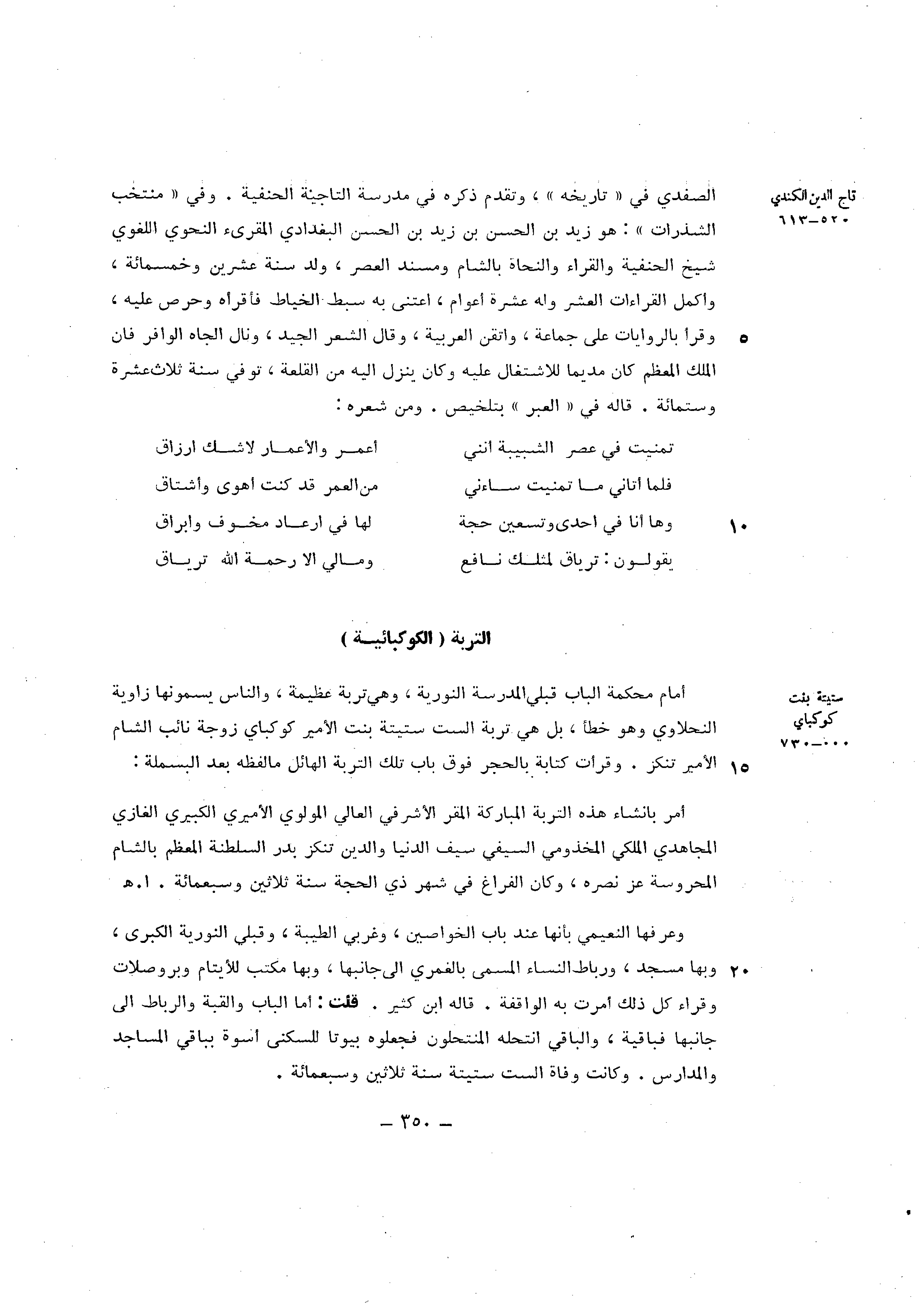 الصَّفَدِي فِي تَارِيخه وَتقدم ذكره فِي مدرسة التاجية الْحَنَفِيَّة وَفِي منتخب الشذرات هُوَ زيد بن الْحسن الْبَغْدَادِيّ الْمُقْرِئ النَّحْوِيّ اللّغَوِيّ شيخ الْحَنَفِيَّة والقراء والنحاة بِالشَّام ومسند الْعَصْر وَلَده سنة عشْرين وَخَمْسمِائة واكمل الْقرَاءَات الْعشْر وَله عشرَة أَعْوَام اعتنى بِهِ سبط الْخياط فأقراه وحرص عَلَيْهِ وقرا بالروايات على جمَاعَة واتقن الْعَرَبيَّة وَقَالَ الشّعْر الْجيد ونال الجاه الوافر فان الْملك الْمُعظم كَانَ مديما للاشتغال عَلَيْهِ وَكَانَ ينزل اليه من القلعة توفّي سنة ثَلَاث عشرَة وسِتمِائَة قَالَه فِي العبر بتلخيص وَمن شعره