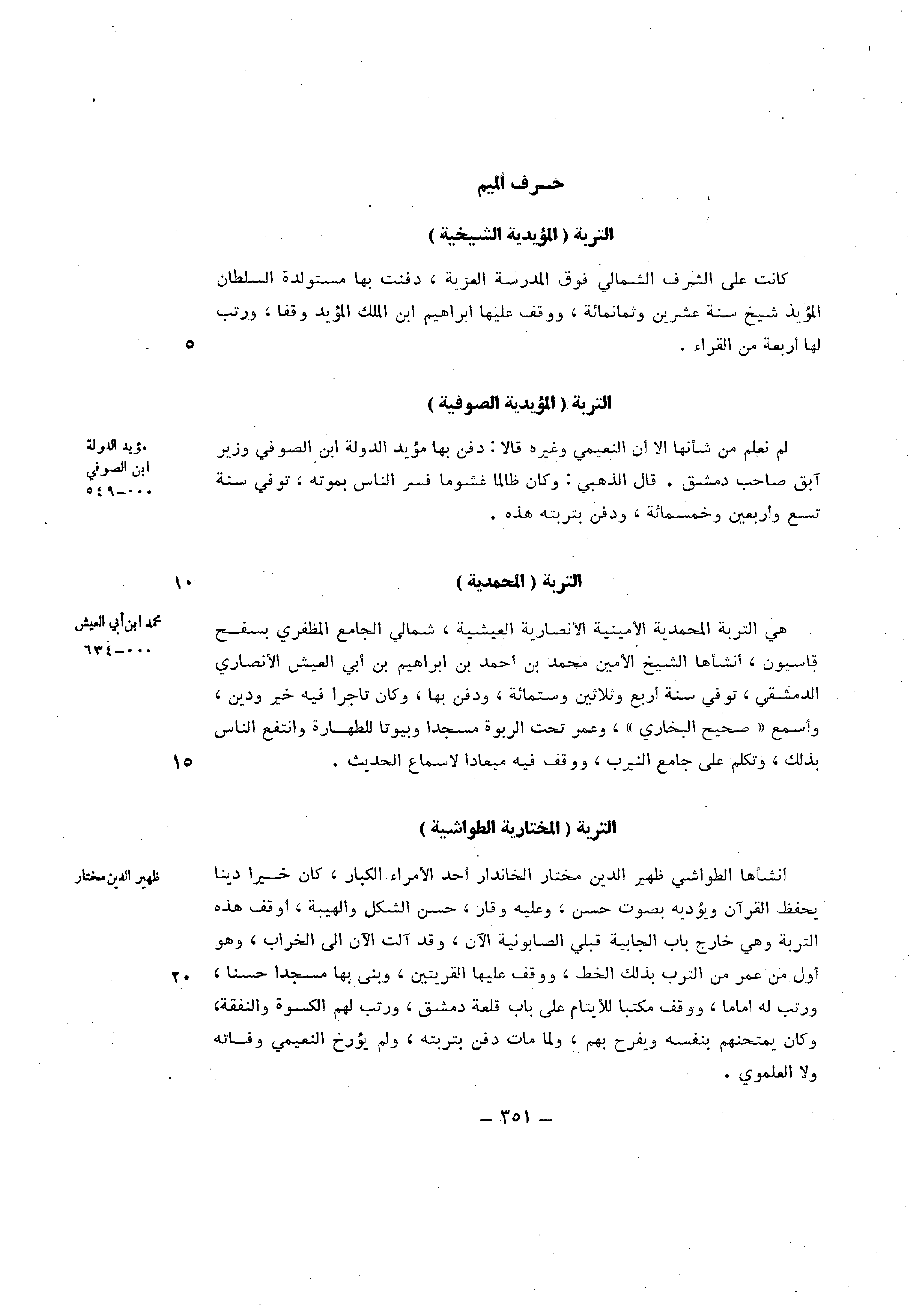 لم نعلم من شَأْنهَا أَلا أَن النعيمي وَغَيره قَالَا دفن بهَا مؤيد الدولة ابْن الصُّوفِي وَزِير آبق صَاحب دمشق قَالَ الذَّهَبِيّ وَكَانَ ظَالِما غشوما فسر النَّاس بِمَوْتِهِ توفّي سنة تسع وَأَرْبَعين وَخَمْسمِائة وَدفن بتربته هَذِه
