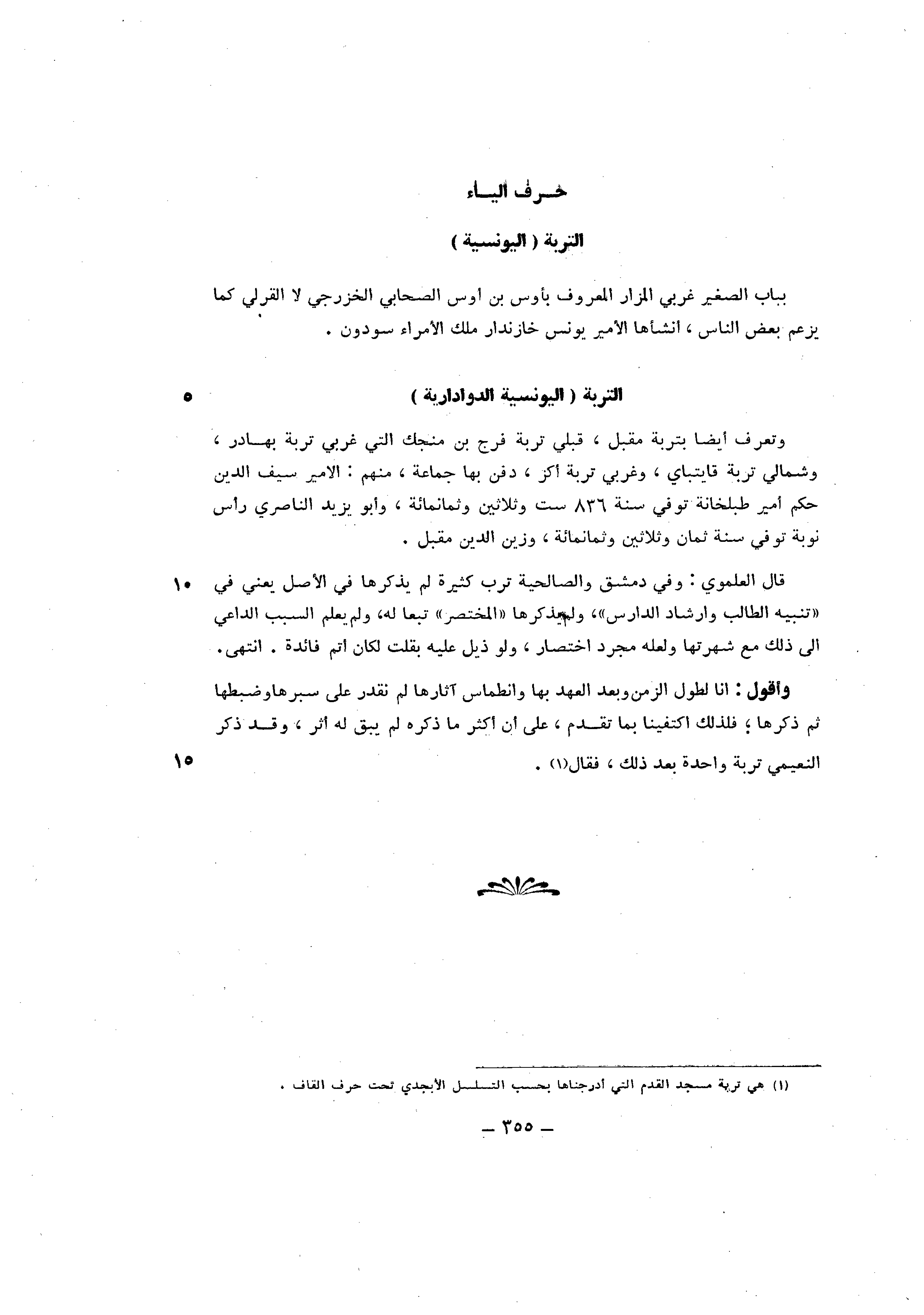 وَأَقُول انا لطول الزَّمن وَبعد الْعَهْد بِهِ وانطماس آثارها لم نقدر على سبرها وضبطها ثمَّ ذكرهَا فَلذَلِك اكتفينا بِمَا تقدم على أَن أَكثر مَا ذكره لم يبْق لَهُ أثر وَقد ذكر النعيمي تربة وَاحِدَة بعد ذَلِك فَقَالَ